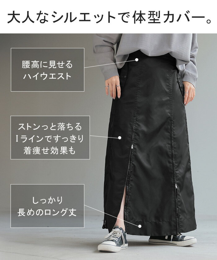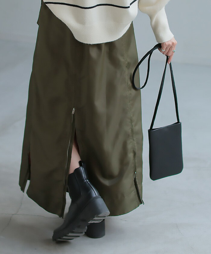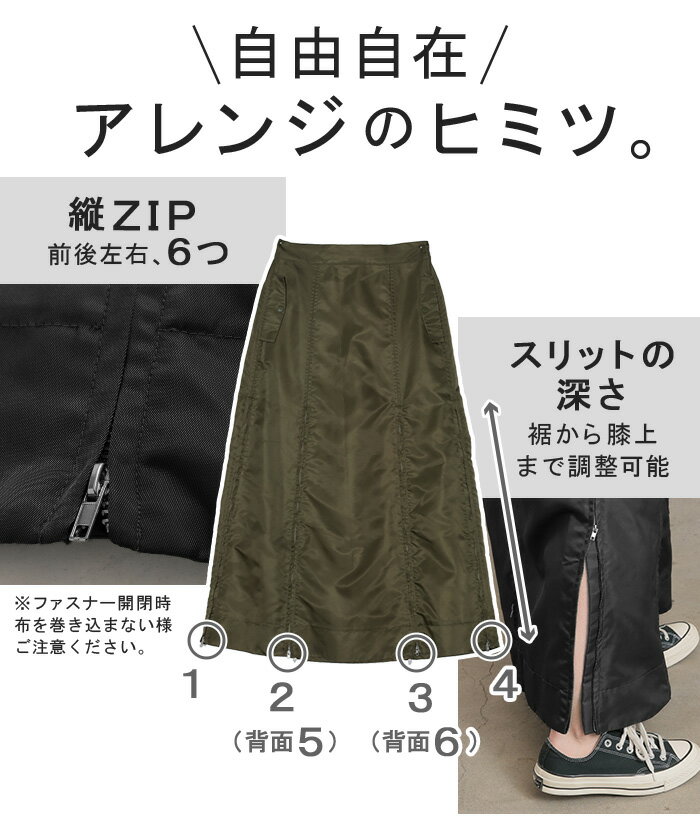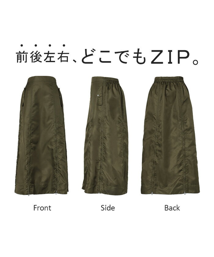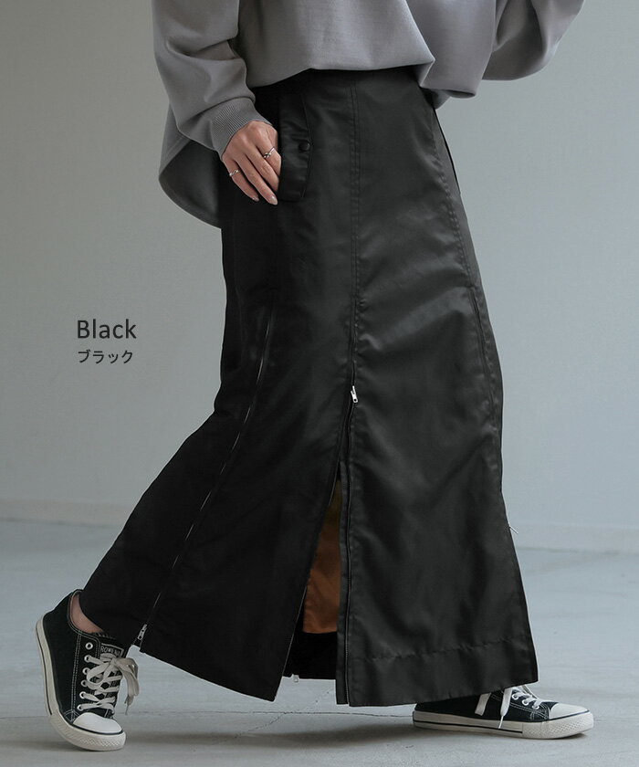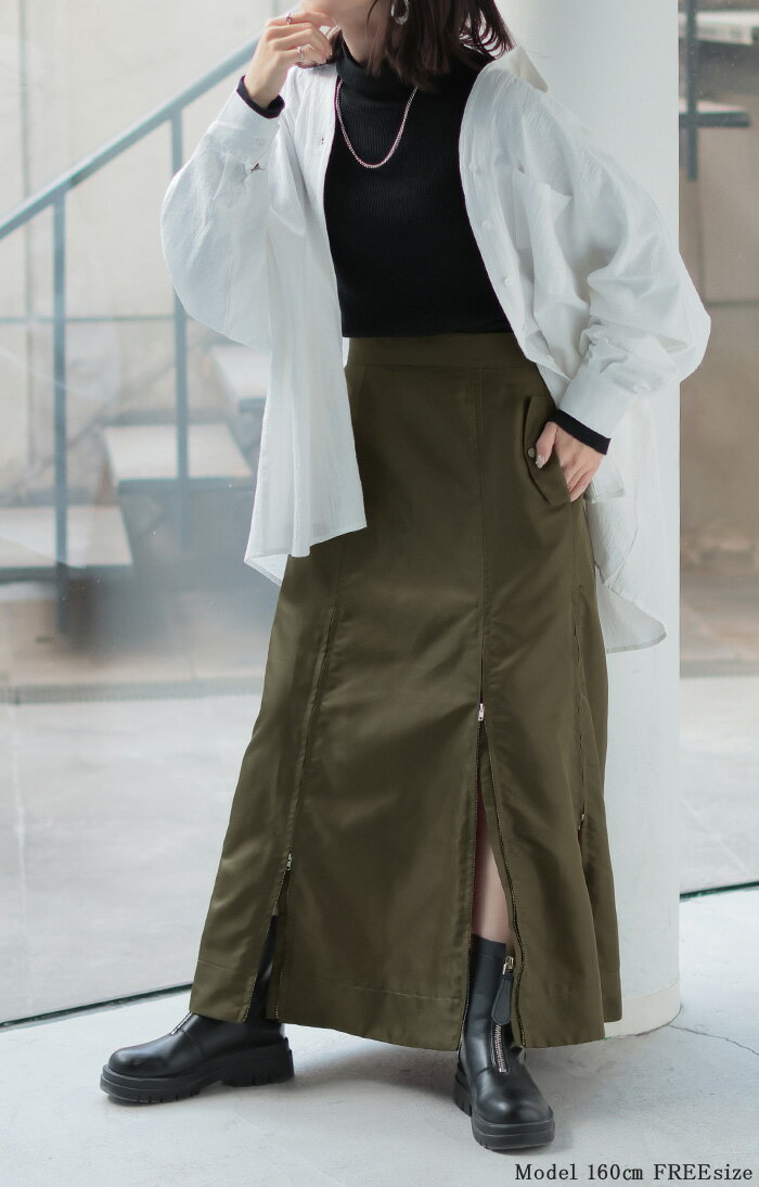 スカート MA-1 ロング ■1月中旬入荷予定 レディース ボトムス ロングスカート フレア フレアスカート マキシ マキシスカート ハイウエスト Iライン ジップ スリット 体型カバー 大きいサイズ 無地 ゆったり ミリタリー カジュアル モード カーキ 黒 秋 冬 HUG.U