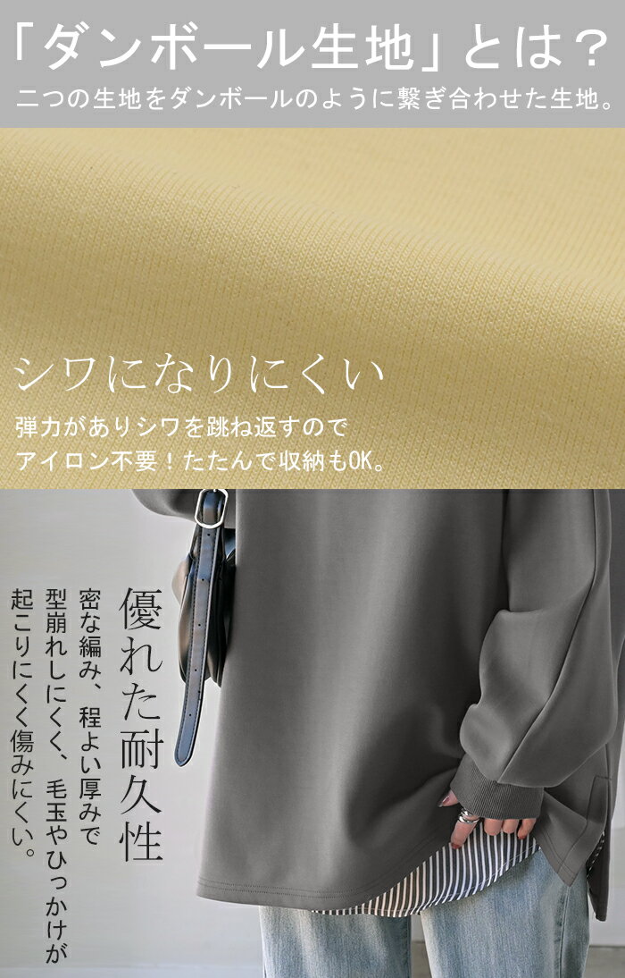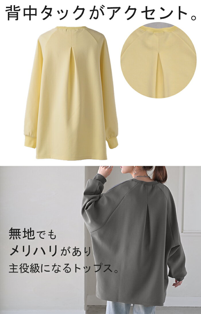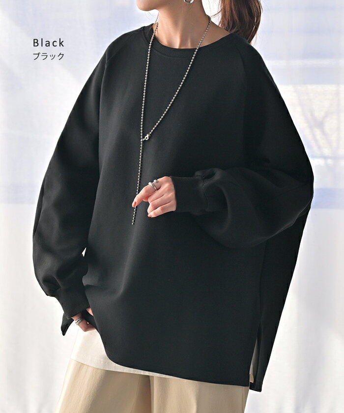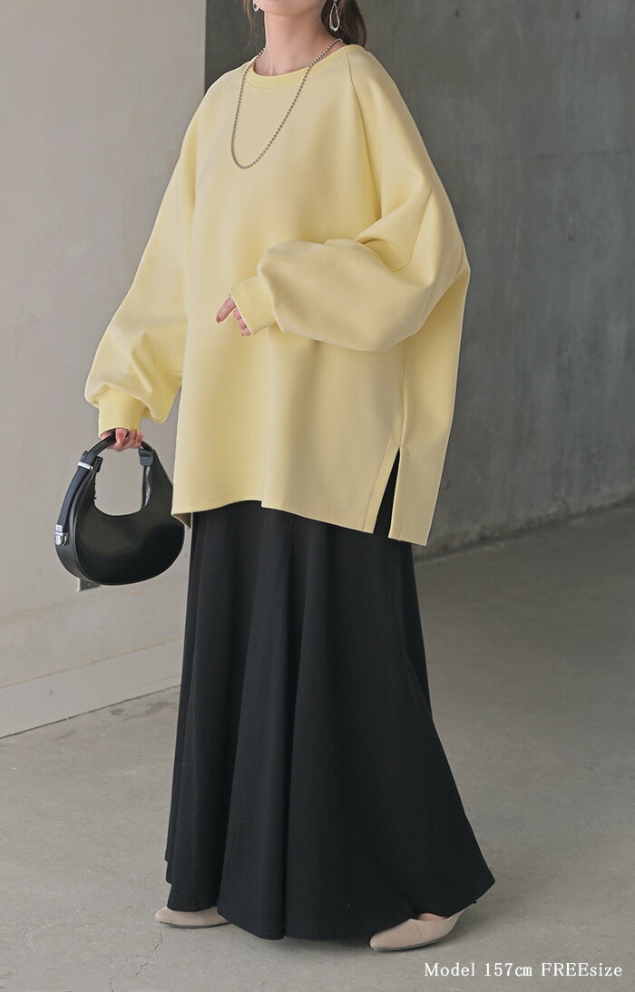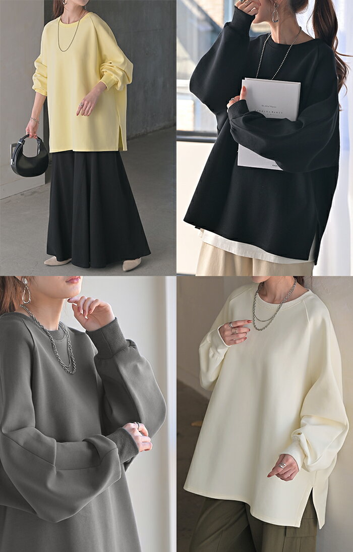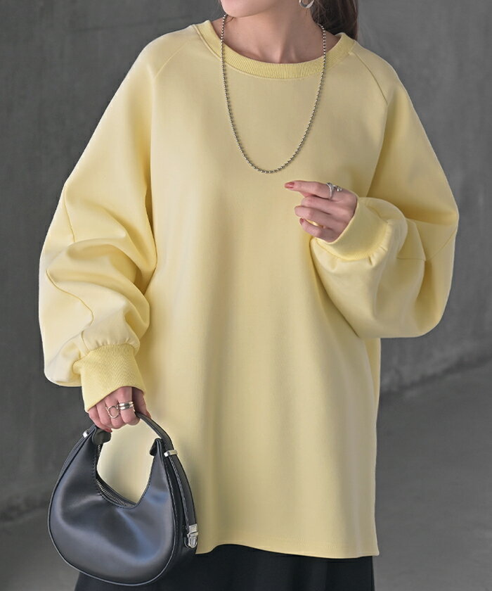 スウェット ダンボール チュニック 【即納】 シワになりにくい トップス レディース トレーナー プルオーバー 無地 長袖 長い ドルマン クルーネック ボリュームスリーブ オーバーサイズ 体型カバー 大きいサイズ お尻が隠れる 黒 イエロー 春 冬 HUG.U