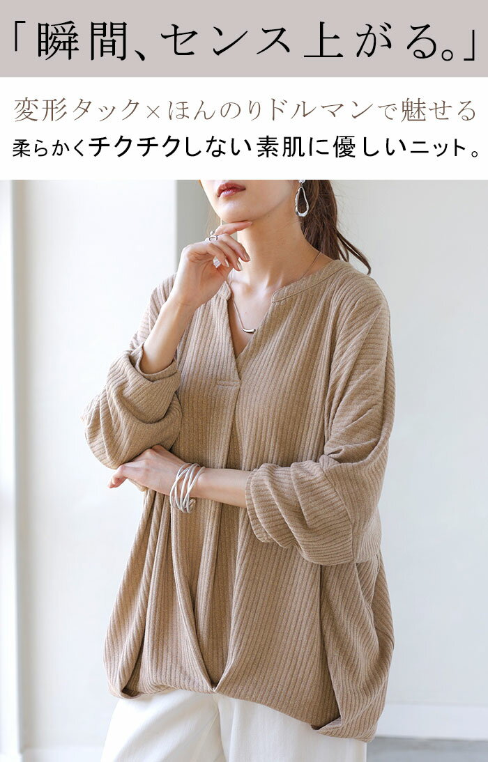 ロンT キーネック カットソー ■4月中旬入荷 レディース トップス リブ スキッパー ロング オーバー プルオーバー 長袖 長い ボリュームスリーブ Vネック チュニック 変形シルエット ドルマン ゆったり 体型カバー 大きいサイズ お尻が隠れる 黒 春 夏 HUG.U