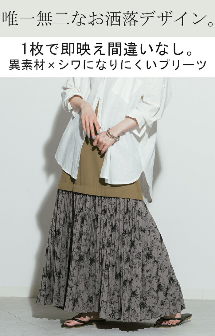 アウトレット 【即納】 スカート プリーツ プリーツスカート レディース ロングスカート ロング マキシ マキシスカート フレアスカート 花柄 タイダイ ゴム Aライン レイヤード 重ね着 体型カバー 大きいサイズゴム きれいめ 黒 ブラック カーキ 白 ホワイト 春 夏 HUG.U