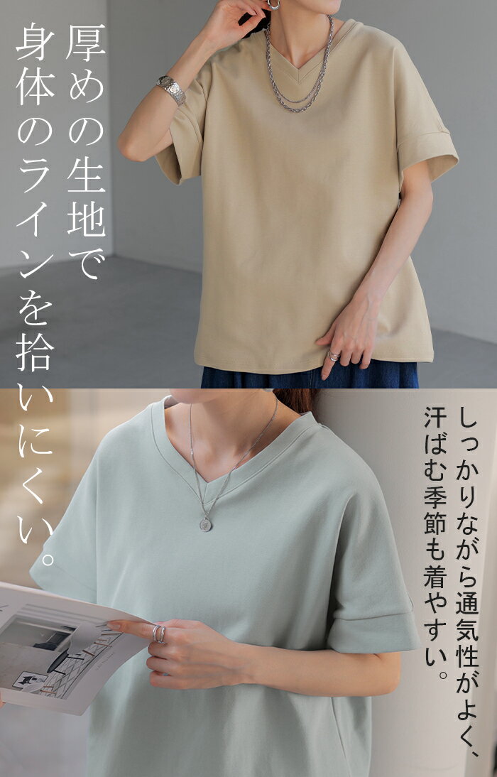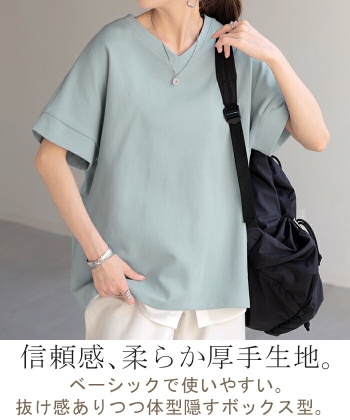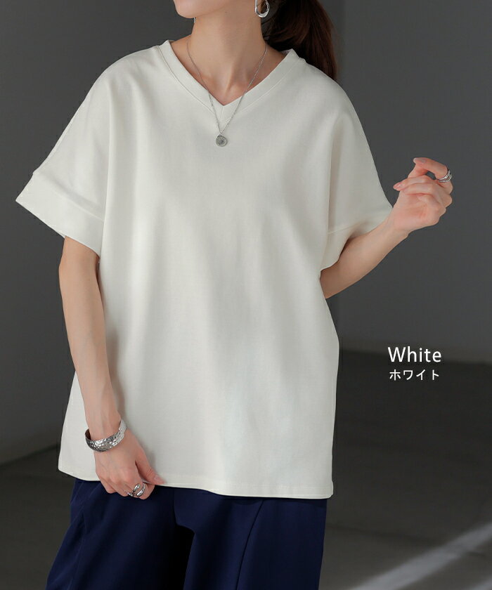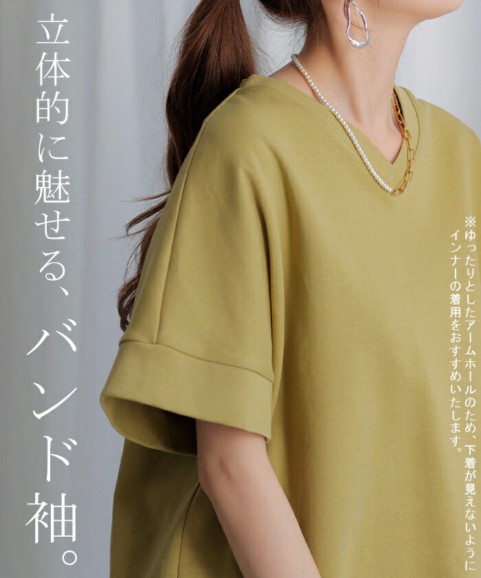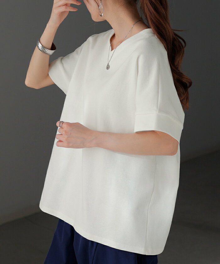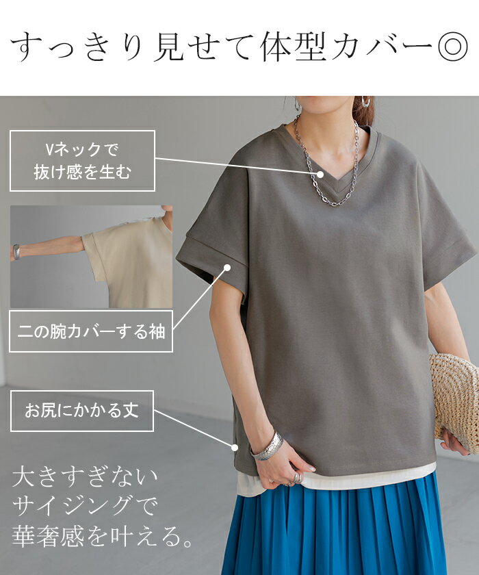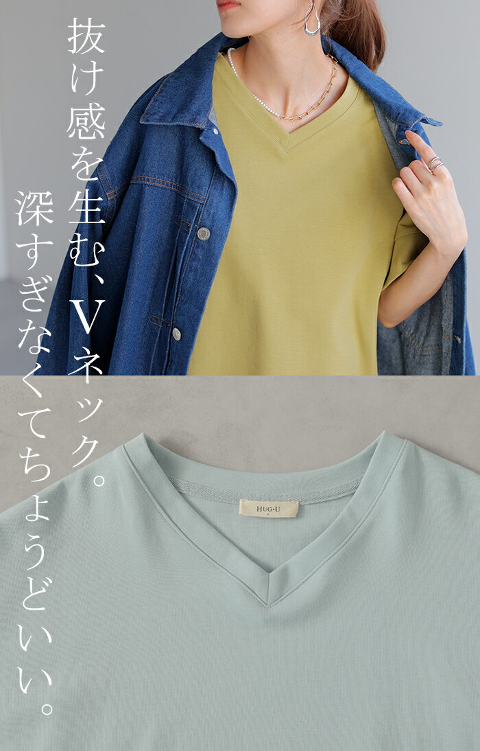 Tシャツ レディース トップス 綿 混 【即納】 カットソー オーバーサイズ ティーシャツ ロング 二の腕カバー バンド袖 Vネック ビッグ プルオーバー 体型カバー 半袖 ゆる 大きいサイズ ロング ゆったり 無地 ストレッチ きれいめ 白 黒 春 夏 HUG.U