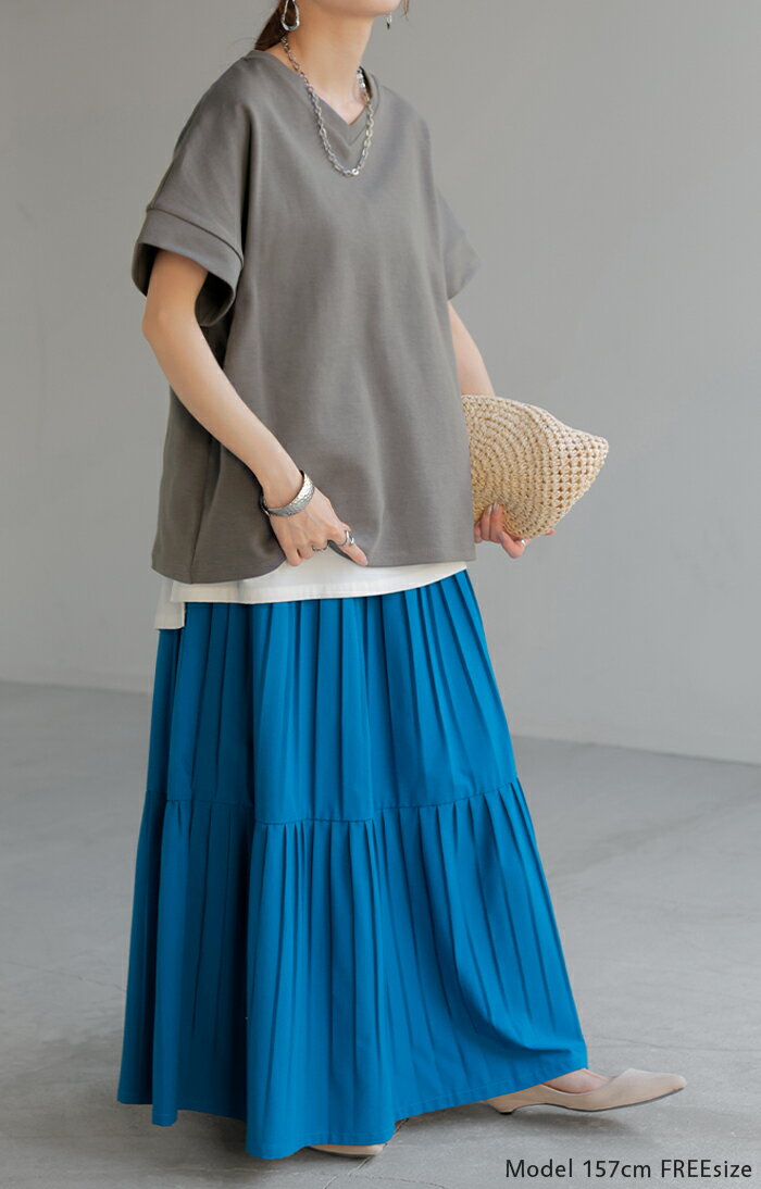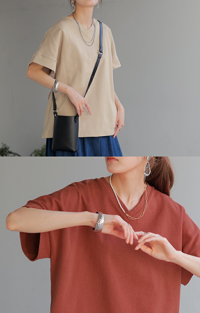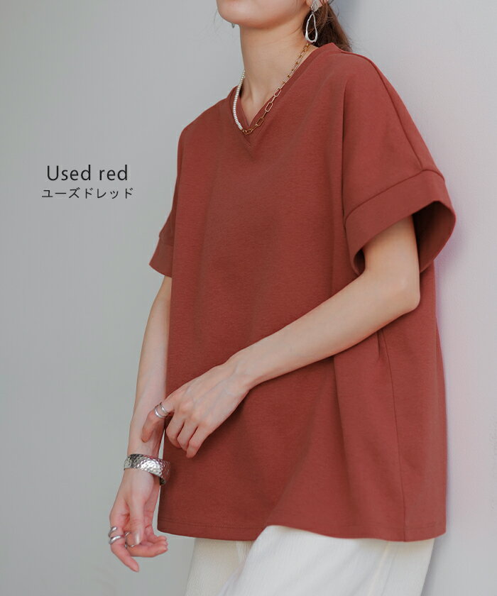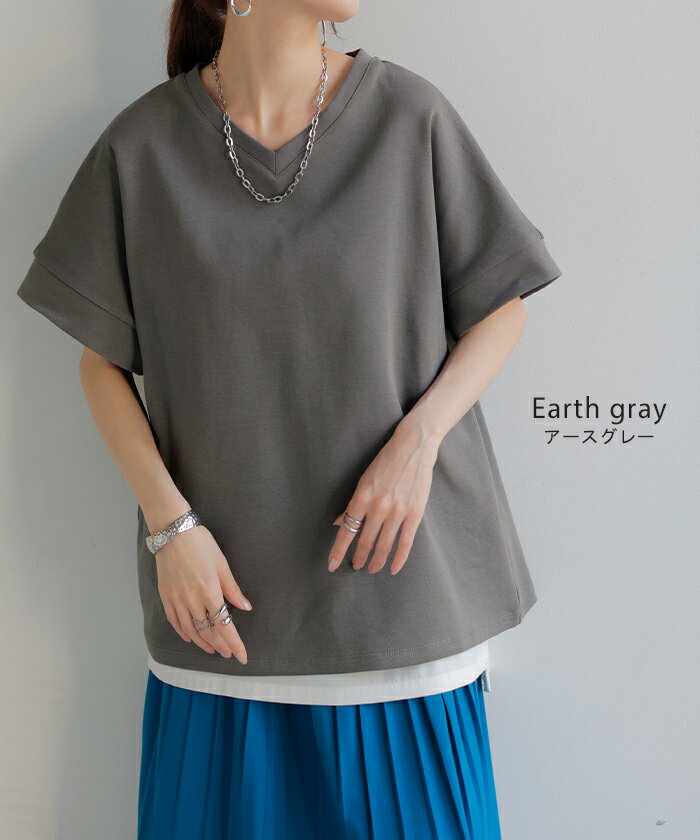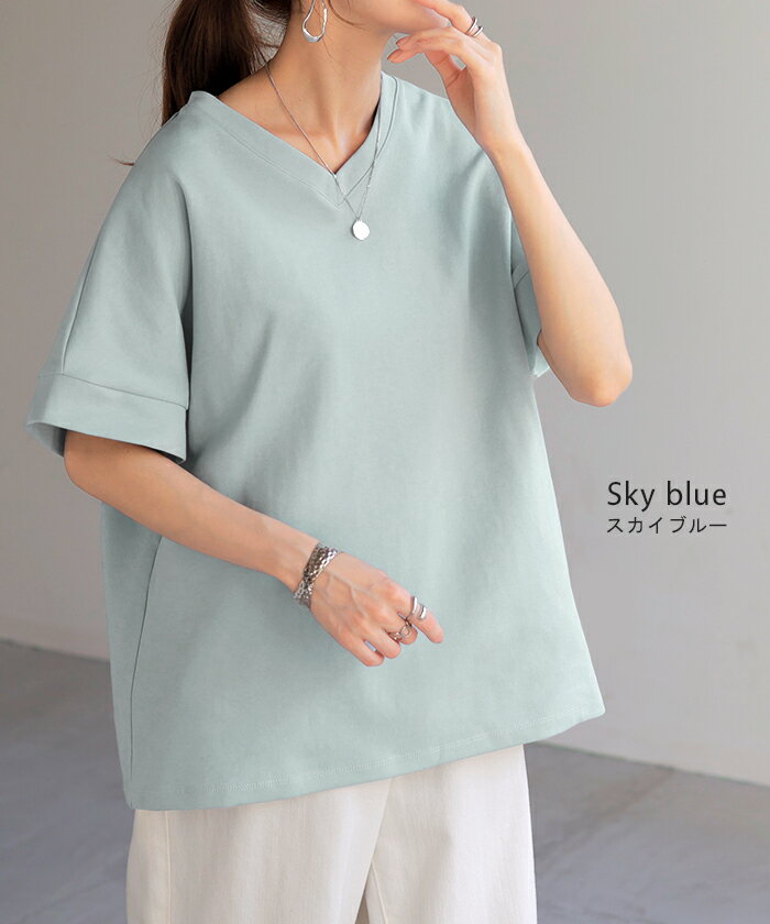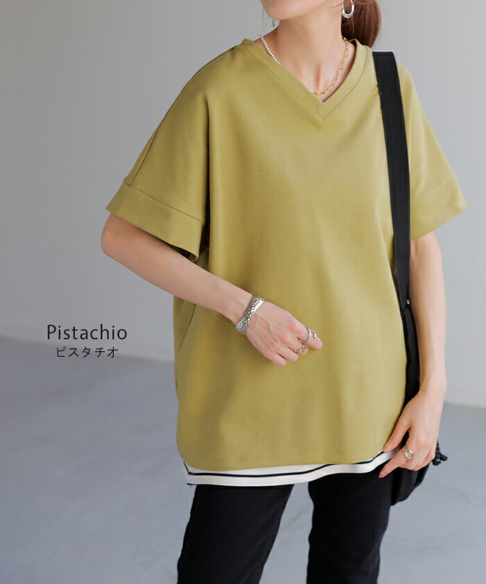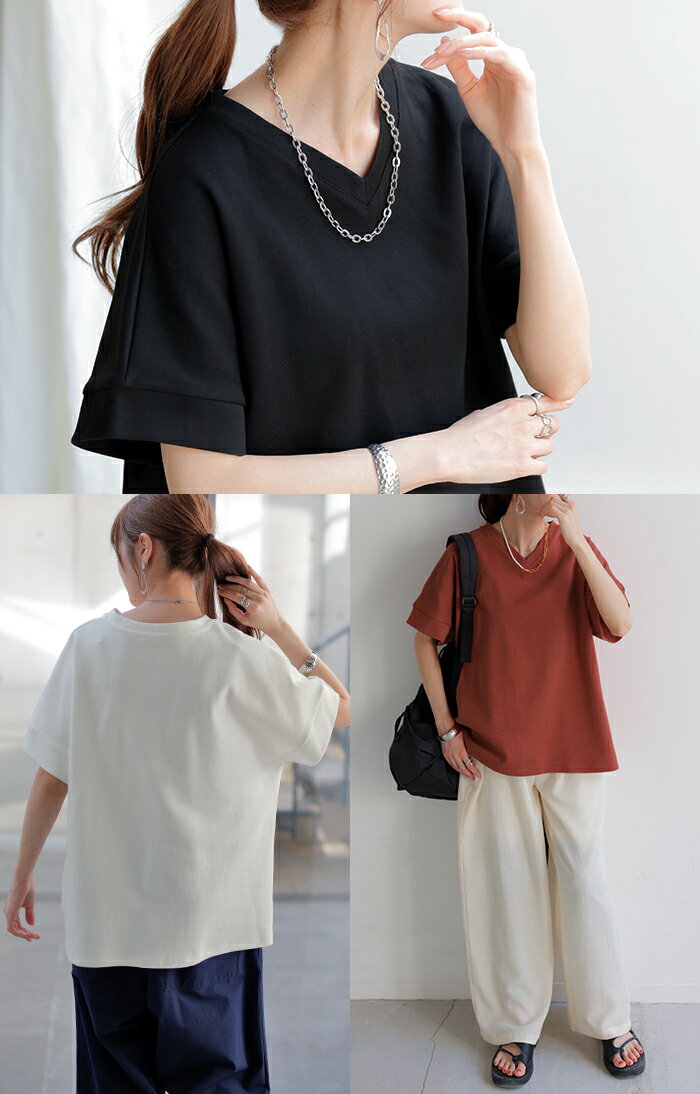 Tシャツ レディース トップス 綿 混 【即納】 カットソー オーバーサイズ ティーシャツ ロング 二の腕カバー バンド袖 Vネック ビッグ プルオーバー 体型カバー 半袖 ゆる 大きいサイズ ロング ゆったり 無地 ストレッチ きれいめ 白 黒 春 夏 HUG.U