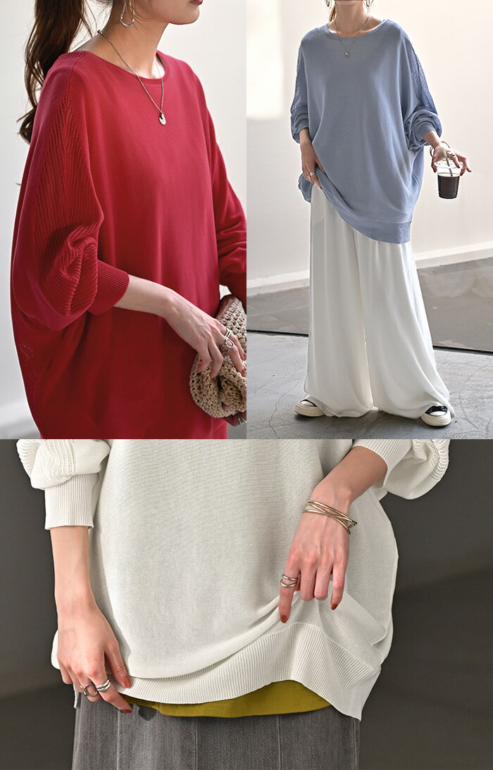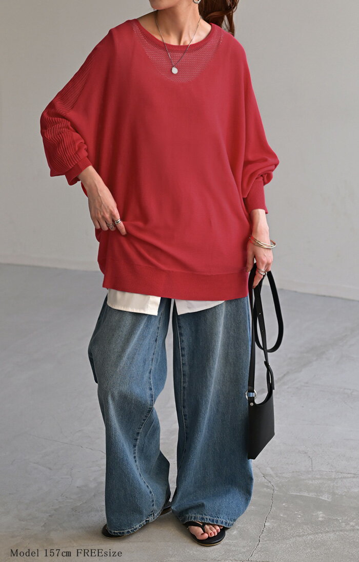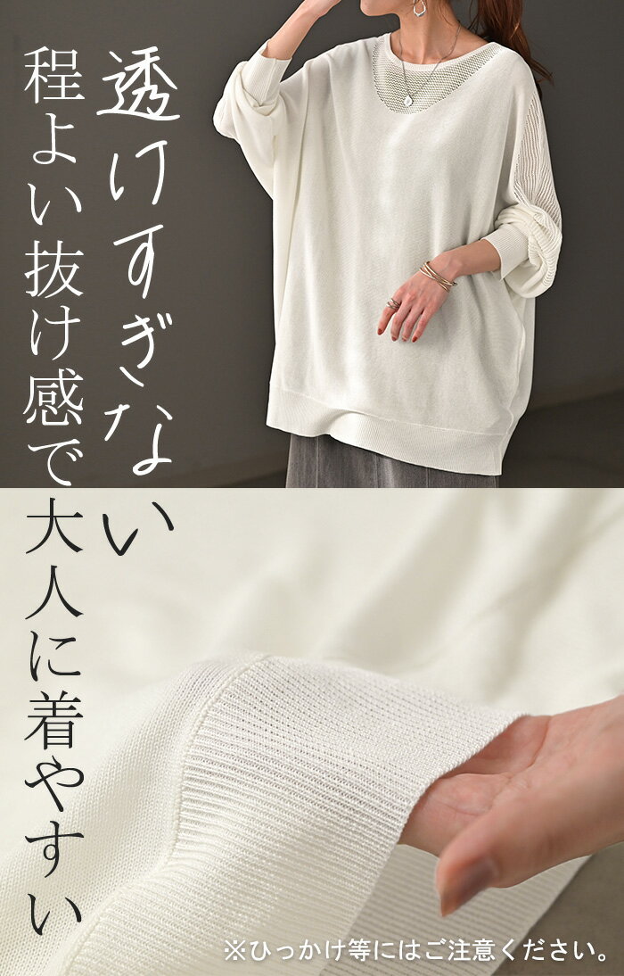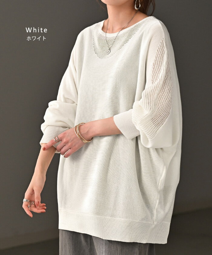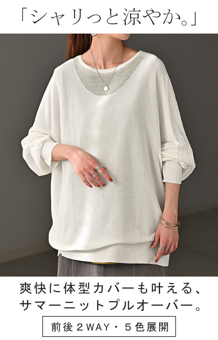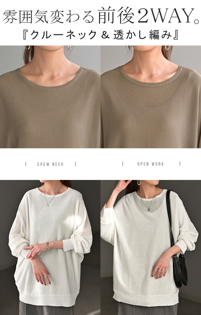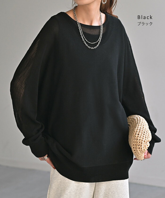 ニット 前後2WAY サマーニット 【即納】 レディース トップス セーター オーバー 透かし編み 涼しい メッシュ プルオーバー ロング 長袖 長い レイヤード 薄手 シアー チュニック ドルマン ゆったり 大きいサイズ 体型カバー お尻が隠れる 黒 春 夏 HUG.U