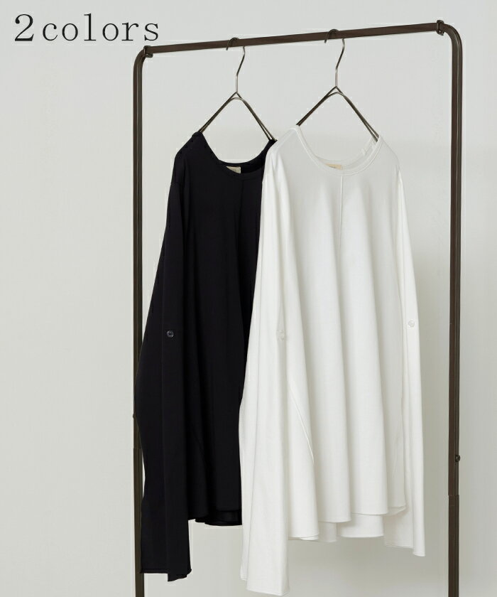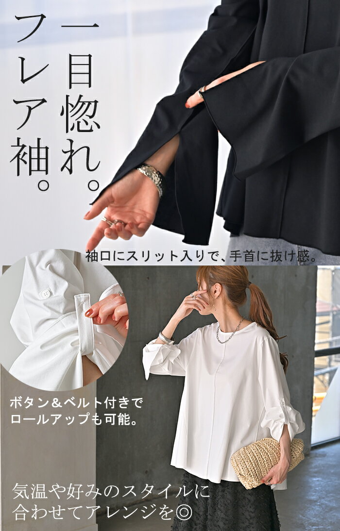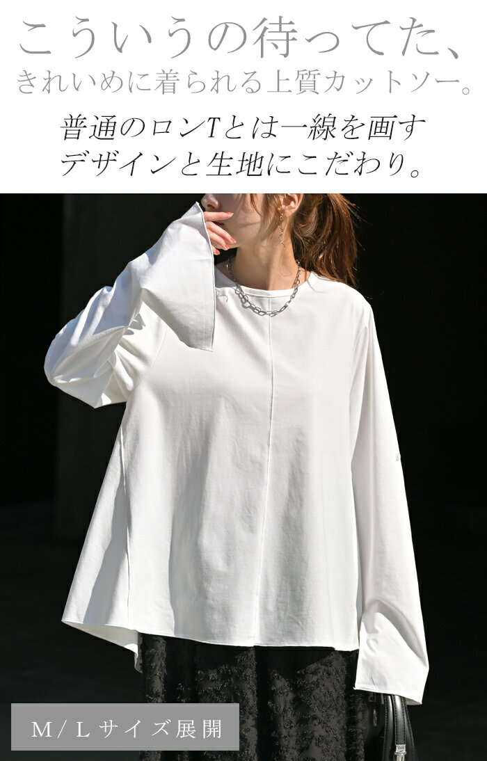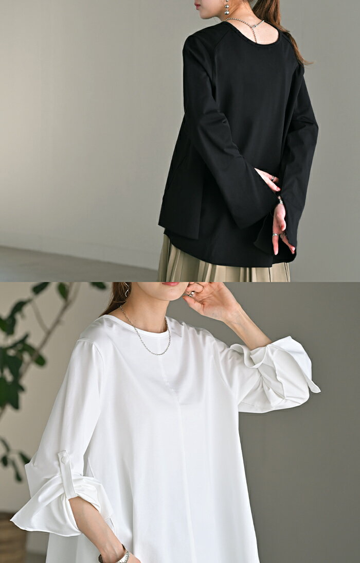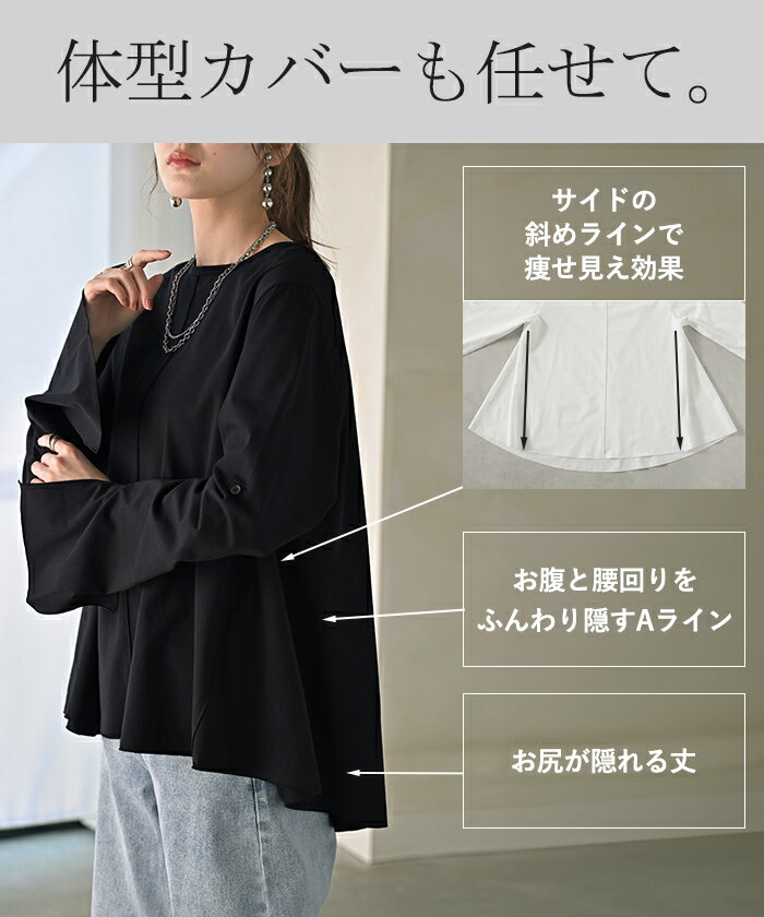 ロンT レディース ブラウス 【即納】 トップス 長袖 Tシャツ カットソー ロング フレア袖 ティーシャツ チュニック ビッグ プラスサイズ クルーネック 長い ドルマン ゆったり 無地 体型カバー お尻が隠れる 大きいサイズ おしゃれ 白 黒 春 夏 HUG.U