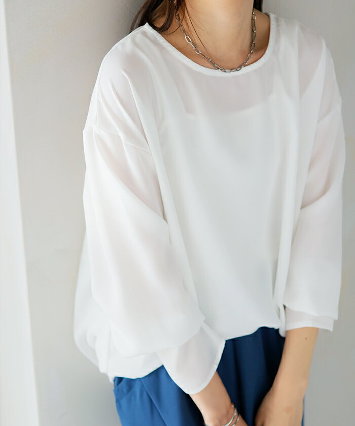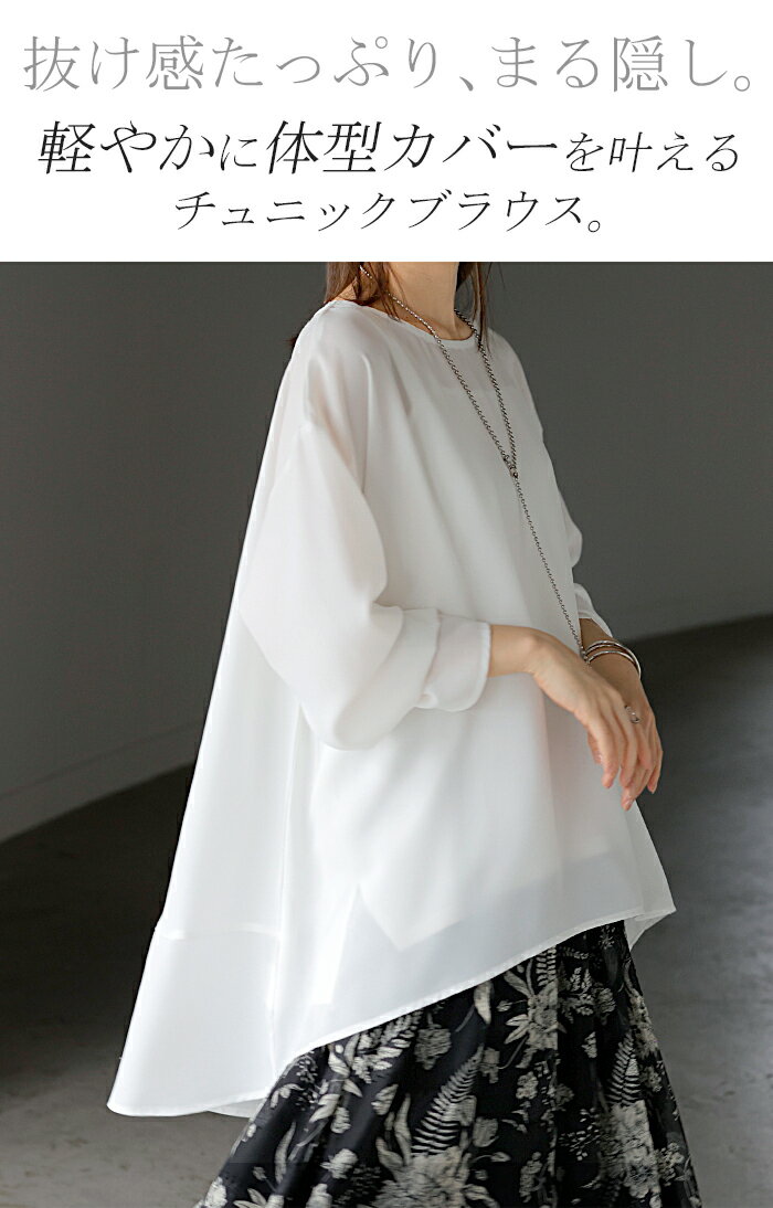シャツ シアー シフォン ノーカラー ■一部5月上旬入荷 トップス レディース Aライン クルーネック ブラウス ロング ロングシャツ チュニック 長袖 無地 きれいめ ゆったり 大きいサイズ 体型カバー お尻が隠れる オフィスカジュアル 通勤 黒 白 春 夏 HUG.U