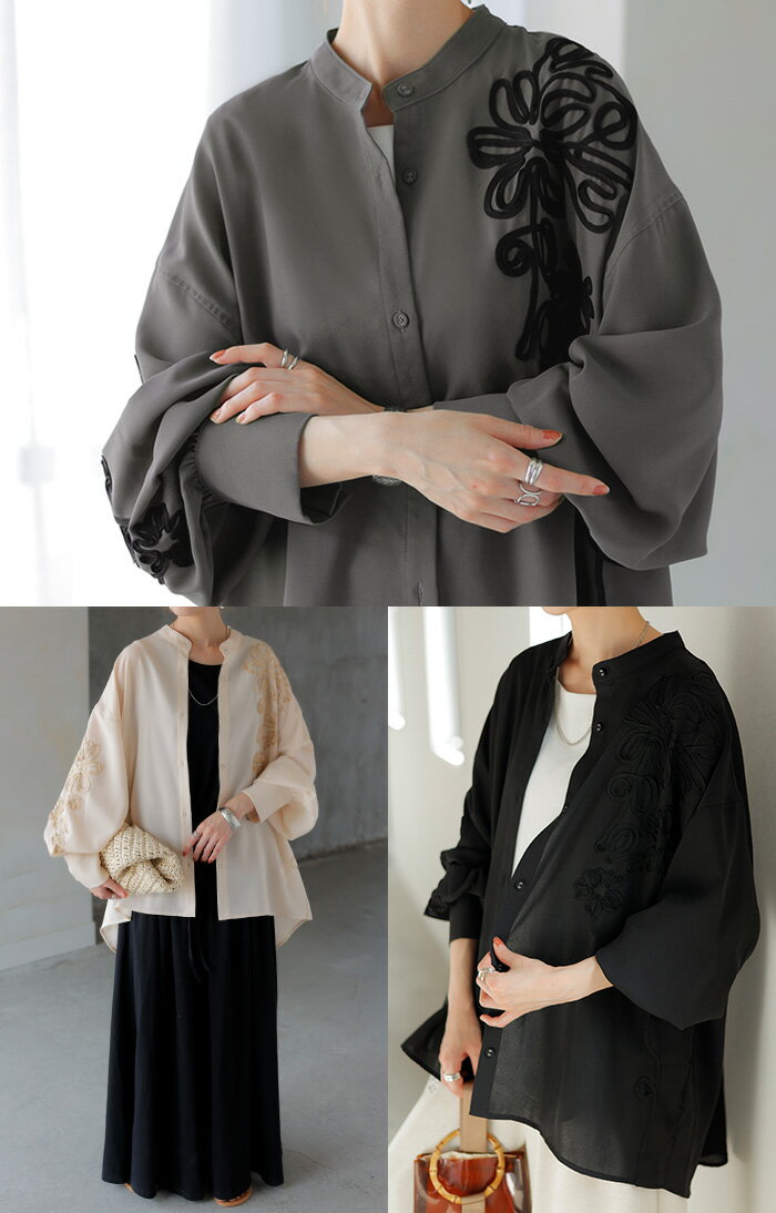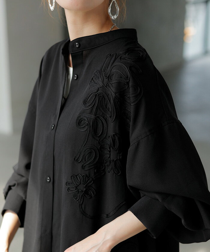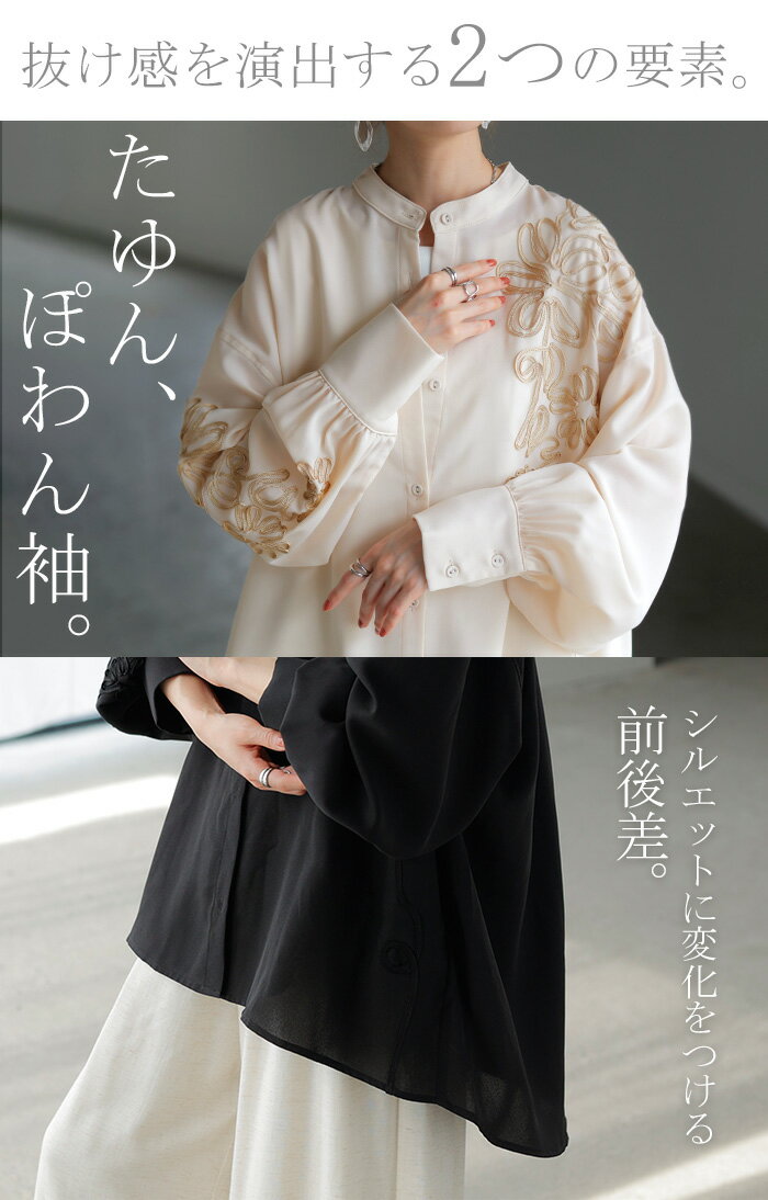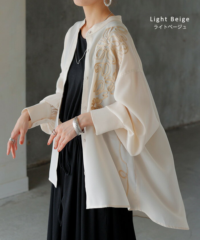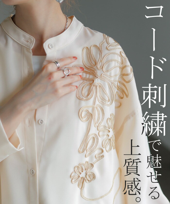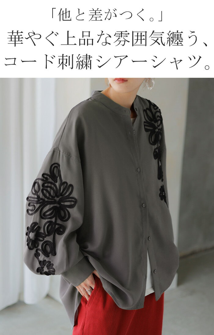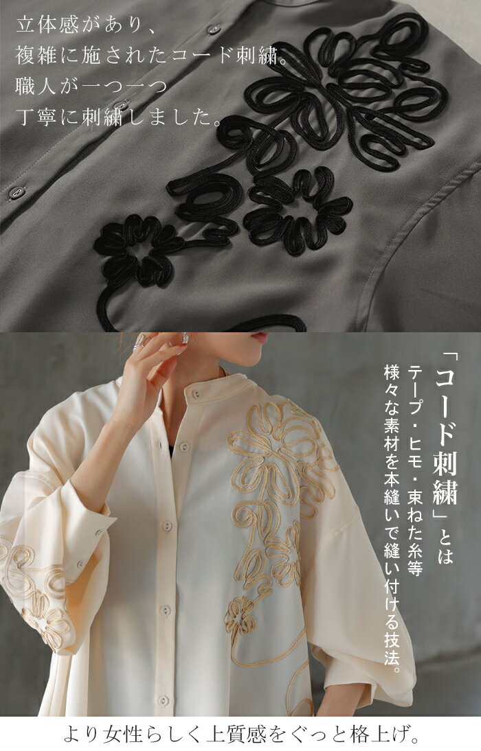 シャツ コード刺繍 シアー 【即納】 トップス レディース 刺繍 ノーカラー バンドカラー ブラウス ロング ロングシャツ チュニック 長袖 無地 羽織 ライトアウター 上品 きれいめ ゆったり 大きいサイズ 体型カバー お尻が隠れる 黒 ベージュ 春 夏 HUG.U
