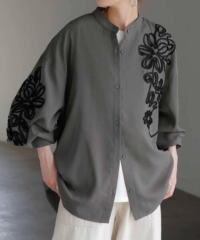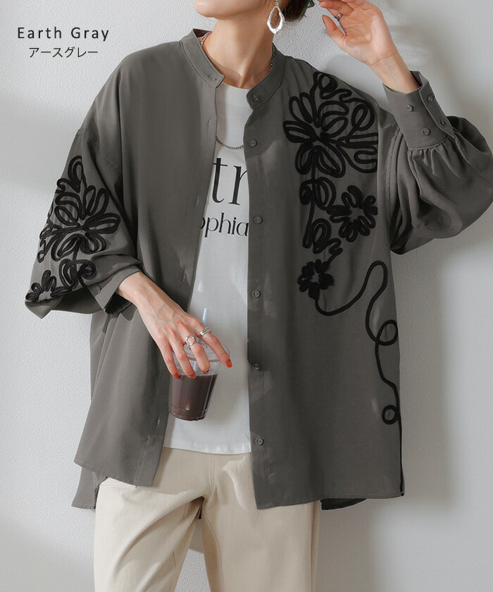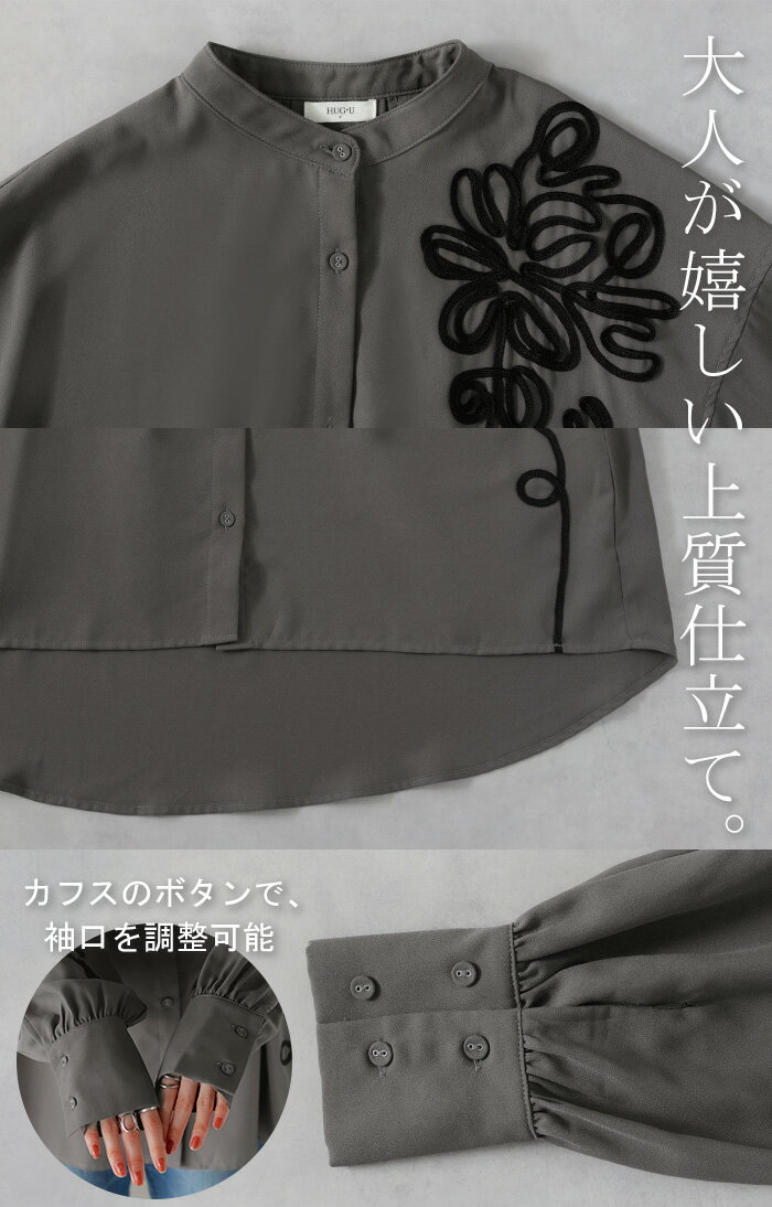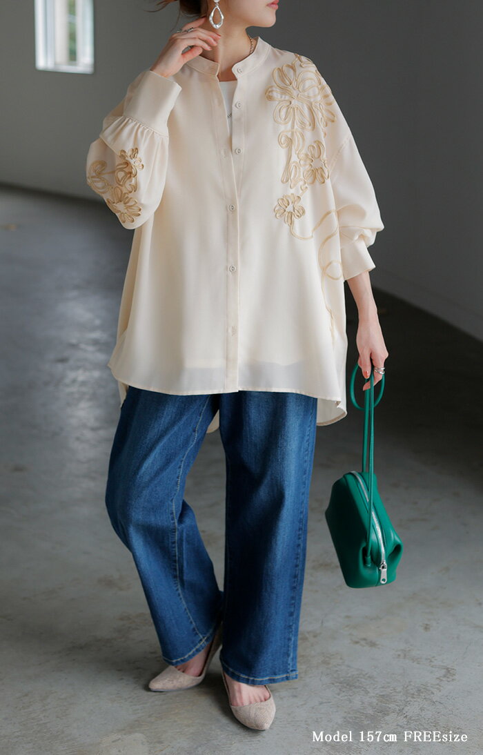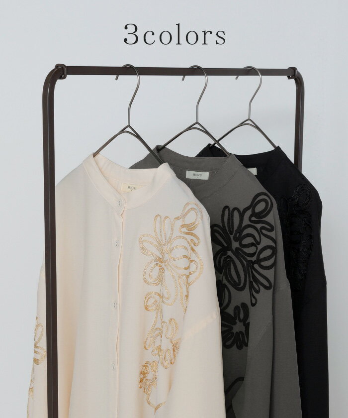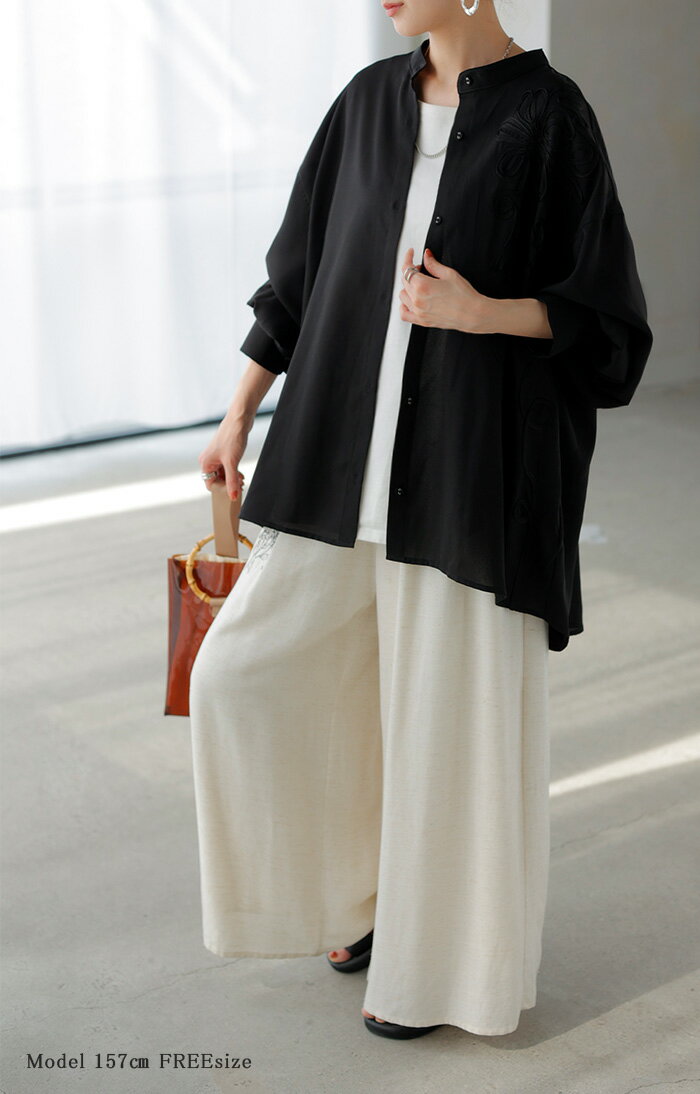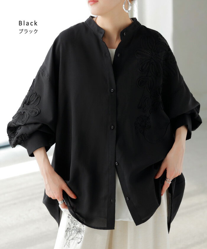 シャツ コード刺繍 シアー 【即納】 トップス レディース 刺繍 ノーカラー バンドカラー ブラウス ロング ロングシャツ チュニック 長袖 無地 羽織 ライトアウター 上品 きれいめ ゆったり 大きいサイズ 体型カバー お尻が隠れる 黒 ベージュ 春 夏 HUG.U