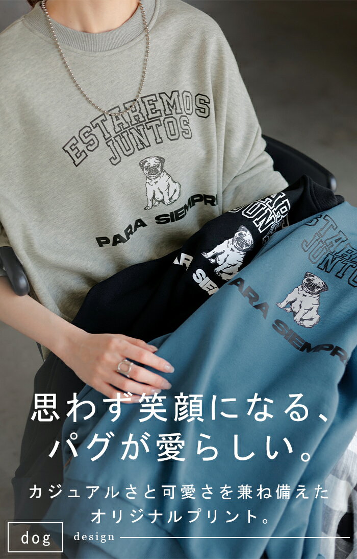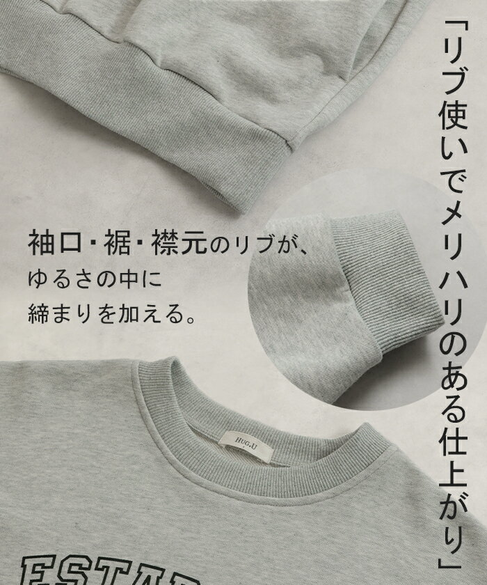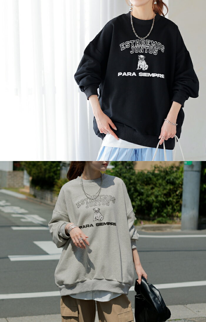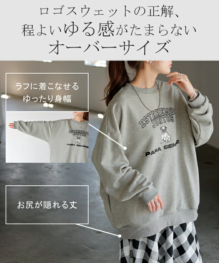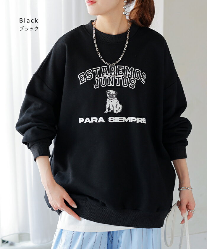 スウェット ロゴ チュニック レディース ■5月中旬入荷 トップス ロング トレーナー オーバー プルオーバー 無地 犬 パグ 長袖 長い ドルマン クルーネック リブ オーバーサイズ ゆったり 体型カバー 大きいサイズ お尻が隠れる カジュアル 黒 グレー HUG.U