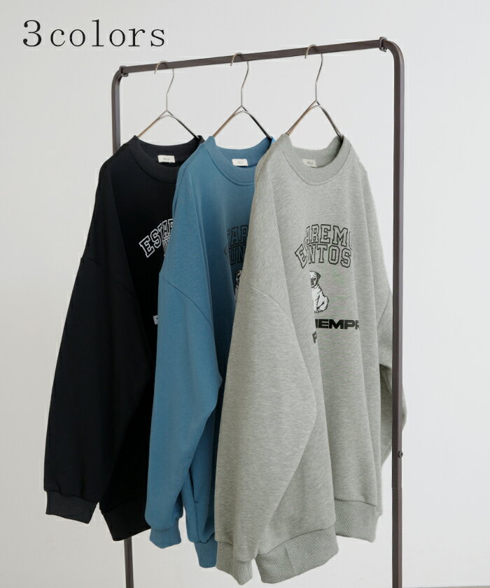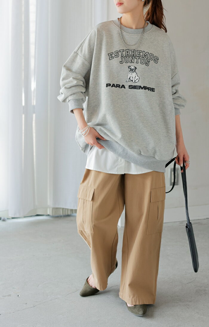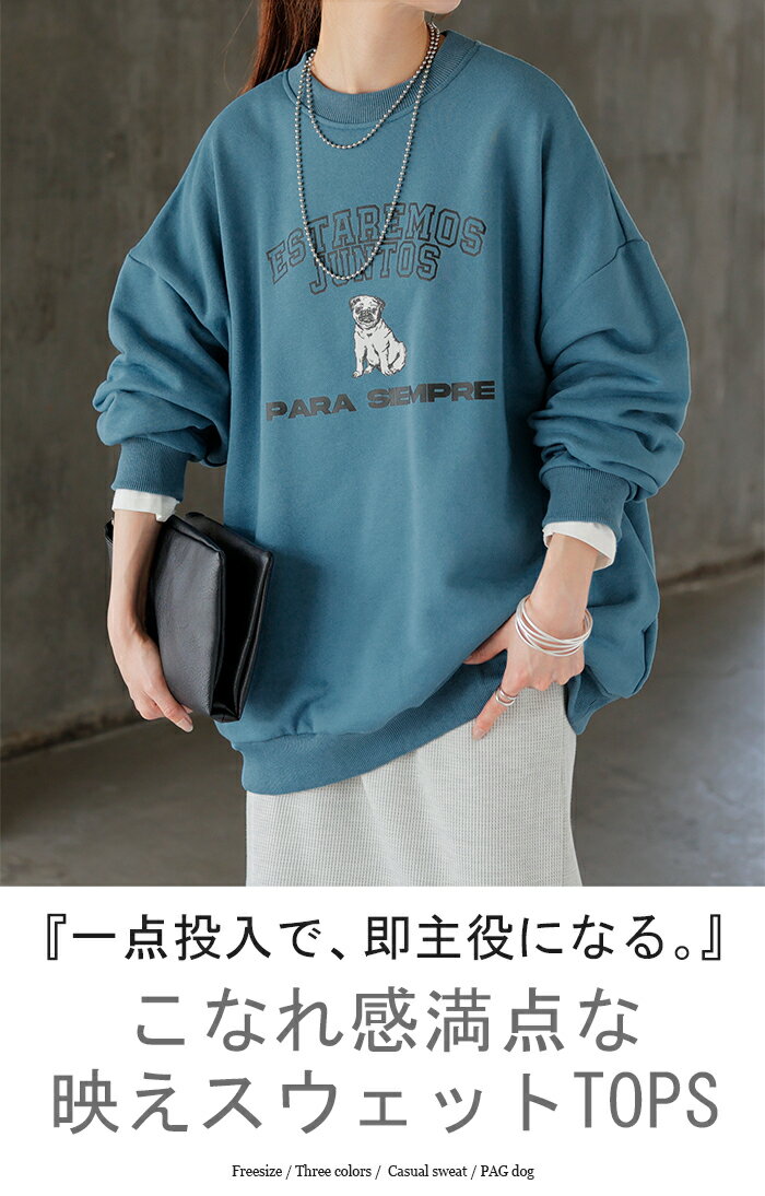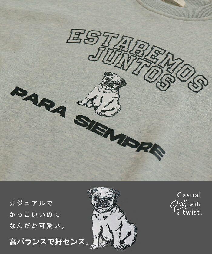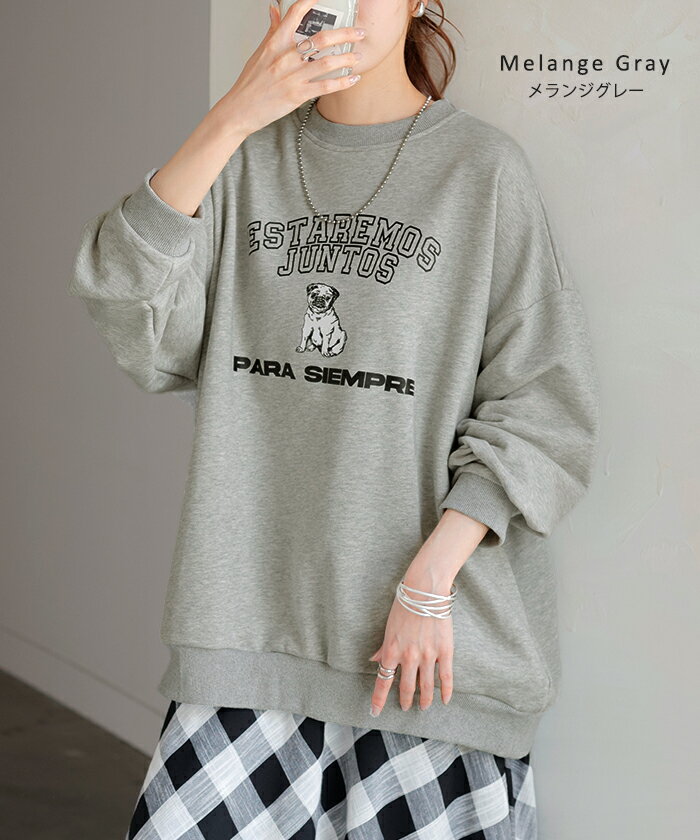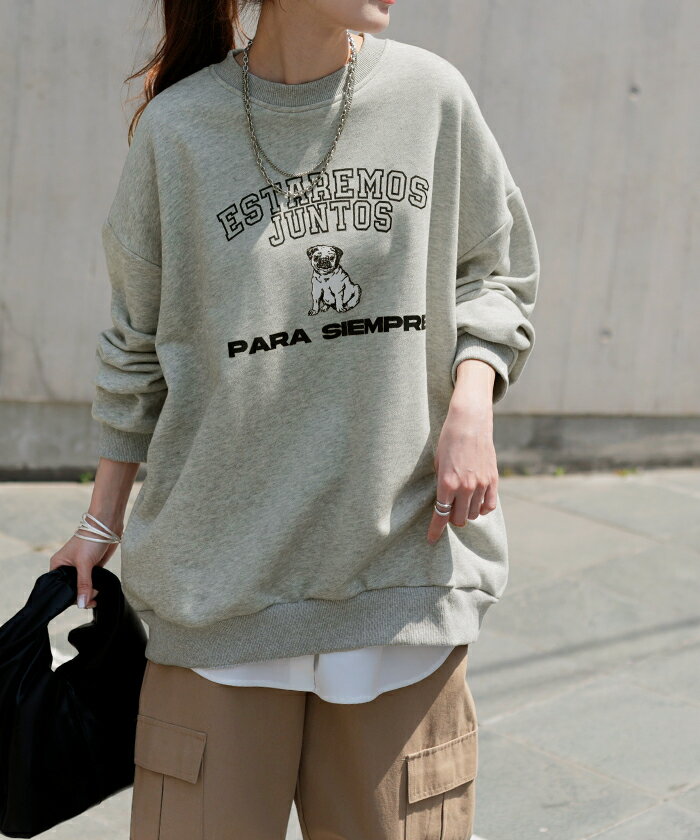 スウェット ロゴ チュニック レディース ■5月中旬入荷 トップス ロング トレーナー オーバー プルオーバー 無地 犬 パグ 長袖 長い ドルマン クルーネック リブ オーバーサイズ ゆったり 体型カバー 大きいサイズ お尻が隠れる カジュアル 黒 グレー HUG.U