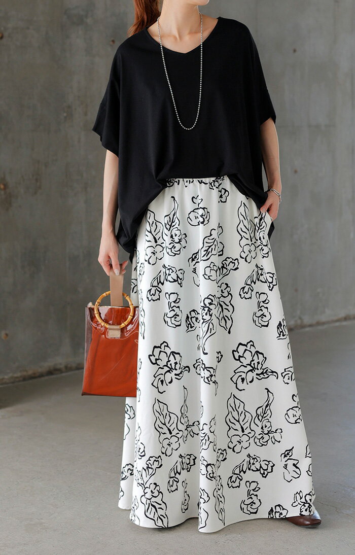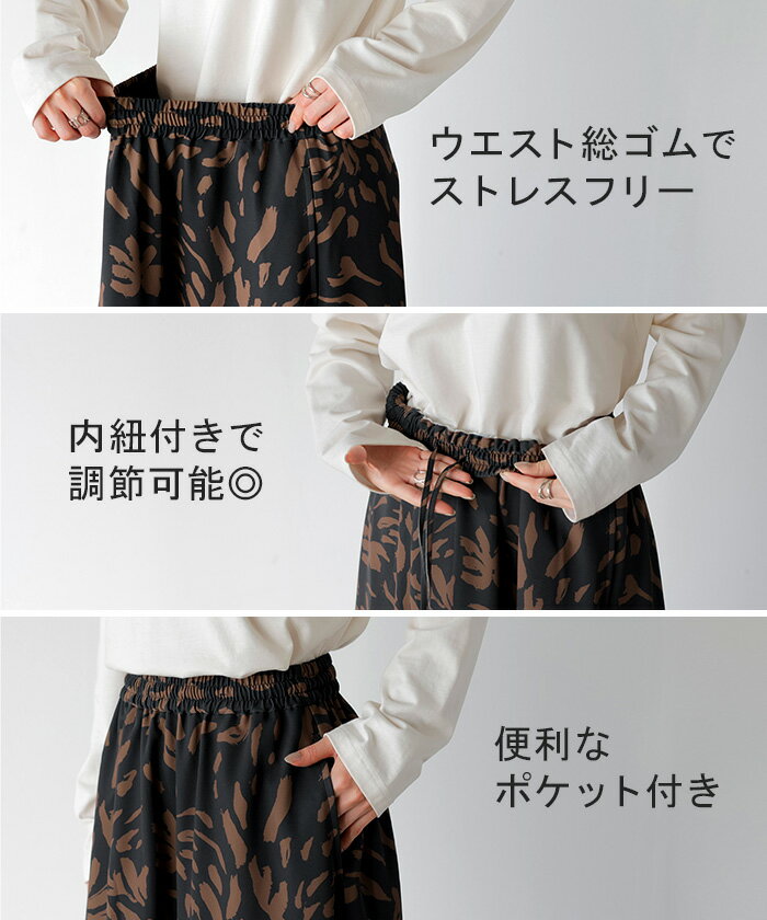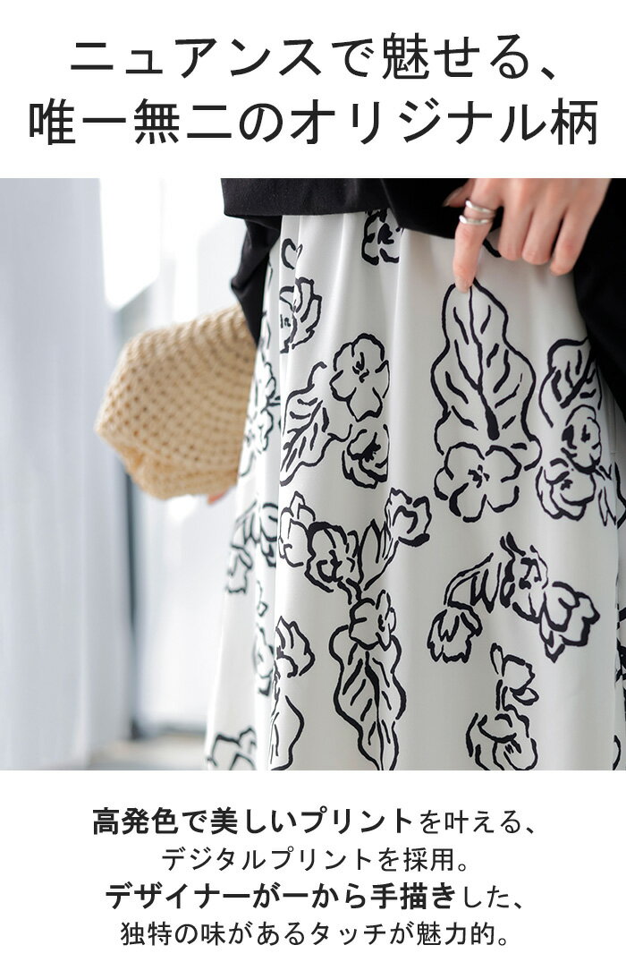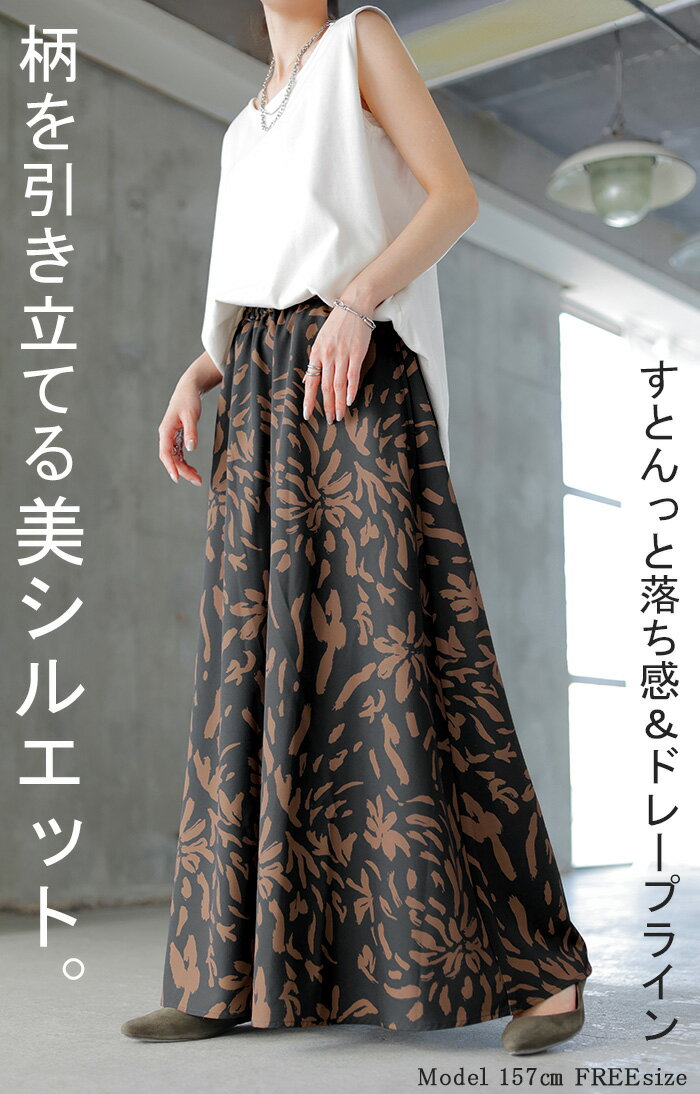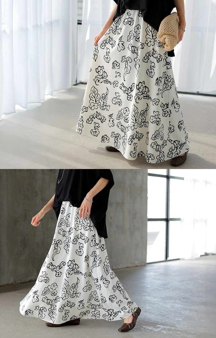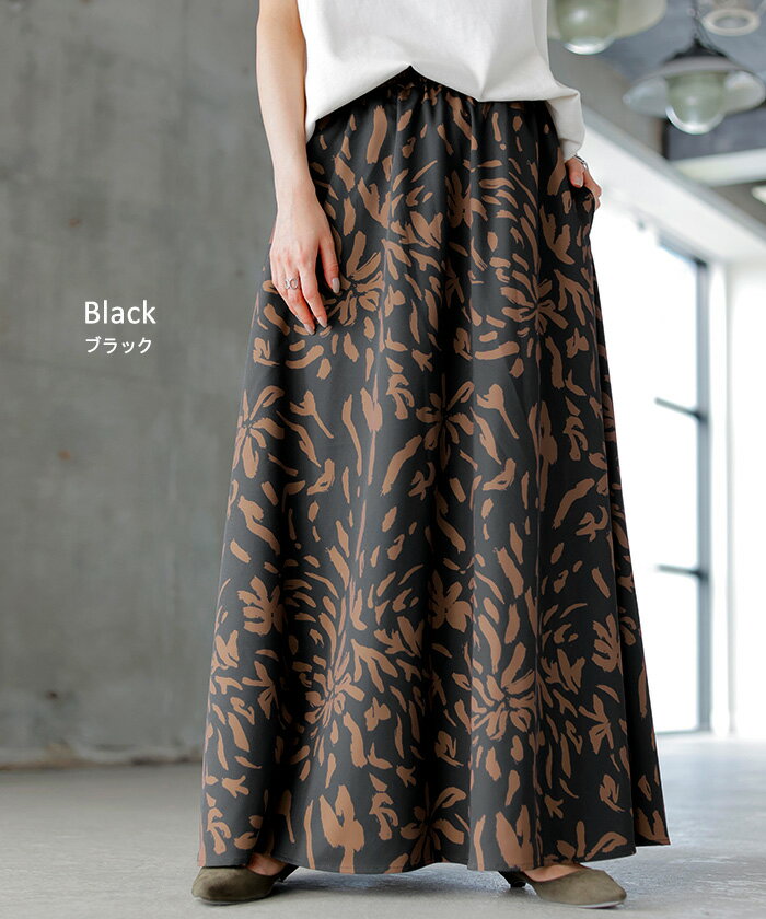 スカート 柄 ロング 【即納】 Aライン レディース ロングスカート 総柄 ボトムス ボトム フレア フレアスカート マキシ マキシスカート シワになりにくい ウエストゴム ポケット 無地 長い ゆったり きれいめ ハイウエスト おしゃれ 黒 白 春 夏 HUG.U