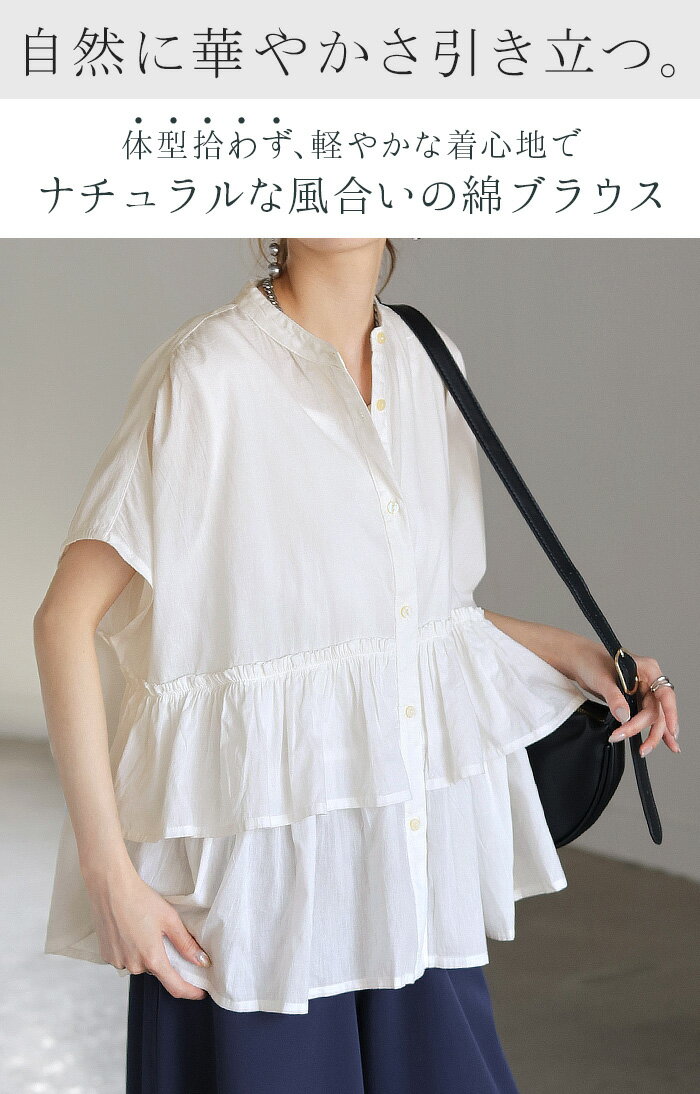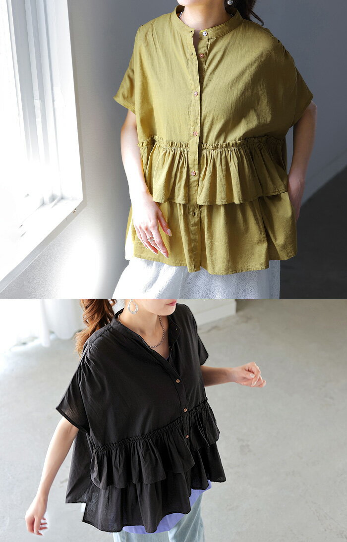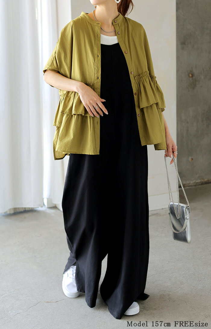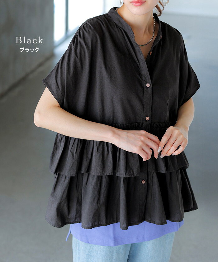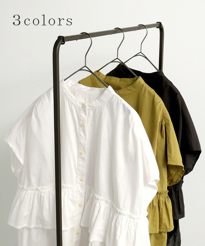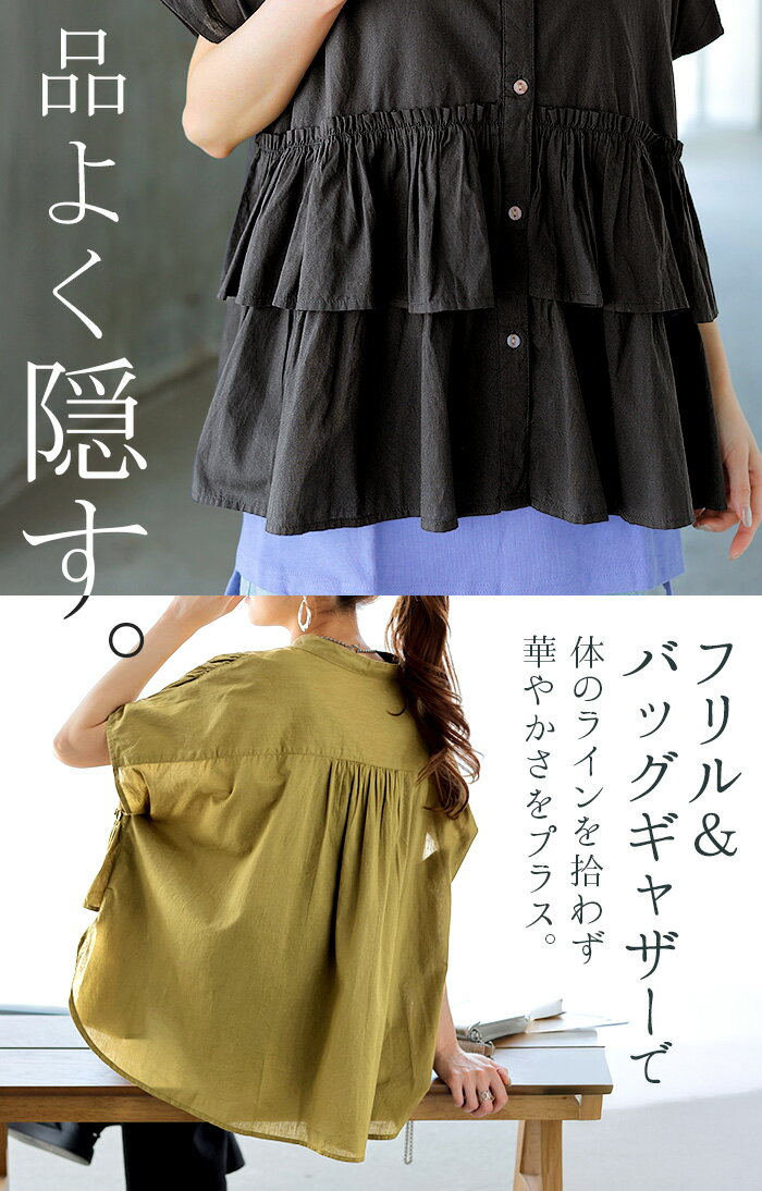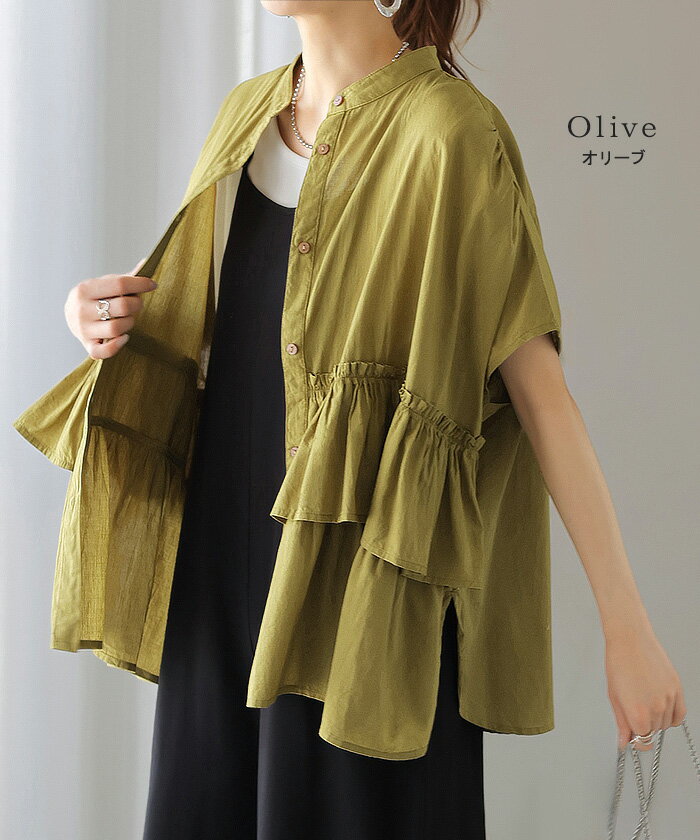 シャツ ノーカラー 綿100% フリル ■6月中旬入荷 トップス レディース バンドカラー ブラウス ロング ロングシャツ チュニック 半袖 無地 羽織 ライトアウター コットン きれいめ 二の腕カバー ゆったり 大きいサイズ ナチュラル 体型カバー 黒 白 春 夏 HUG.U
