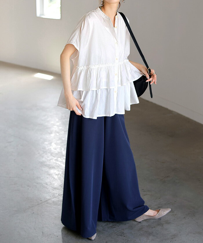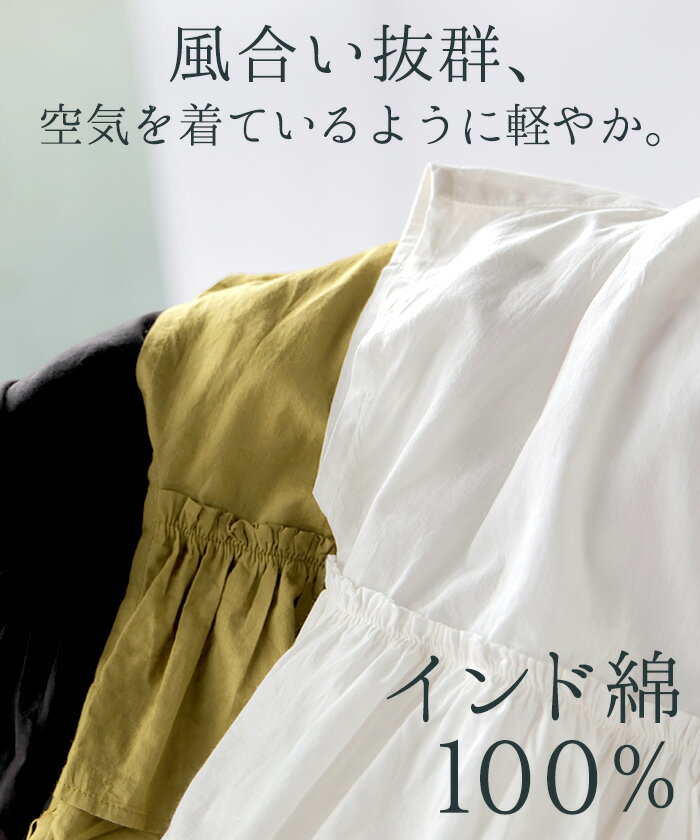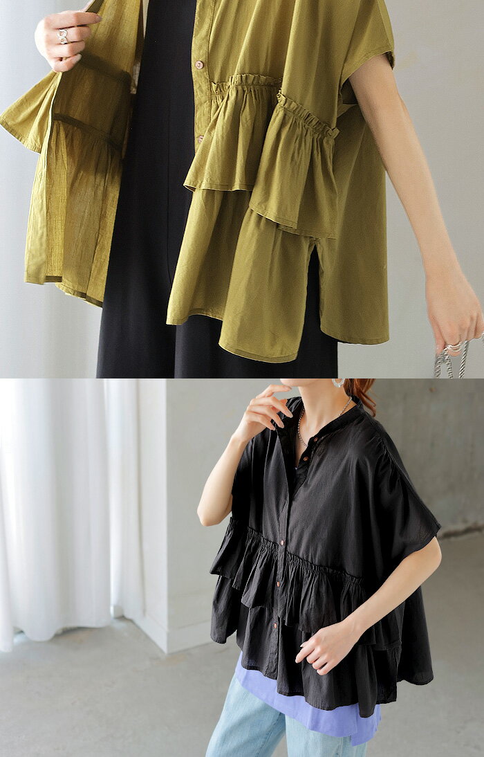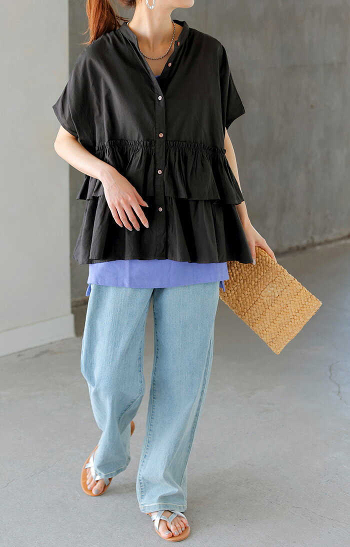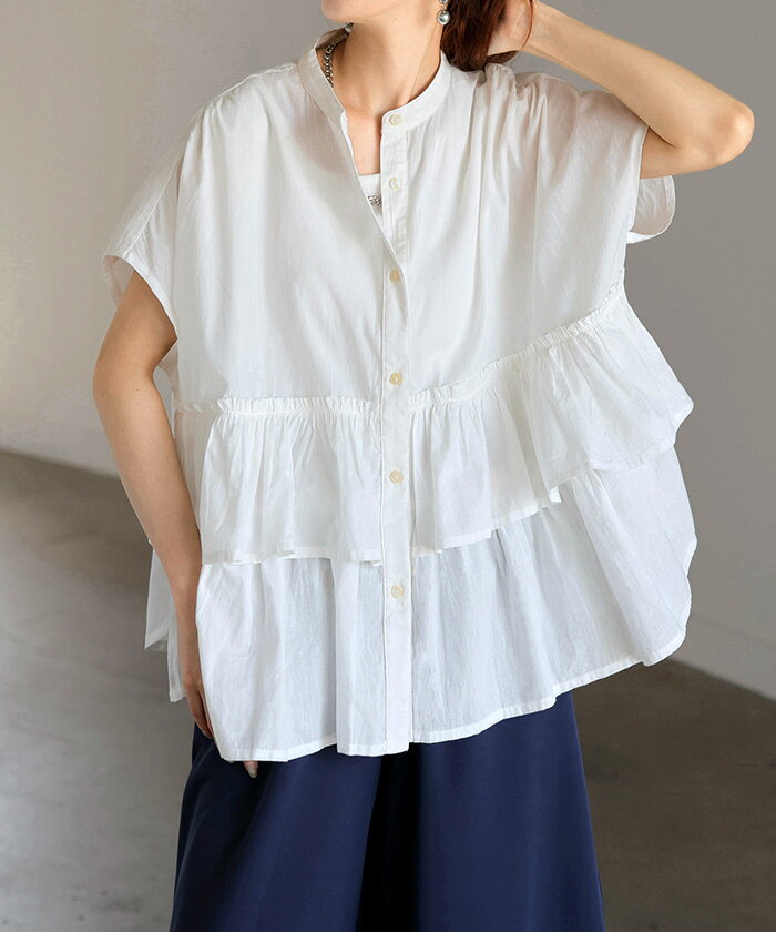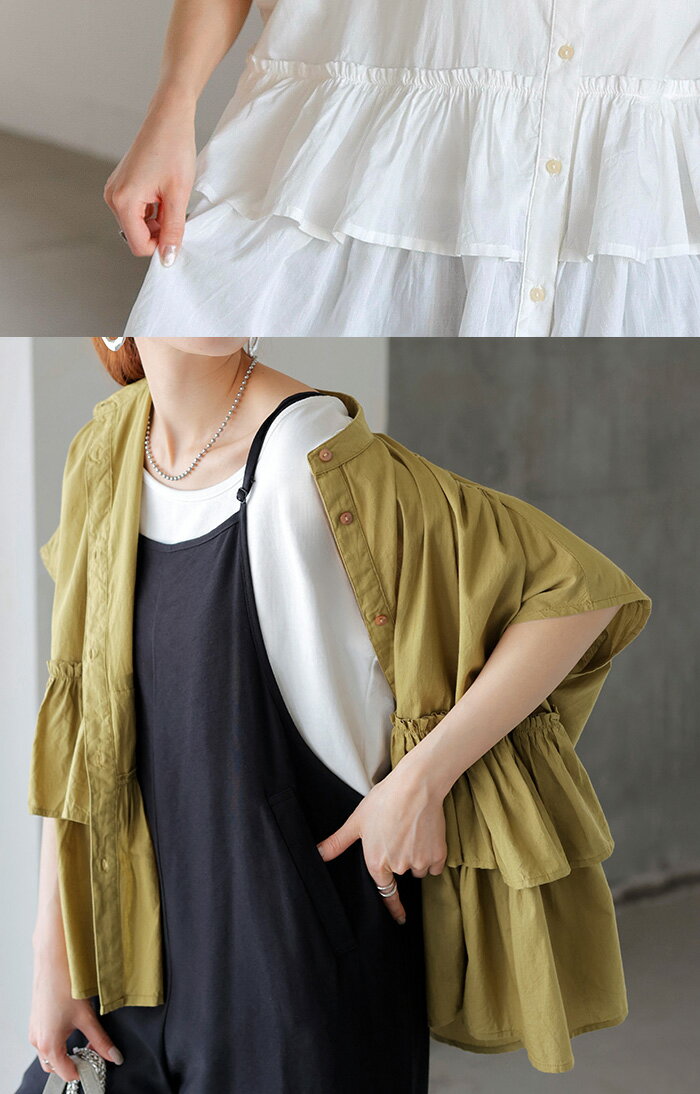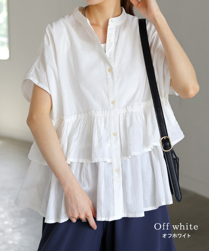 シャツ ノーカラー 綿100% フリル ■6月中旬入荷 トップス レディース バンドカラー ブラウス ロング ロングシャツ チュニック 半袖 無地 羽織 ライトアウター コットン きれいめ 二の腕カバー ゆったり 大きいサイズ ナチュラル 体型カバー 黒 白 春 夏 HUG.U