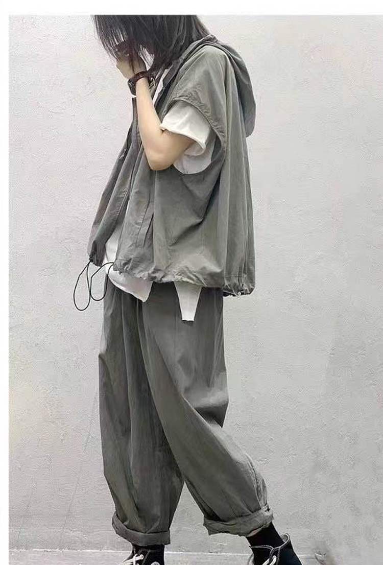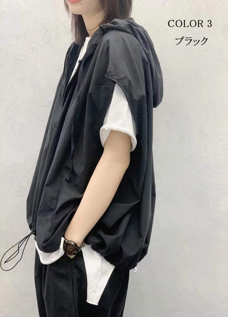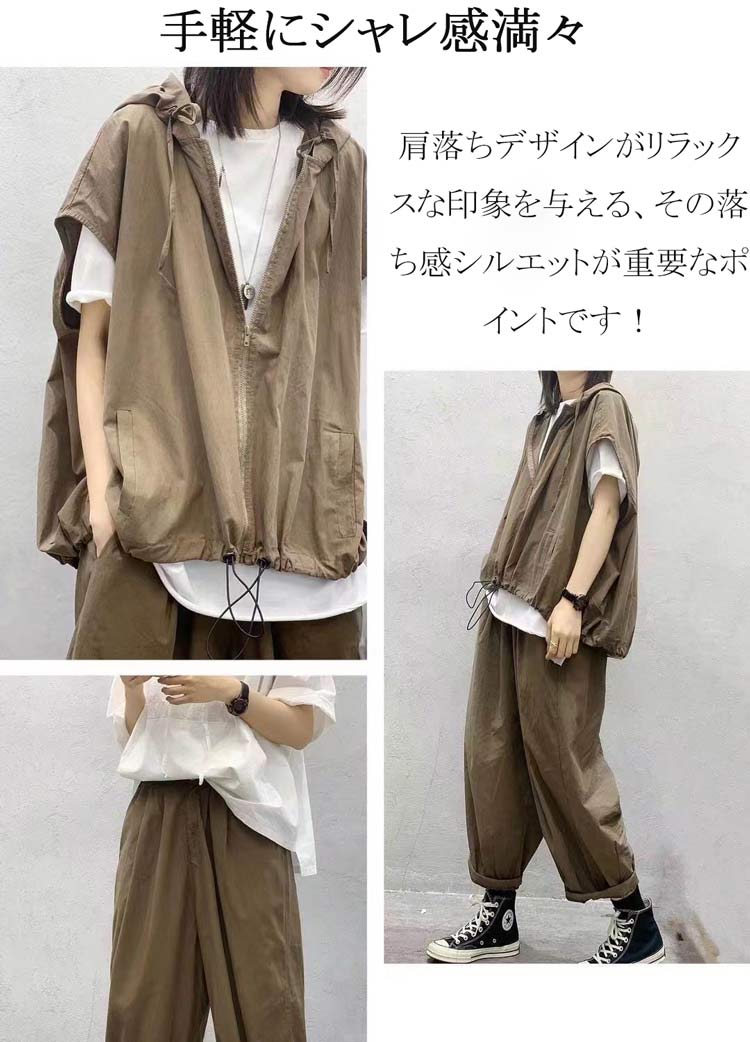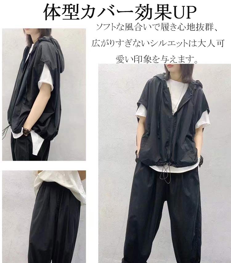 ベスト 春夏 秋 フード付き レディース 前開け ジレ フレンチスリーブ チョッキ 大きいサイズ パーカー サイドポケット 裾口紐付き 調節可 ライトコート ドロップショルター トップス カジュアル クール アウター 体型カバー