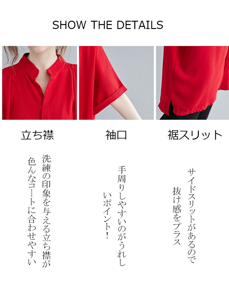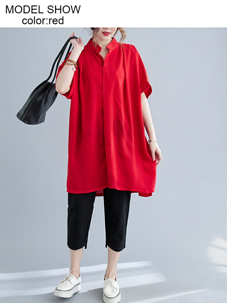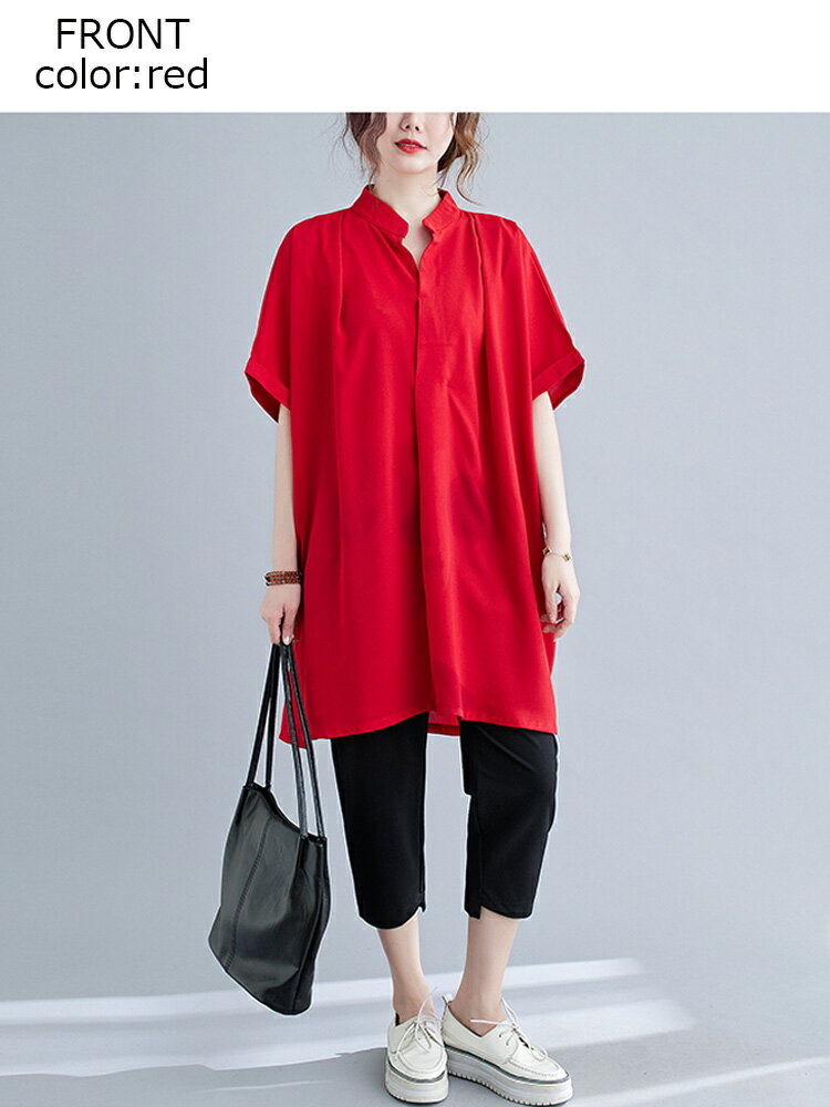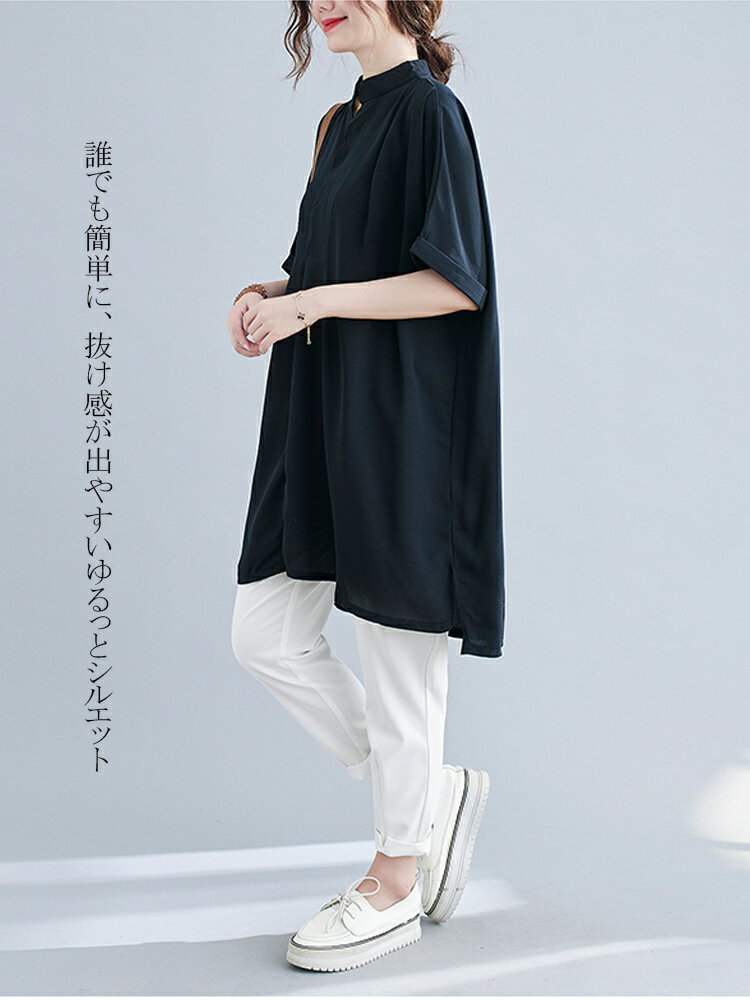 オーバーサイズ チュニック シャツ ブラウス レディース トップス チュニックブラウス チュニックシャツ シャツブラウス 前後差 大きいサイズ サイドスリット 不規則 プルオーバー 立ち襟 半袖 ギャザー アシンメトリー
