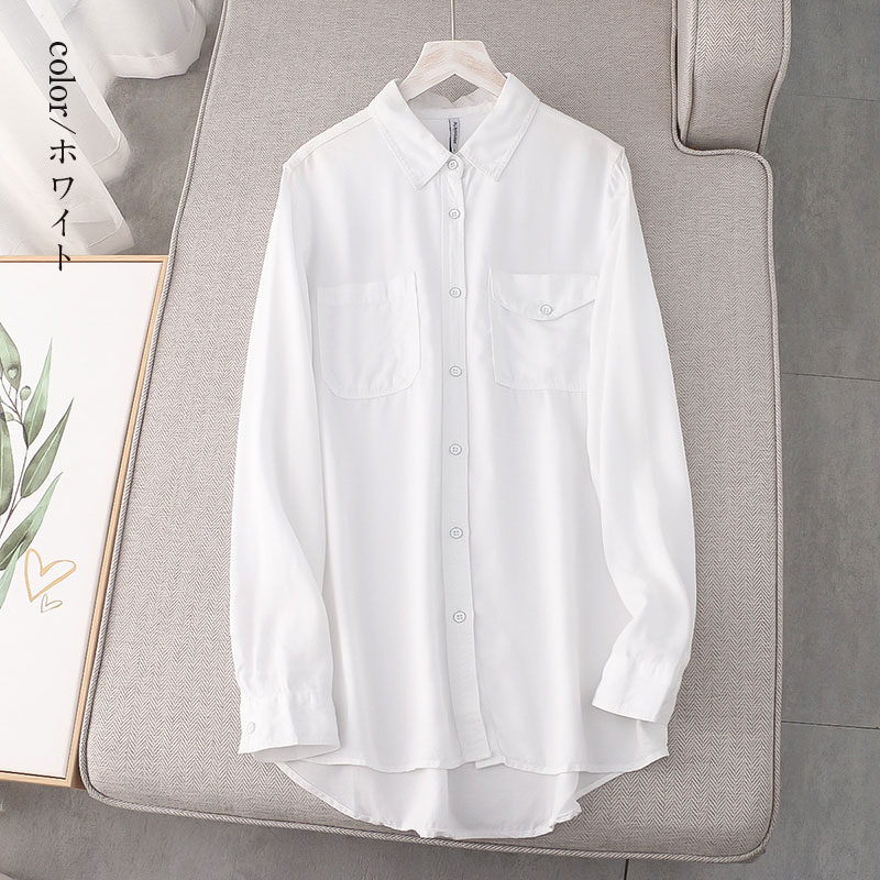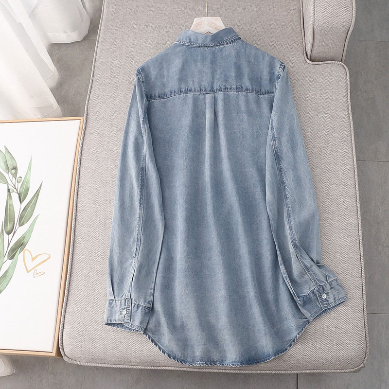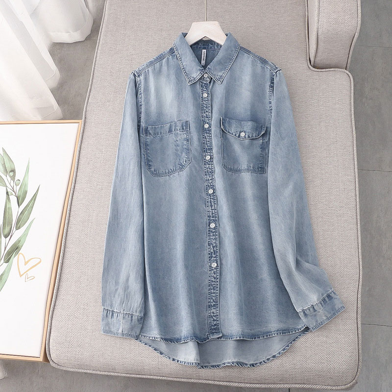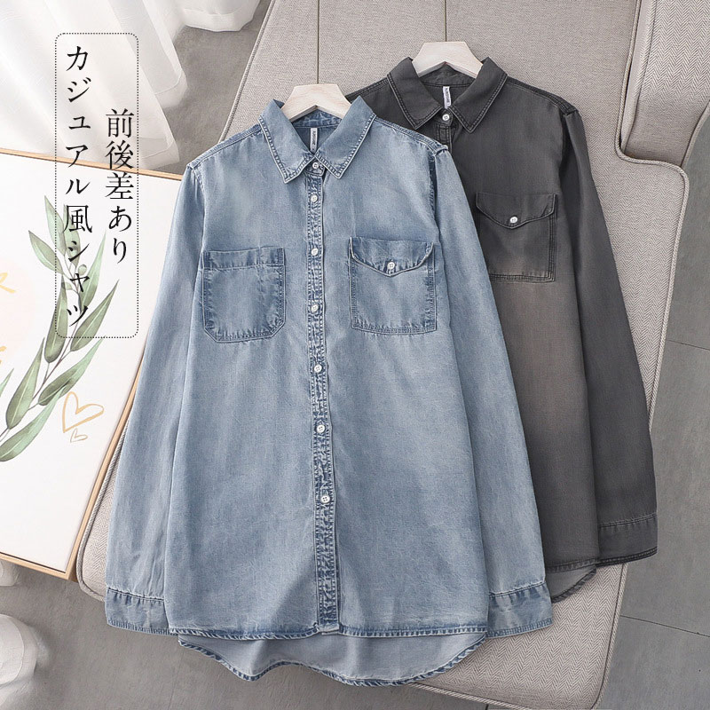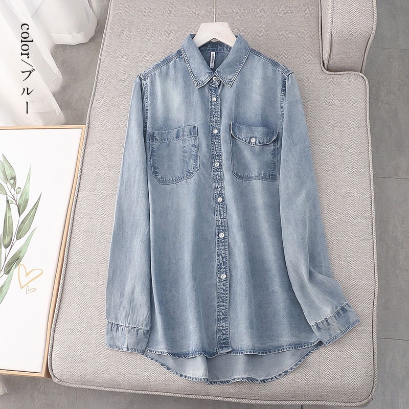 チュニック ロングシャツ レディース チュニックシャツ テンセル デニム 長袖 体型カバー 大きいサイズ 襟付き レギュラカラー 羽織り トップス シャツ ライトアウター レイヤード 重ね着 前後差 前開き ゆったり 春 秋 冬 ポケット 30代 40代 50代