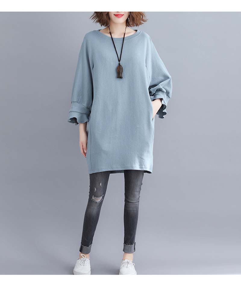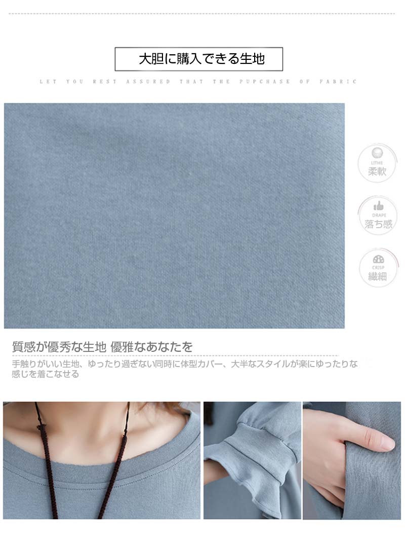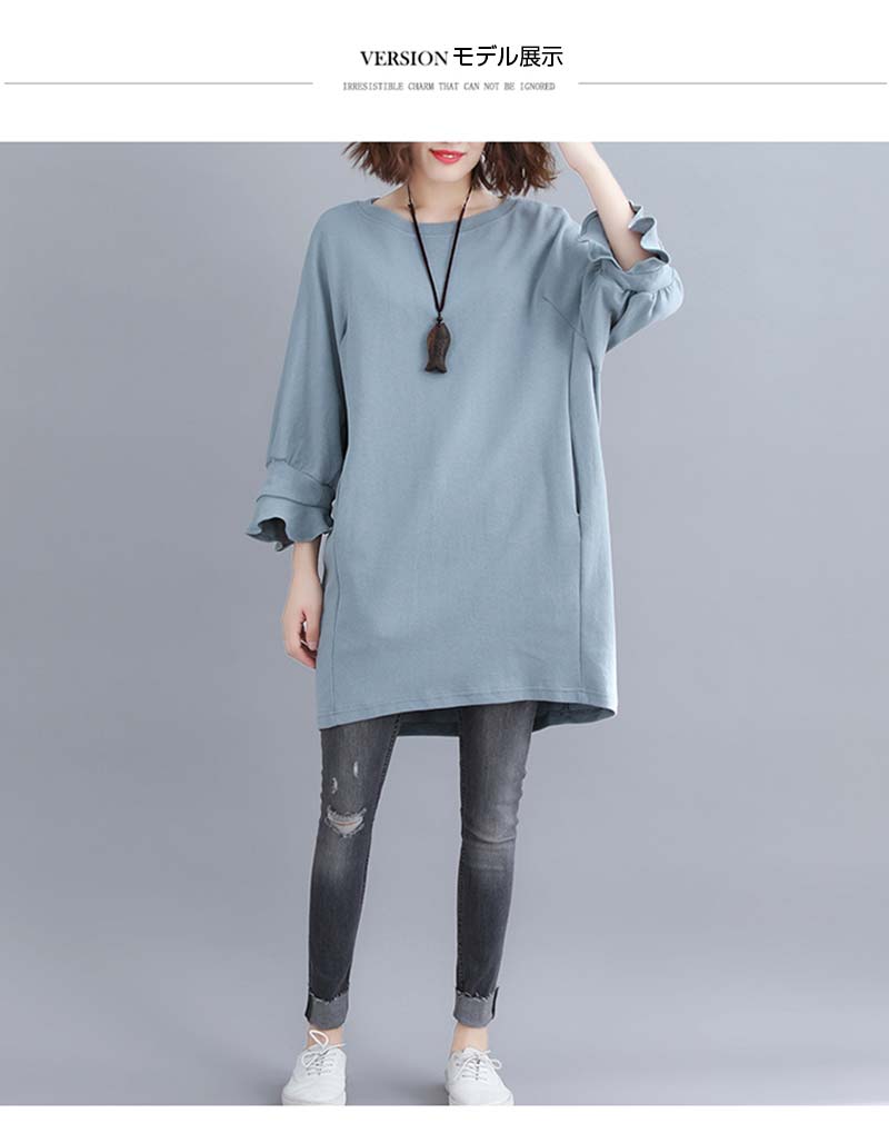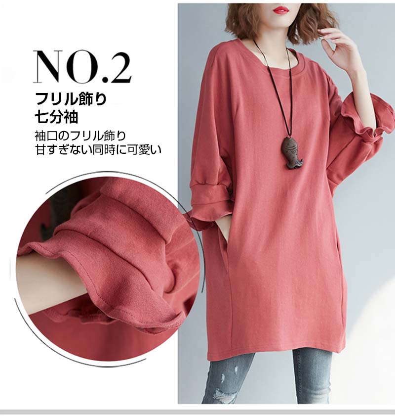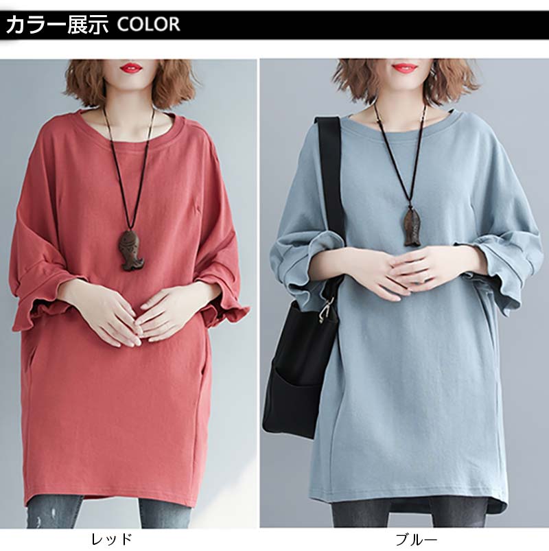 チュニック ブラウス レディース 袖口 フリル 七分袖 ポケット付き トップス ロング丈 ロンT 体型カバー バルーン袖 プルオーバー ラウンドネック スウエット トレーナー ワンピース 丸首 大きいサイズ カットソー ボリュームスリーブ 春