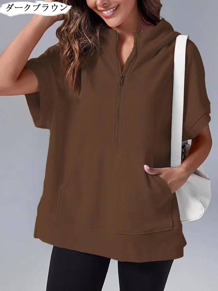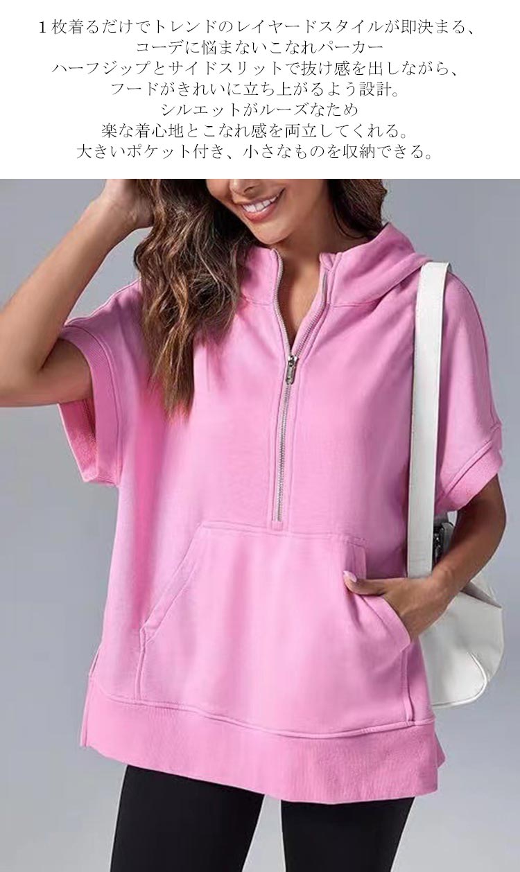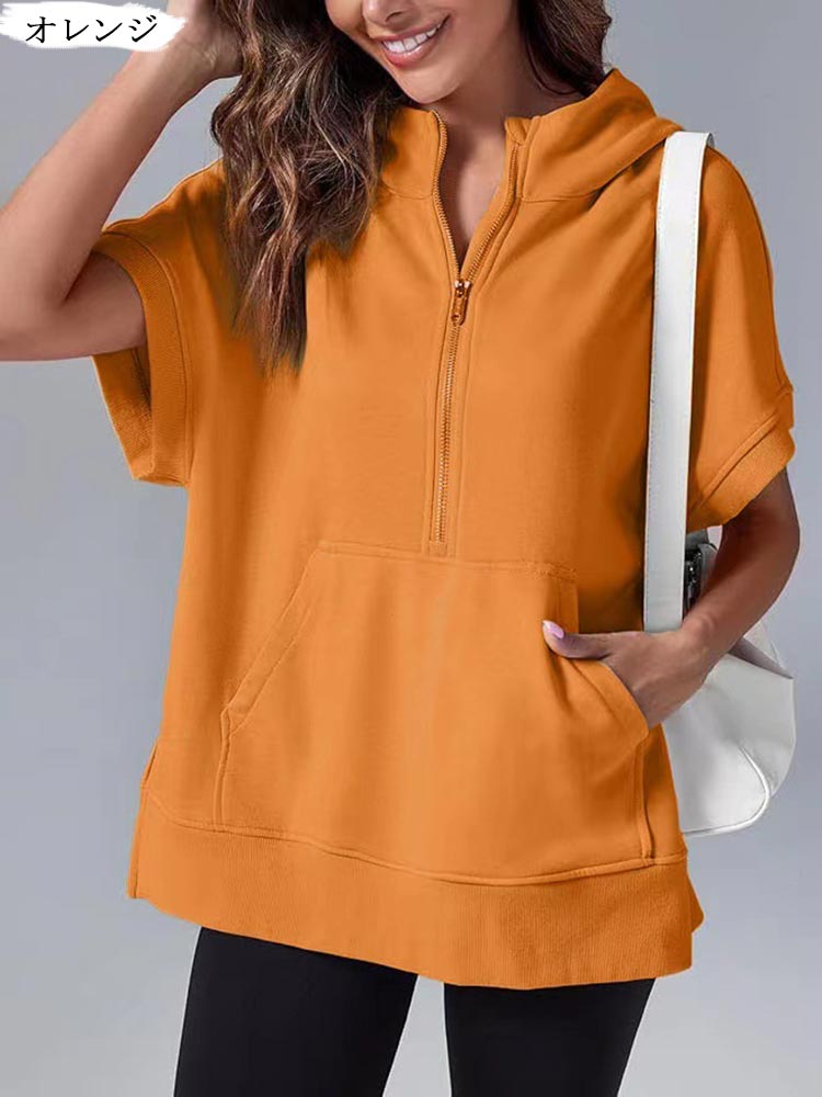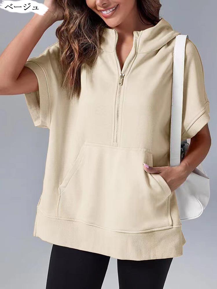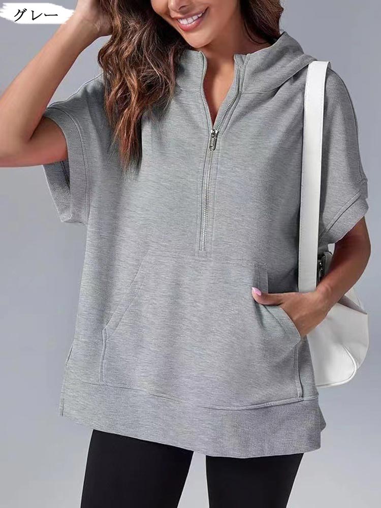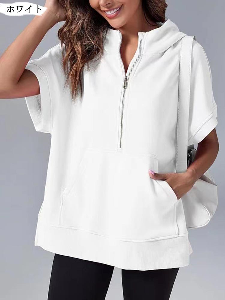 半袖 パーカー 夏 レディース 春夏 トップス ジッパー 羽織り 半袖パーカー 薄手 大きいサイズ ジップ フード付き ポケット レイヤード ハーフジップ サイドスリット ポケット付き フーディー フレンチスリーブ お洒落 カジュアル 夏服 シンプル ホワイト ブラック 送料無料