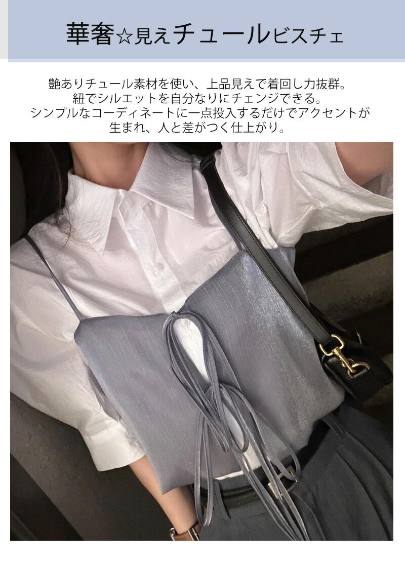 \タイムセール価格2350円!/ビスチェ レディース トップス ベスト チュールベスト ショートビスチェ チュール キャミソール キャミ ノースリーブ ショート丈 クロップド 薄手 ストラップ フェミニン 大人可愛い ゆったり 体型カバー レイヤード 重ね着 きれいめ 夏