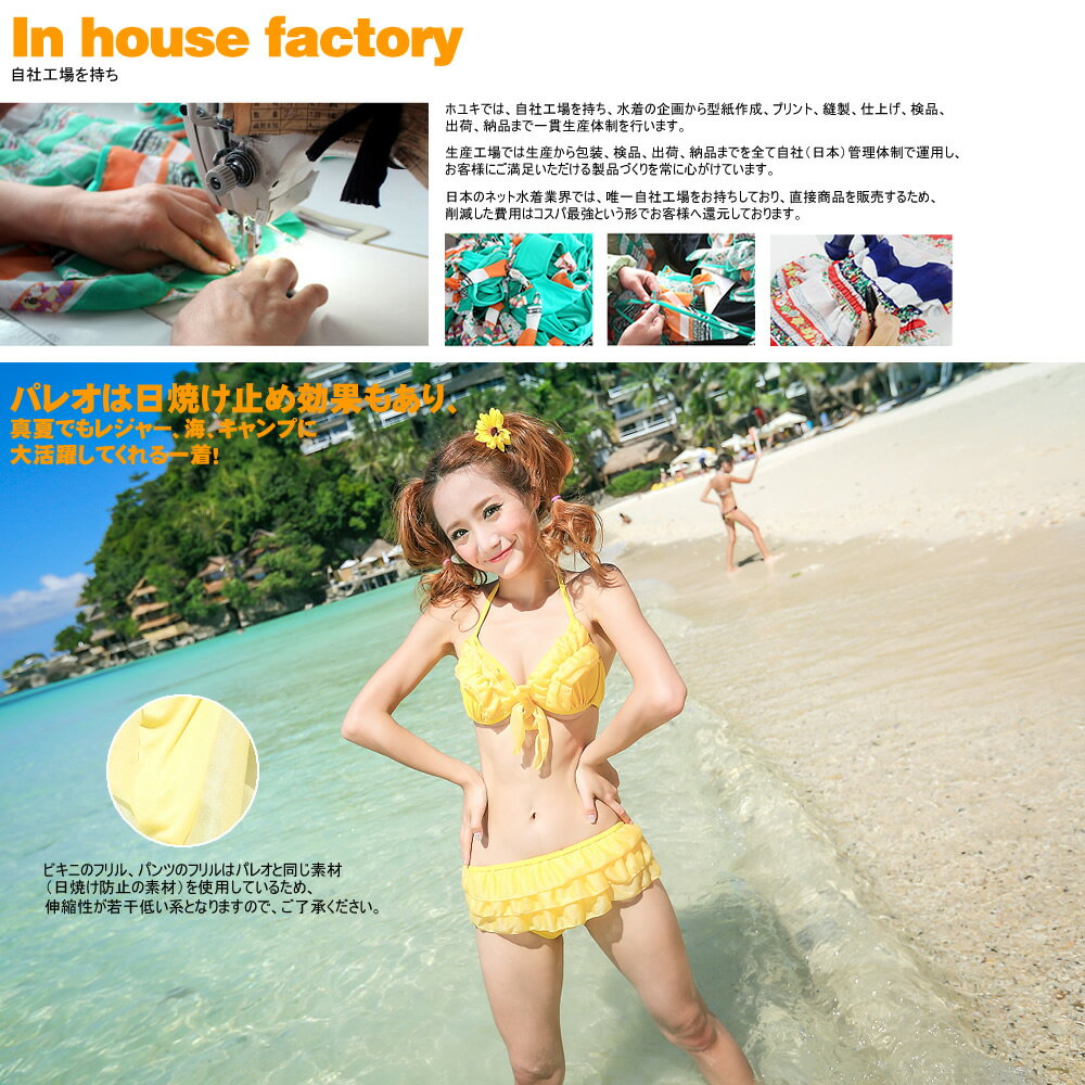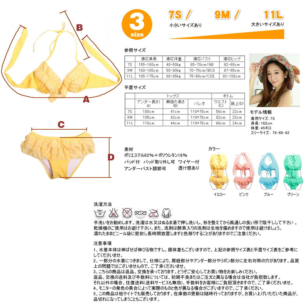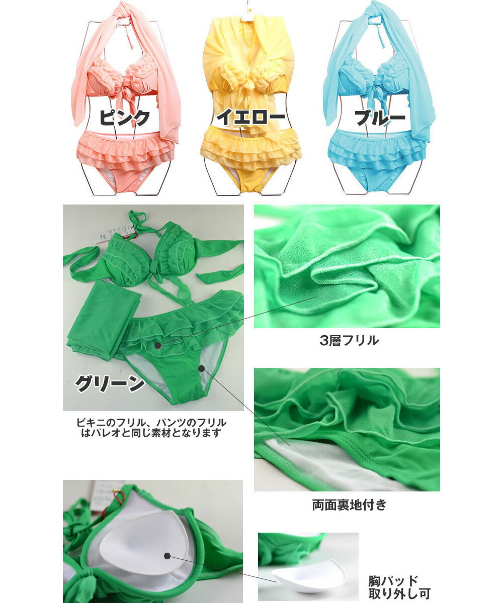 あす楽 水着 レディース 3点セット 水着 ビキニ+パレオ、着こなし自由、無地、ワイヤー入り、7S/9M/11L ママ 水着 体型カバー