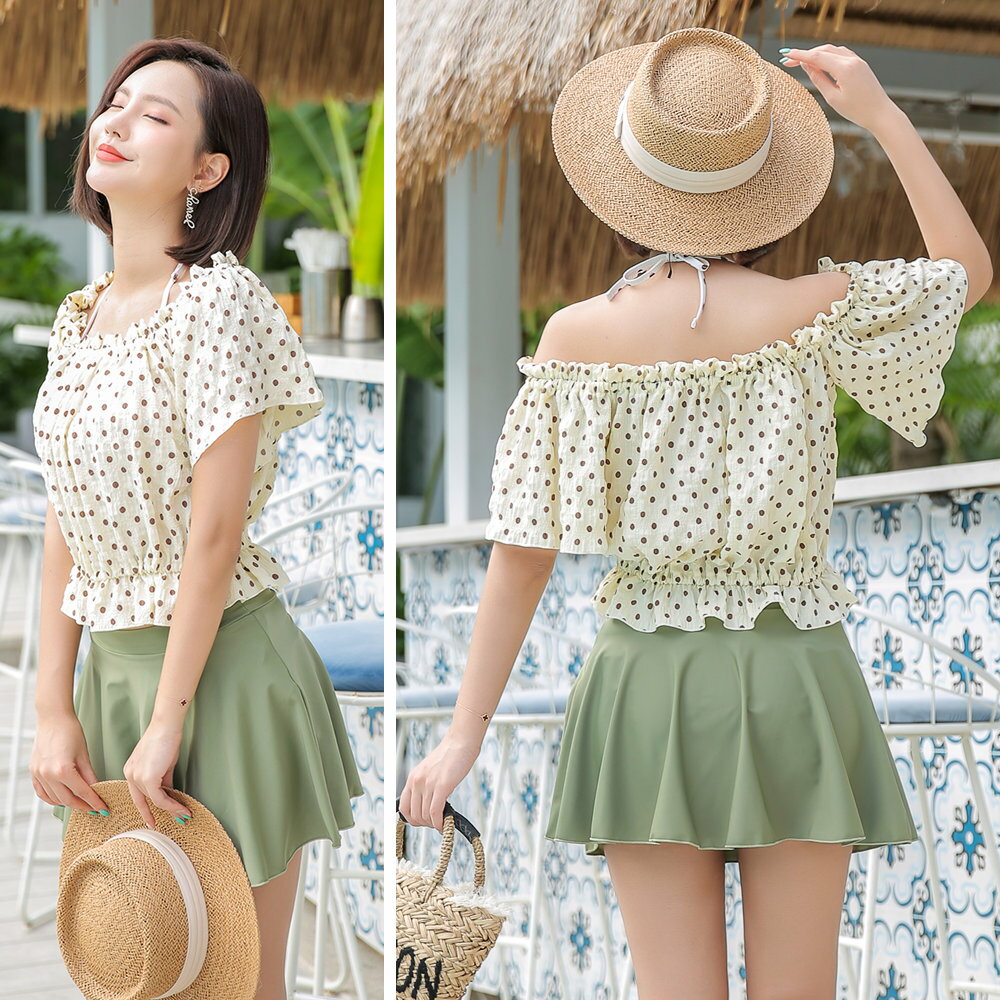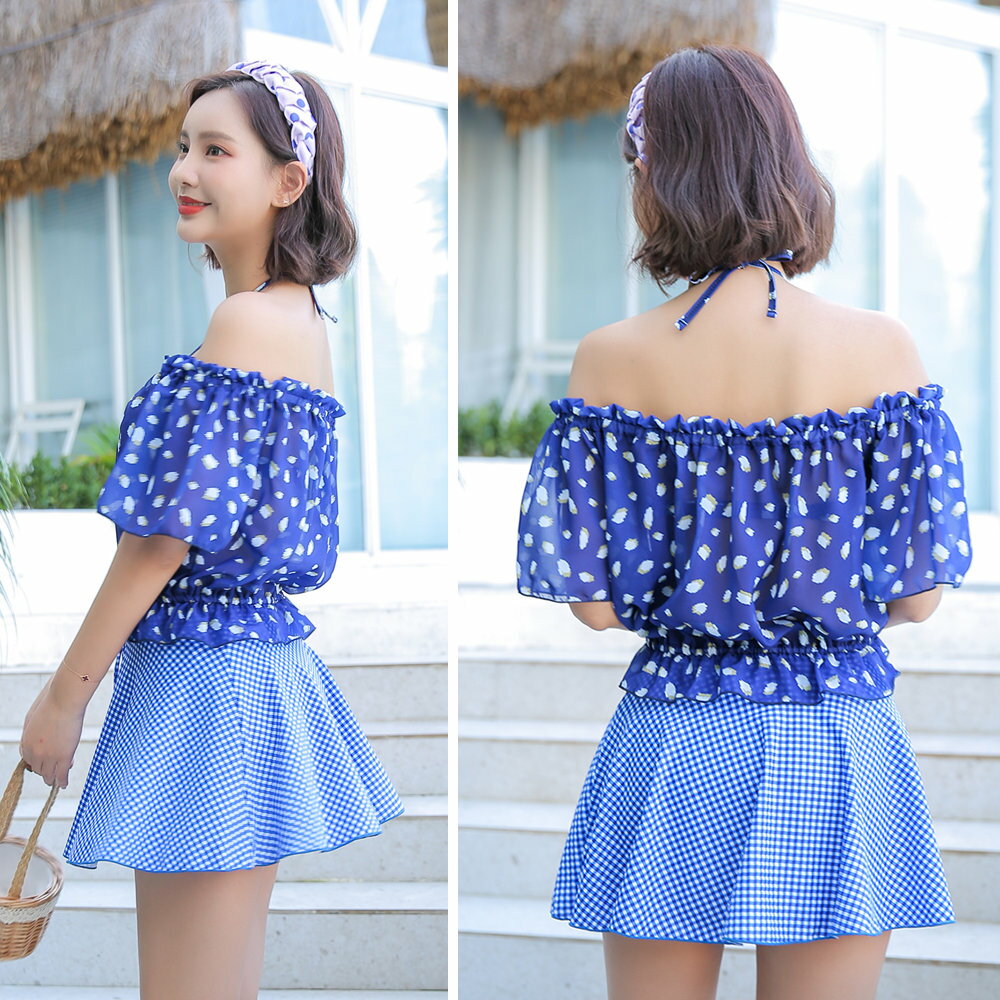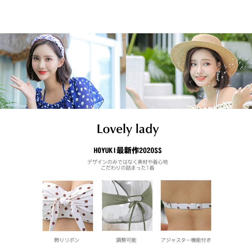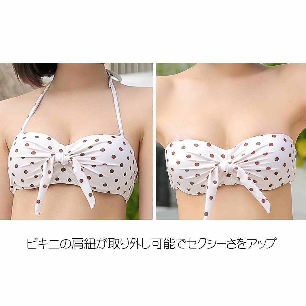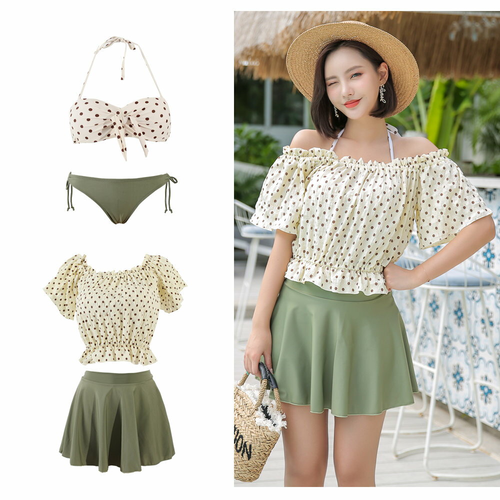 水着 レディース バンドゥ ビキニ トップス オフショルダー ホルダーネック スカート付き 紐パン 透け感あり 4点セット 水玉 チェック カーキ ベージュ ブルー S/M/L/LL