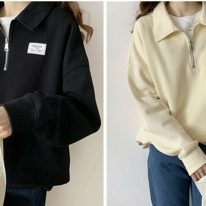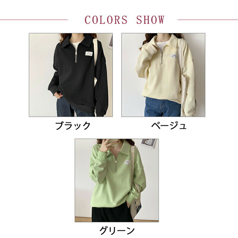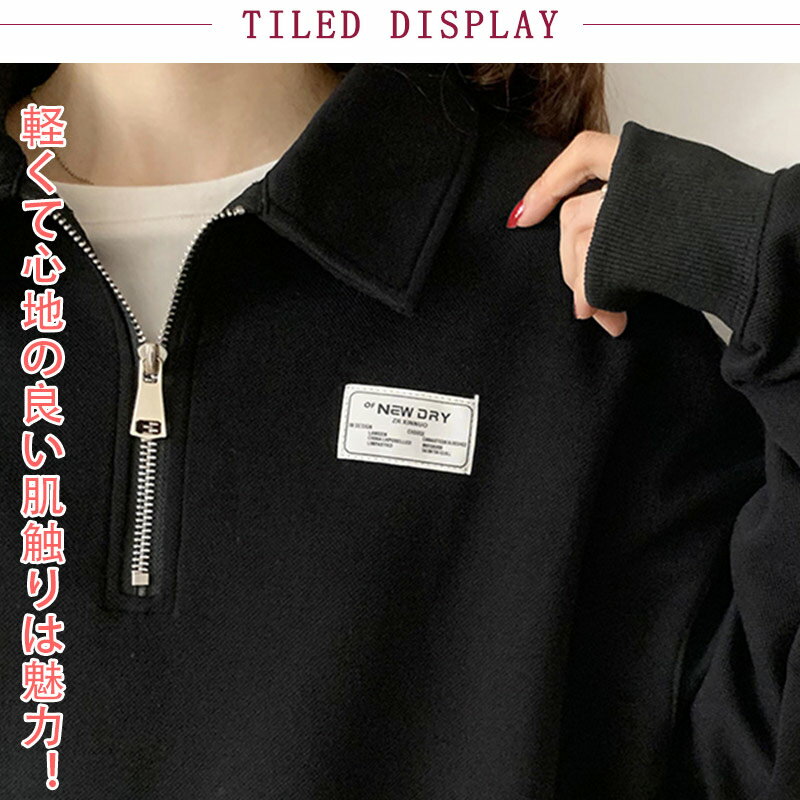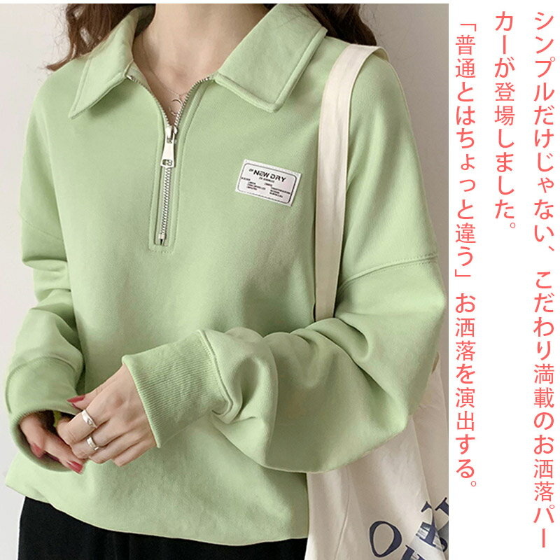 ハーフジップ スウェット トップス レディース トレーナー ロゴ パーカー ポロ襟 襟コン ドロップショルダー 無地 カジュアル 長袖 ゆったり 体型カバー 春 秋 冬 送料無料