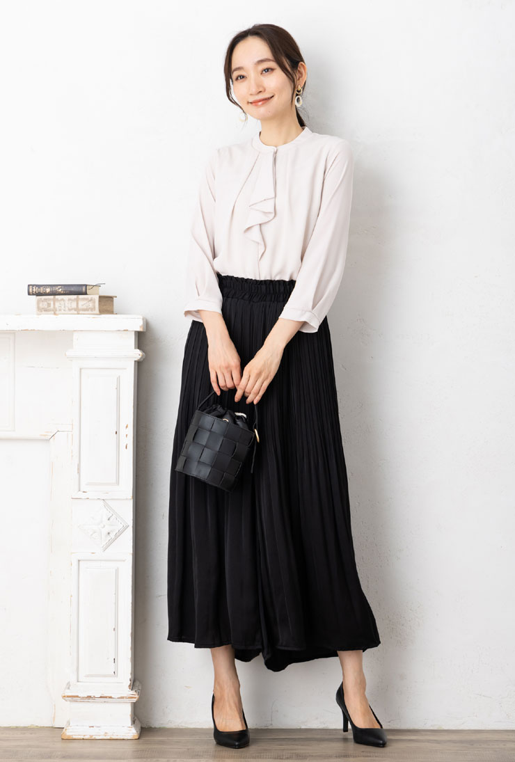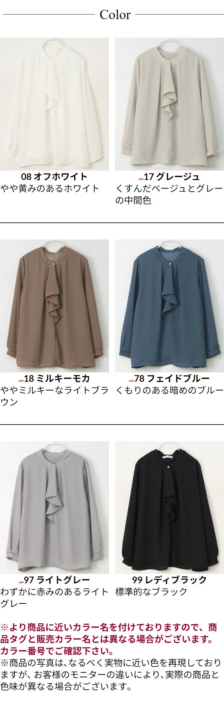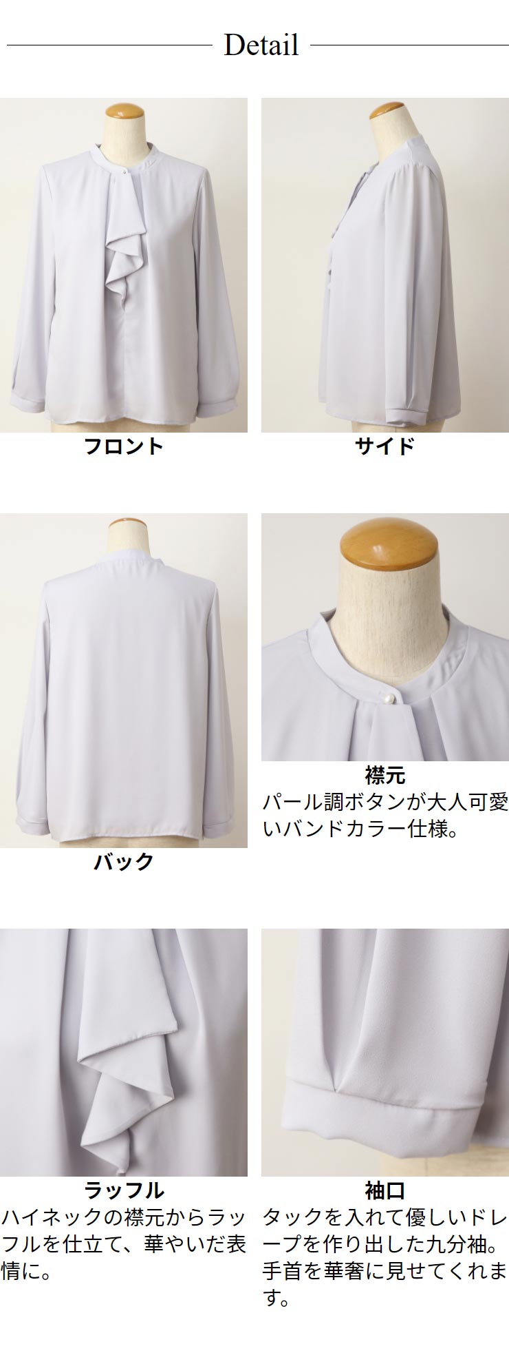 ブラウス ボウタイ レディース 春 秋 冬◆【メール便 送料無料06】【M〜LL】ジョーゼット 裏スムース パールボタン付きバンドカラーフロントラッフル九分袖ブラウス【エコ包装】[bl][ フォーマル 入学式 入園式 卒業式 卒園 オフィス カジュアル ママ カットソー裏地 ][am]