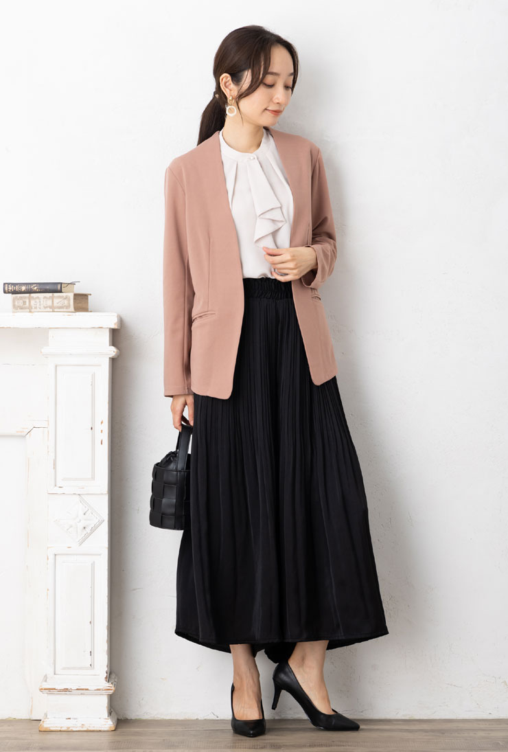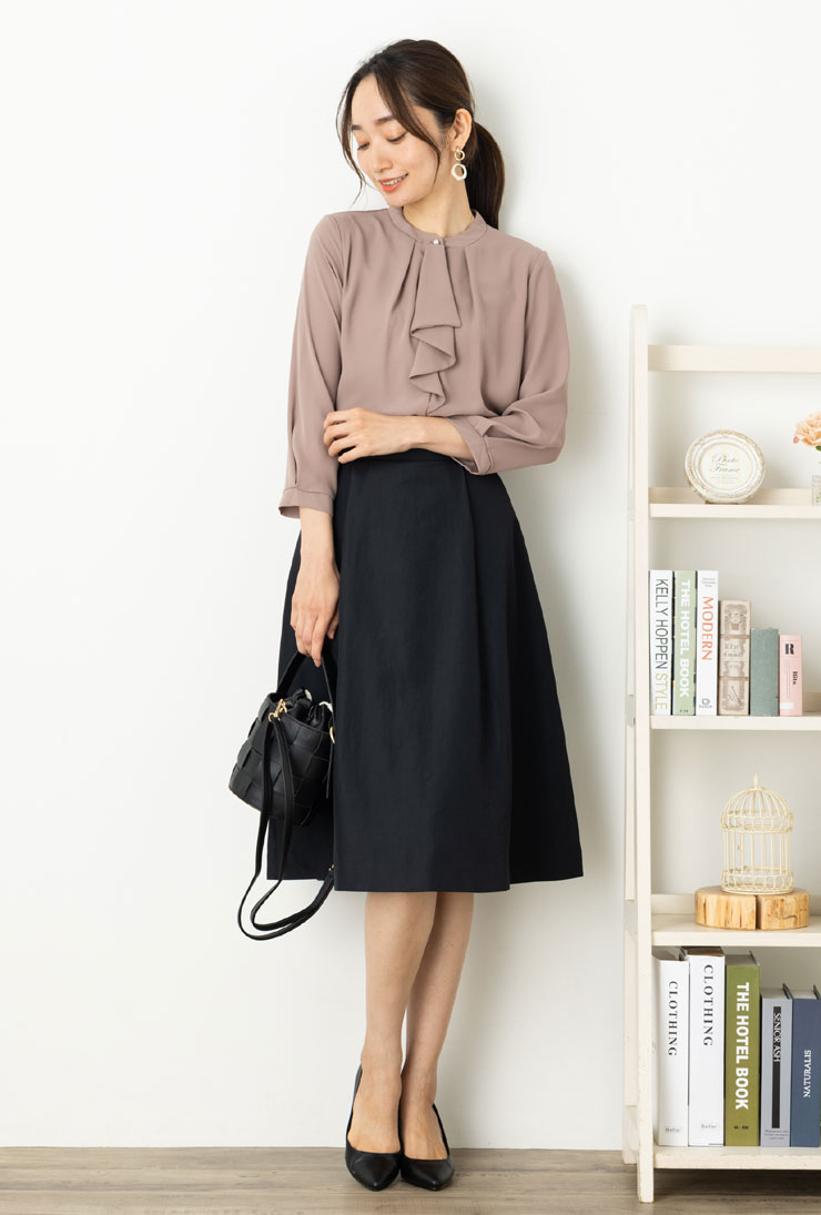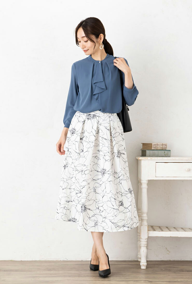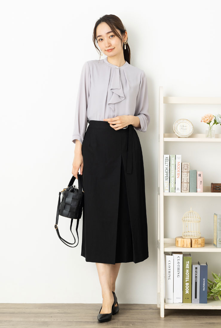 ブラウス ボウタイ レディース 春 秋 冬◆【メール便 送料無料06】【M〜LL】ジョーゼット 裏スムース パールボタン付きバンドカラーフロントラッフル九分袖ブラウス【エコ包装】[bl][ フォーマル 入学式 入園式 卒業式 卒園 オフィス カジュアル ママ カットソー裏地 ][am]