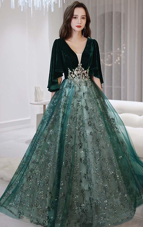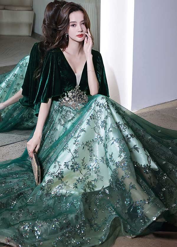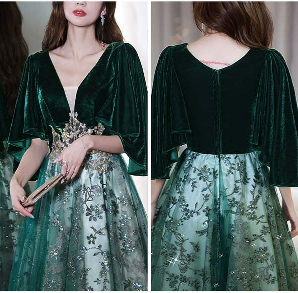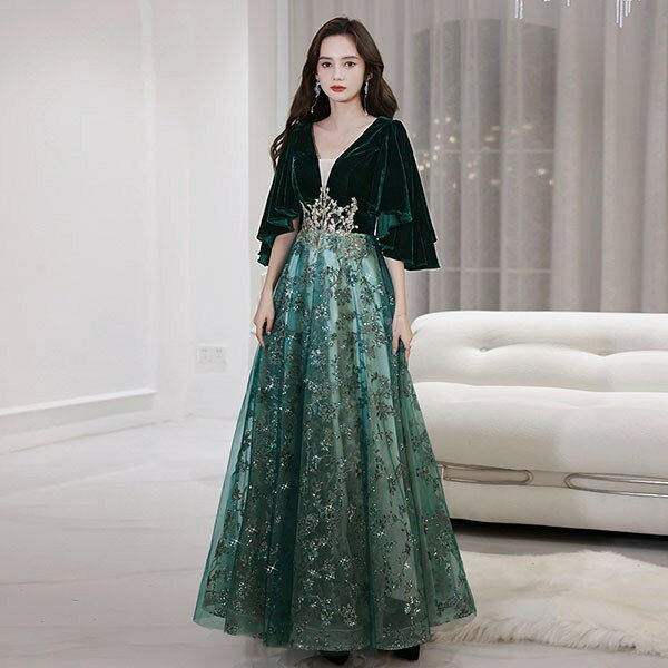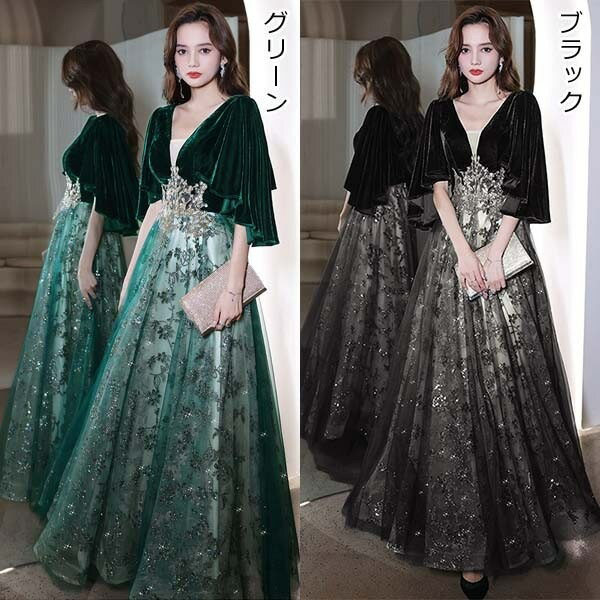 ロングドレス 演奏会 緑 黒 ポワン袖 袖あり パーティドレス ロング キラキラ カシュクール 大きいサイズ 大人 演奏会 ピアノ 発表会 母親 結婚式 ロング 体型カバー 謝恩会 卒業式 花嫁 ステージ 緑 ブラック グリーン 20代 30代 40代 S M L XL 2XL 3XL 4XL