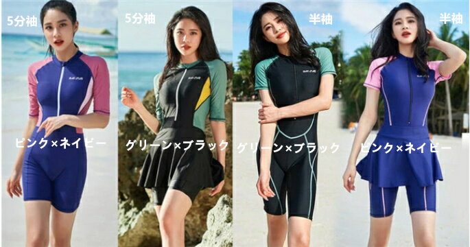 水着 レディース 袖あり 半袖 フィットネス水着 レディース水着 水陸両用 5分袖 競泳用 オールインワン 紫外線カット ネイビー ピンク 水着 海 ビーチ スポーツジム サーフィン グリー ピンク ネイビー ママ水着 20代 30代 40代 50代 60代 おしゃれ 露出控えめ M L XL 2XL