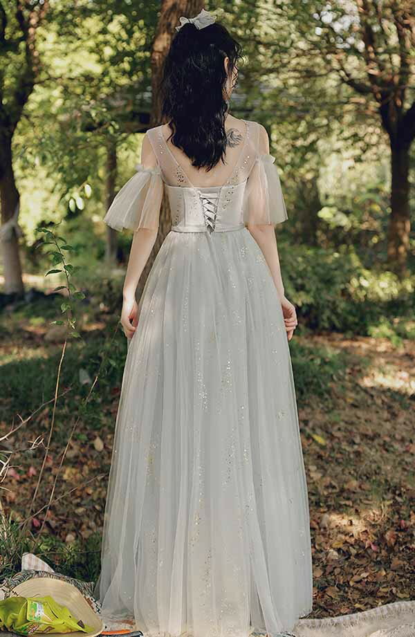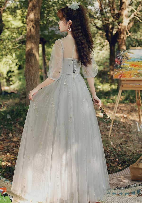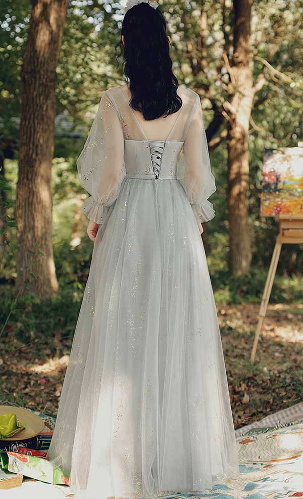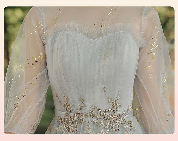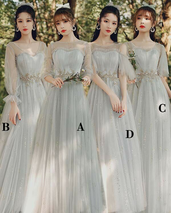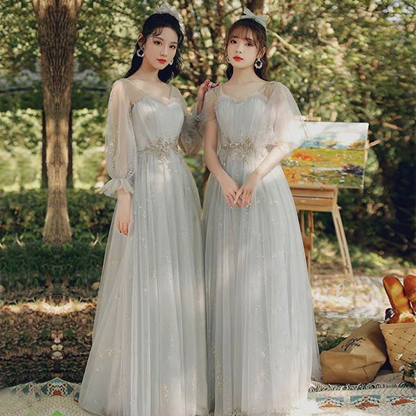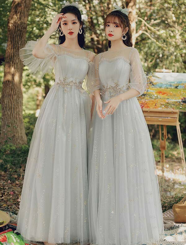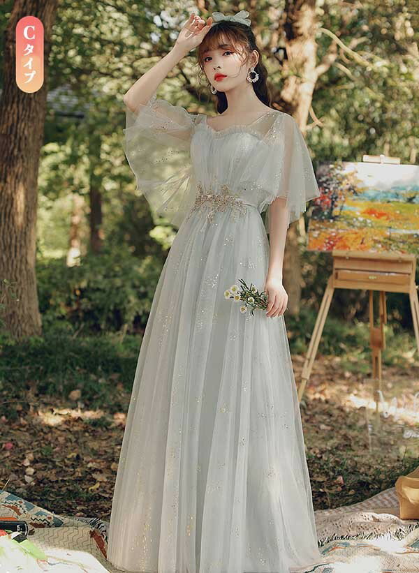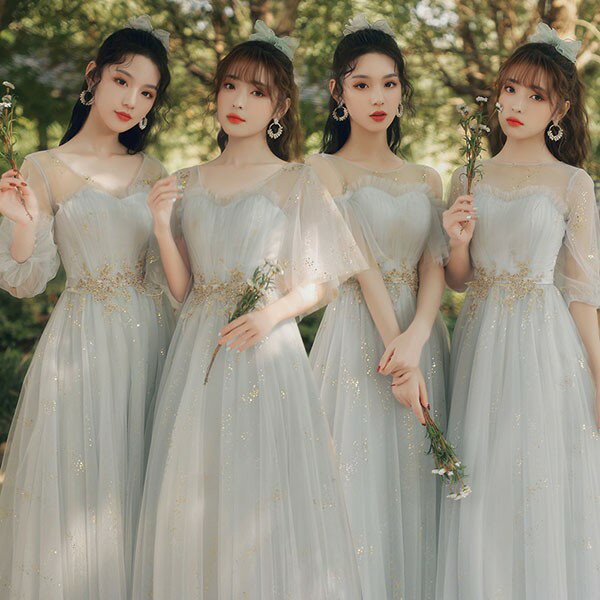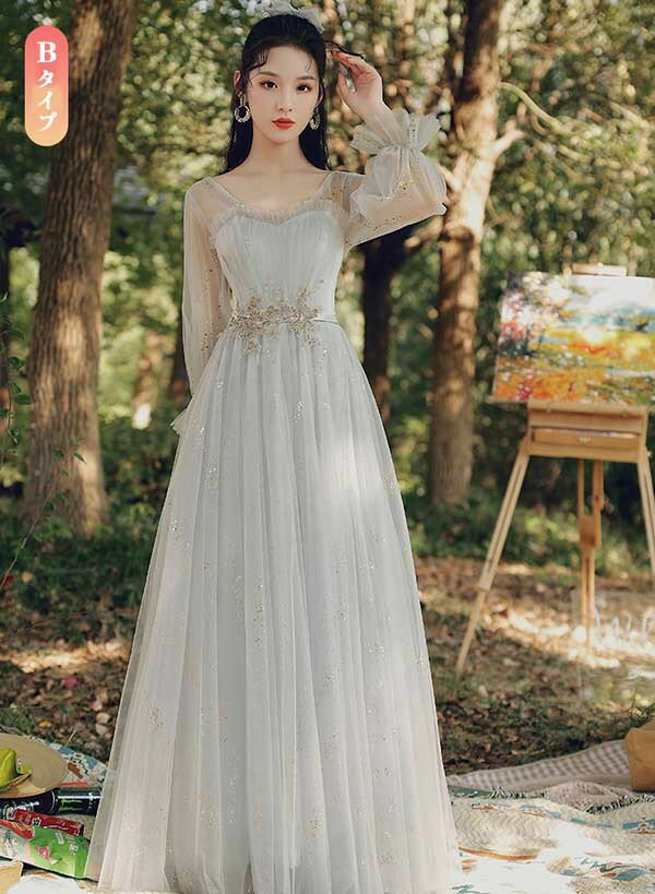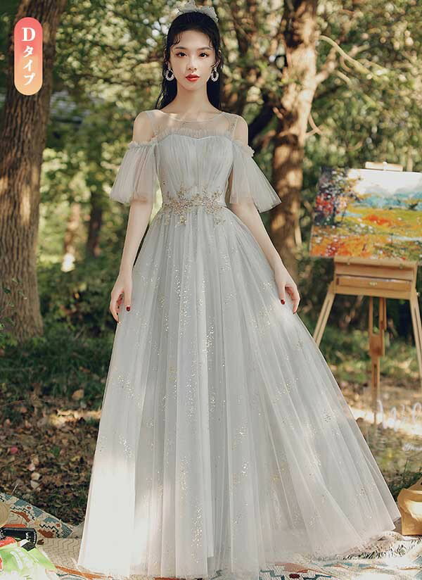 ロングドレス ピアノ発表会 ブライズメイドドレス パーティードレス 結婚式 ロング丈 ミモレ丈 長袖 小さいサイズ 大きいサイズ 体型カバー フリル ピアノ 発表会 二次会 謝恩会 パフスリーブ 肩出し キラキラ 花嫁 演奏会 グレー 20代 30代 40代