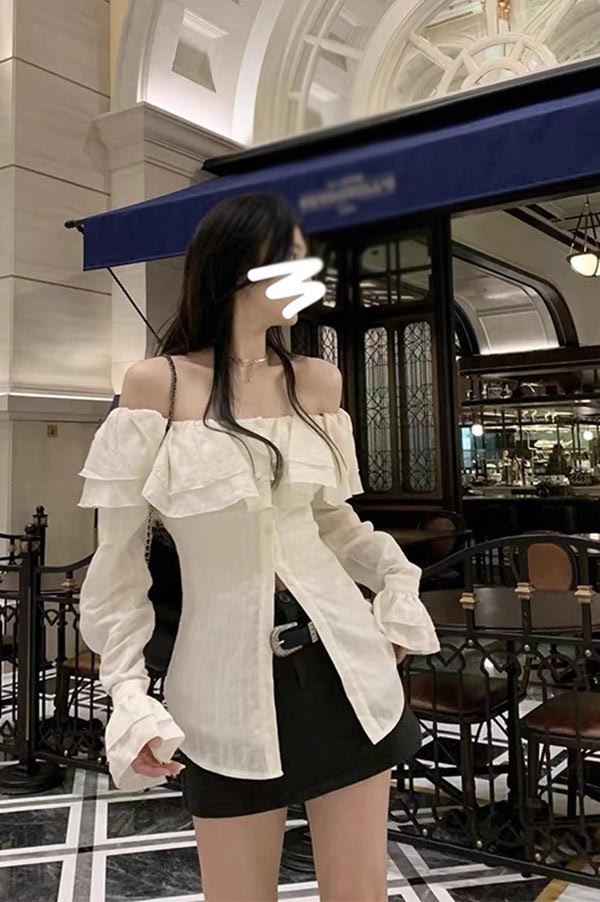 トップス オフショルダー へそ出し フレア袖 フリル おしゃれ 白 ホワイト S M L 2L bi026ze