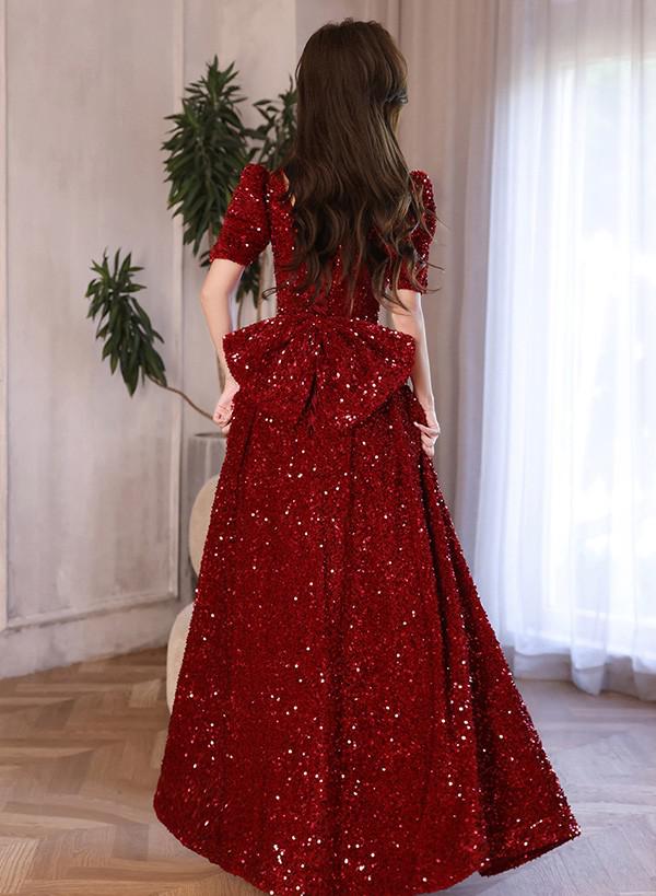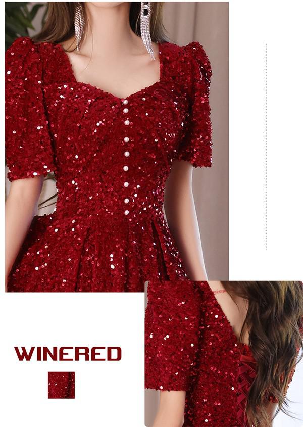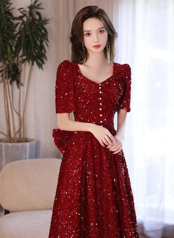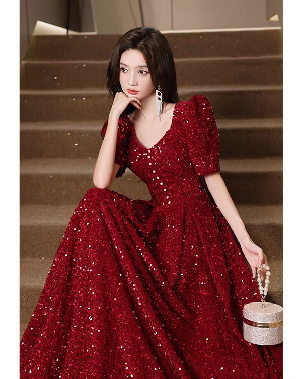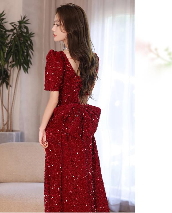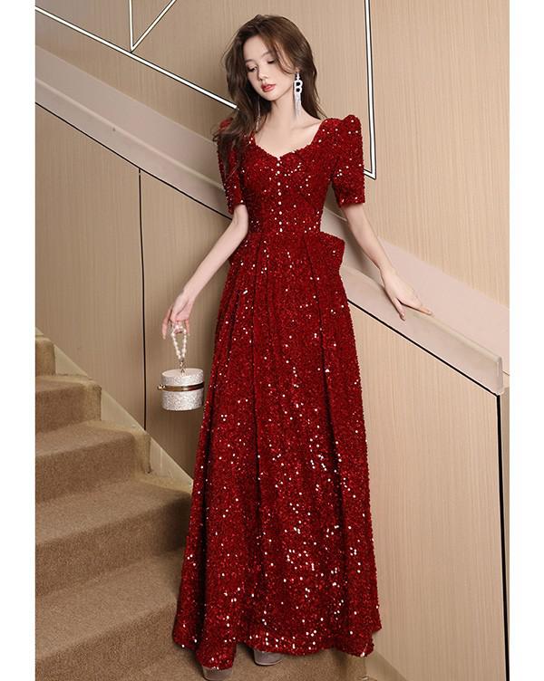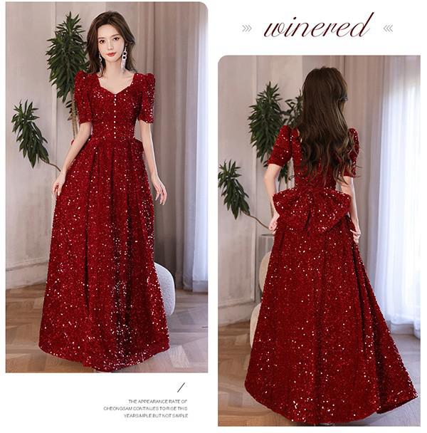 ロングドレス 演奏会 袖付き Vネック キラキラ リボン付き Aライン 大人 ピアノ 発表会 演奏会用ドレス パーティードレス ワインレッド 赤 パーティードレス イブニングドレス XS S M L 2L 3L bs055s1