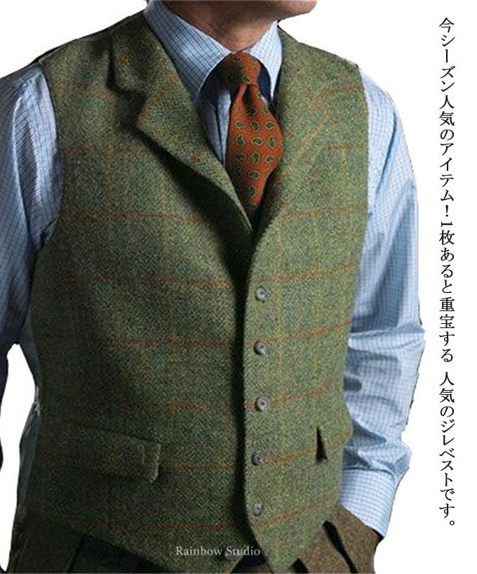 ベスト メンズ スーツ ジレ ツイード ウール チェック 秋冬 スリム 大きいサイズ シングル 細身 ビジネス 結婚式ベスト フォーマル 卒業式 紳士 カジュアル 男性用 春 秋 冬 人気 シンプル オールドアメリカン アメカジ ギフト 全10色 XS-6L 送料無料