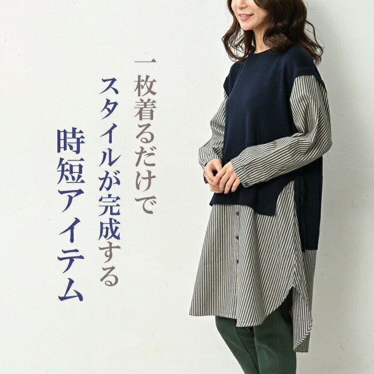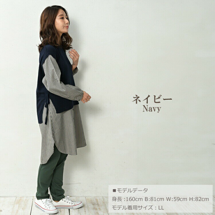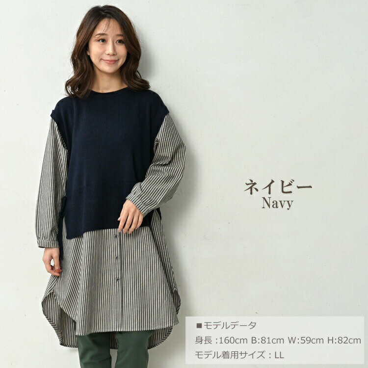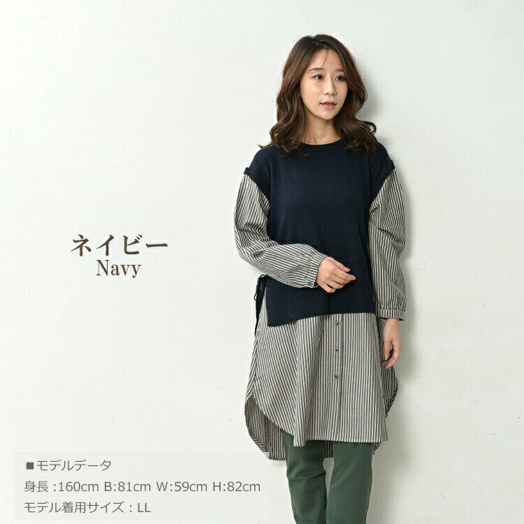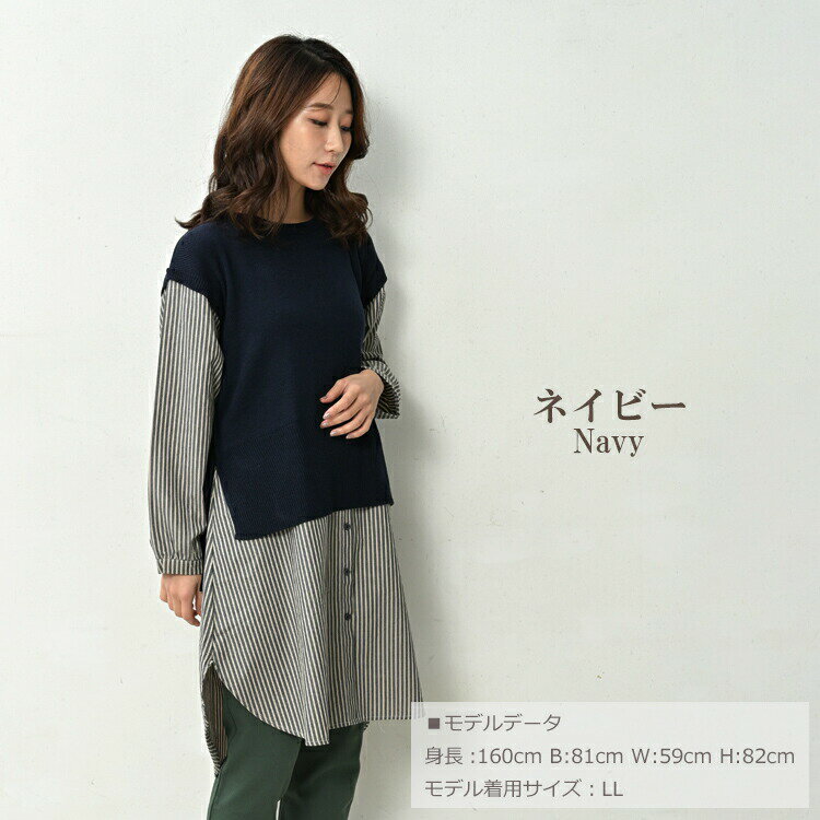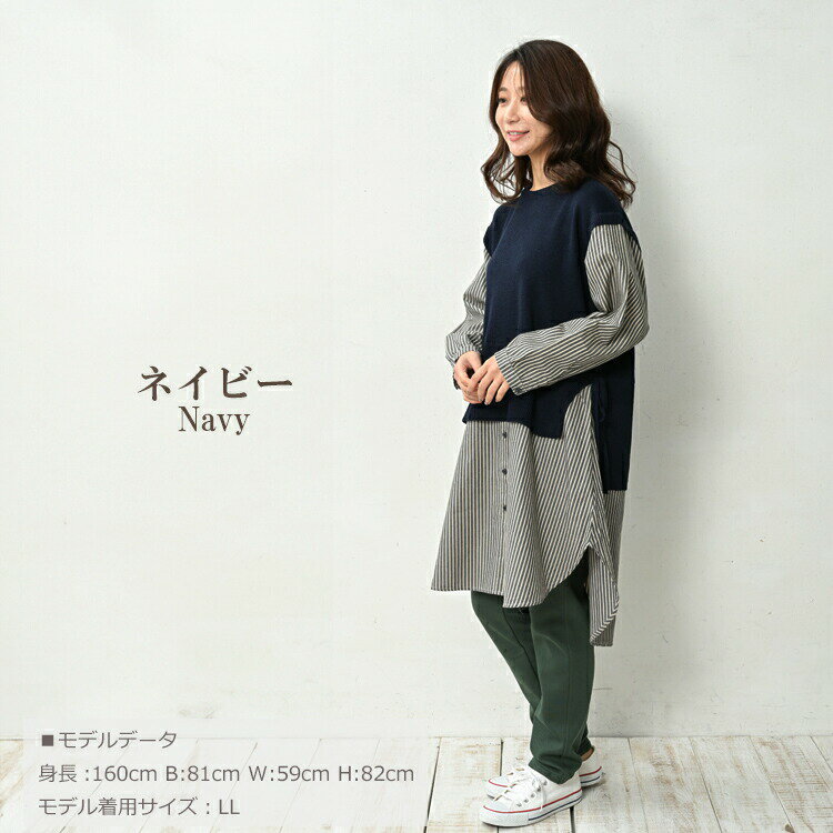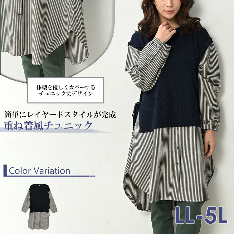 大きいサイズ レディース ベスト重ね着風シャツチュニック 長袖 異素材切り替え カットソー トップス LL/3L/4L/5L ゆったりサイズ ぽっちゃり女子 プラスサイズ