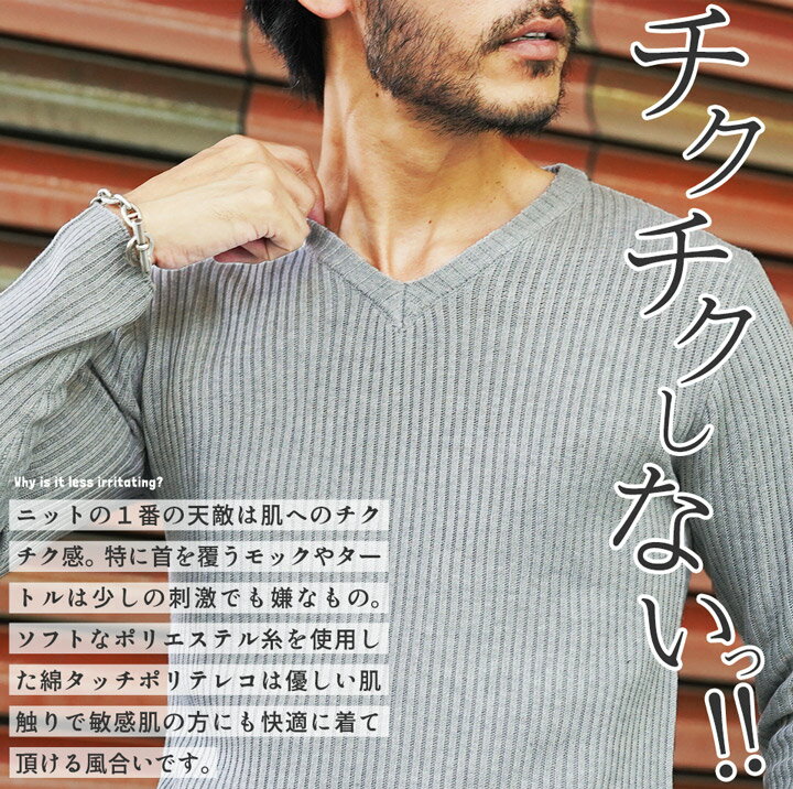 ニット セーター メンズ Vネック モックネック タートルネック◆綿タッチポリテレコニット◆リブ メンズニット リブニット メンズセーター カットソー 厚手 細身 スリム 服 秋服 冬服 春服 秋 冬 春