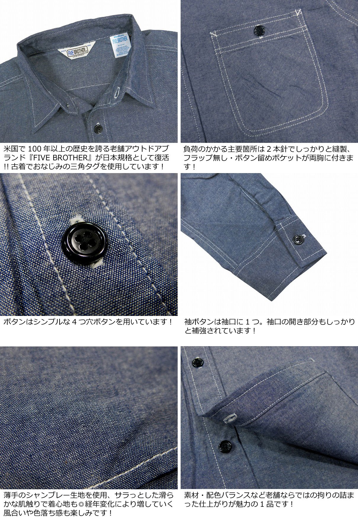 【2024春夏 4色4サイズ】 jh036 新品 FIVE BROTHER シャンブレー 無地 長袖 ワークシャツ 152464S メンズ ファイブブラザー L/S CHAMBREY WORK SHIRTS シャンブレーシャツ 【smtb-kd】