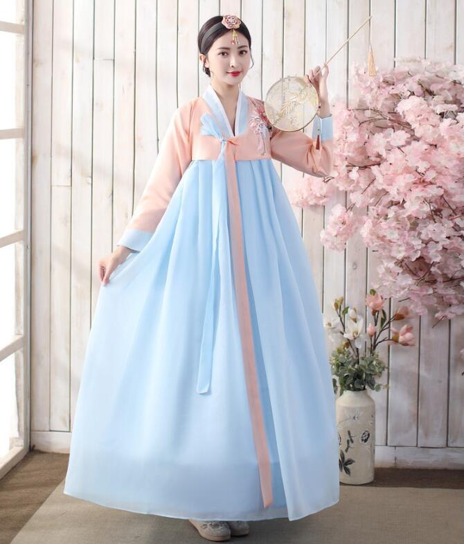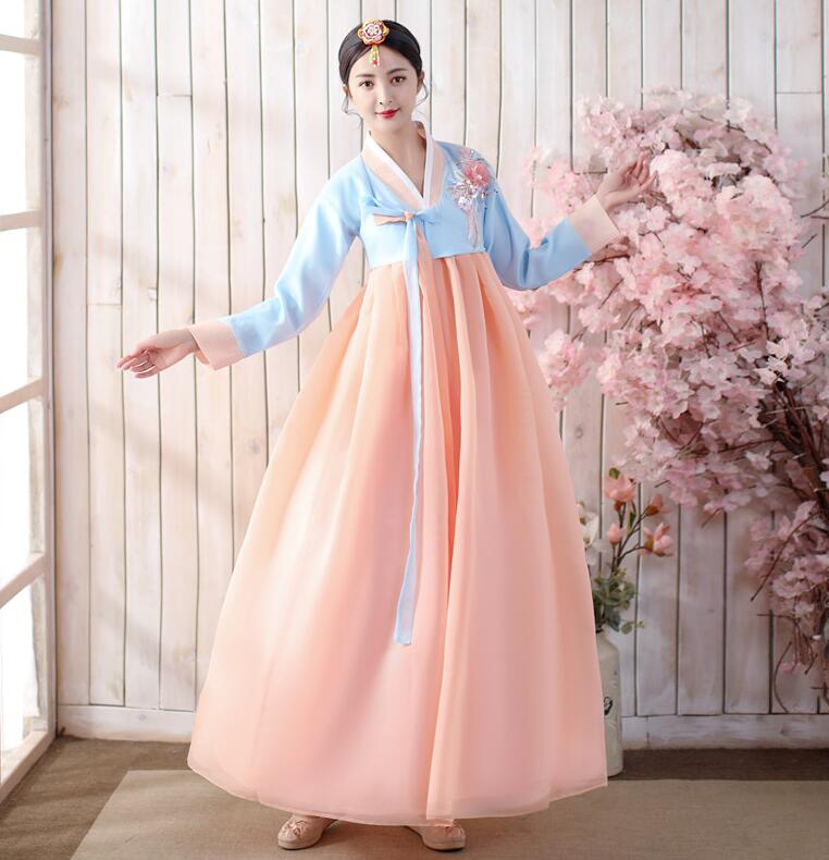 レディース用韓服2点セットアップ 韓国ロングドレス 韓国宮廷風チマチョゴリ 長袖ブラウス ロングワンピース 立体花 チュールフォマール韓国風ウェディングドレス パーティドレス 朝鮮族民族ダンス衣装 韓流舞台ステージ衣装 コスプレ衣装
