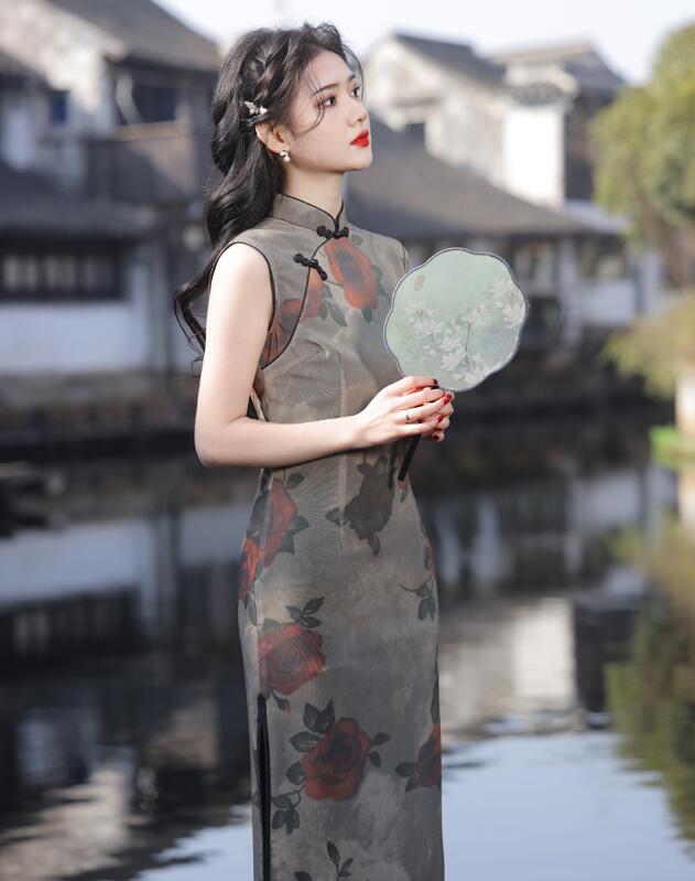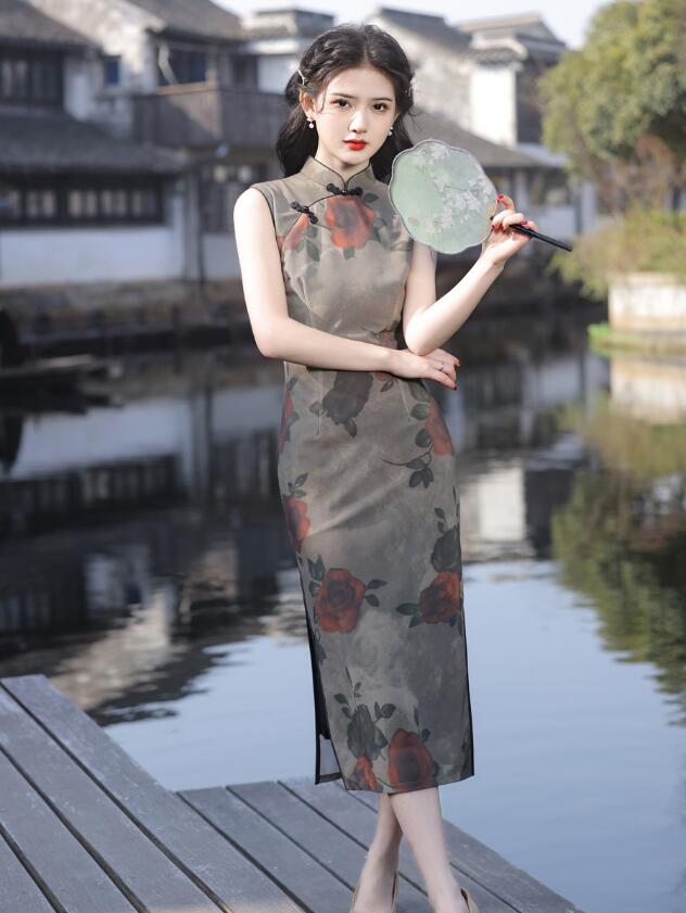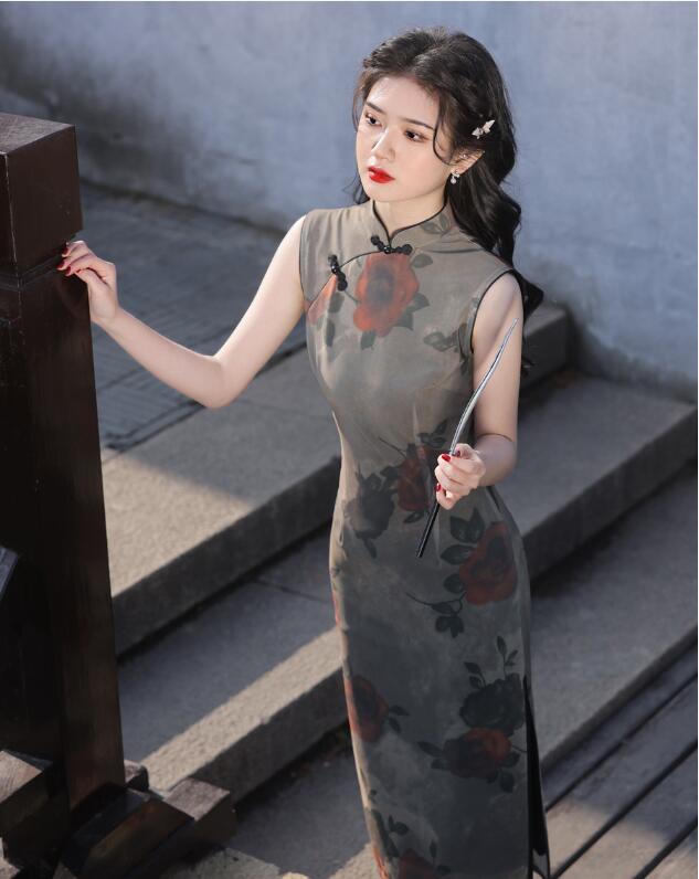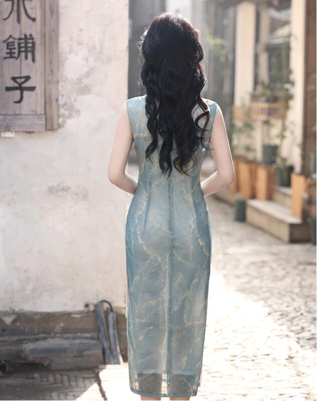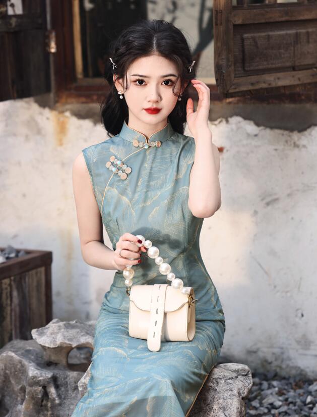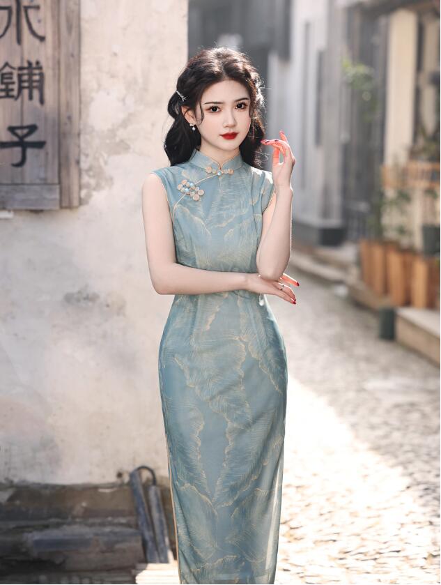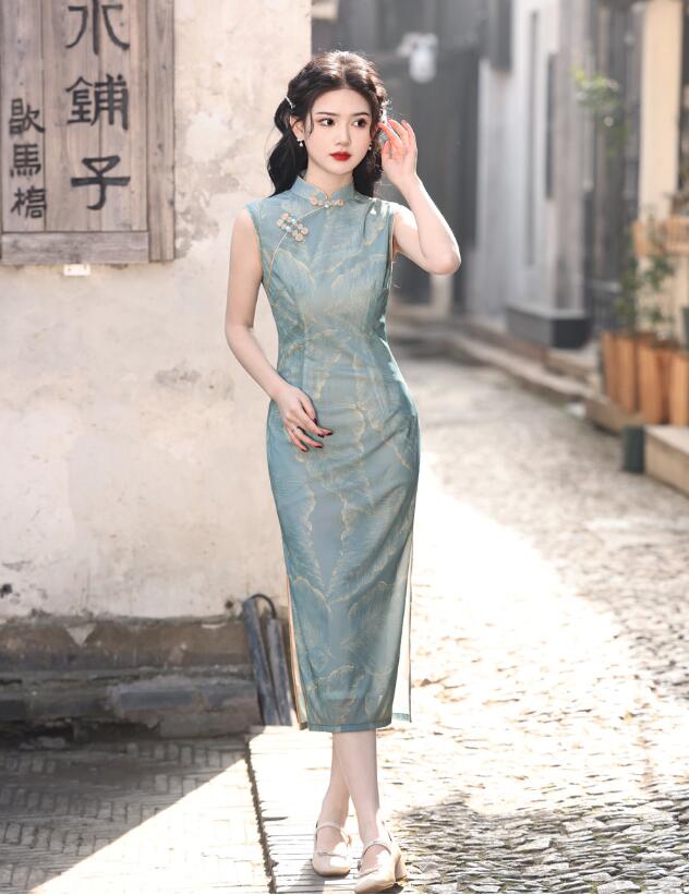 ロング丈 チャイナドレス 袖なし花柄 チャイナ ドレス 中華ドレス 中国風 パーティー 二次会 演奏会 発表会 ロング ドレス 華流 チャイナ服 時代感溢れ コスチューム 二胡 箏 古典 演奏会 ドレス レディース 大人 20代 30代 緑 ブルー S M L XL 2XL