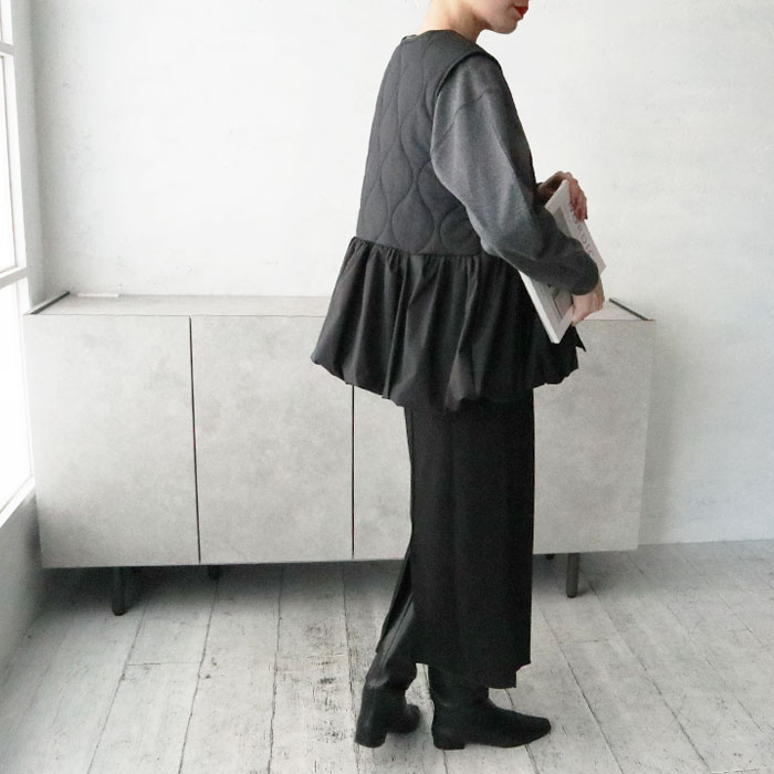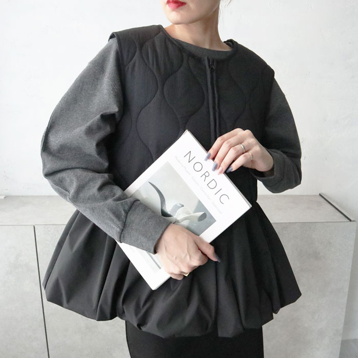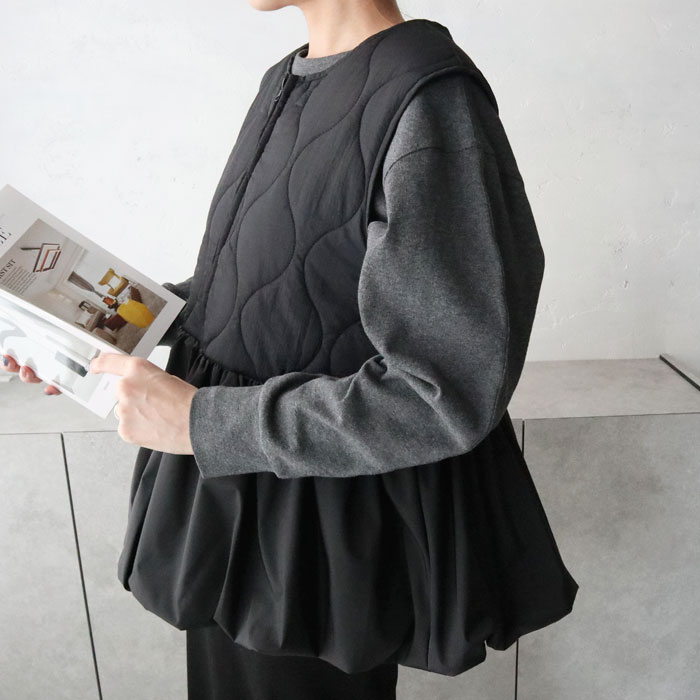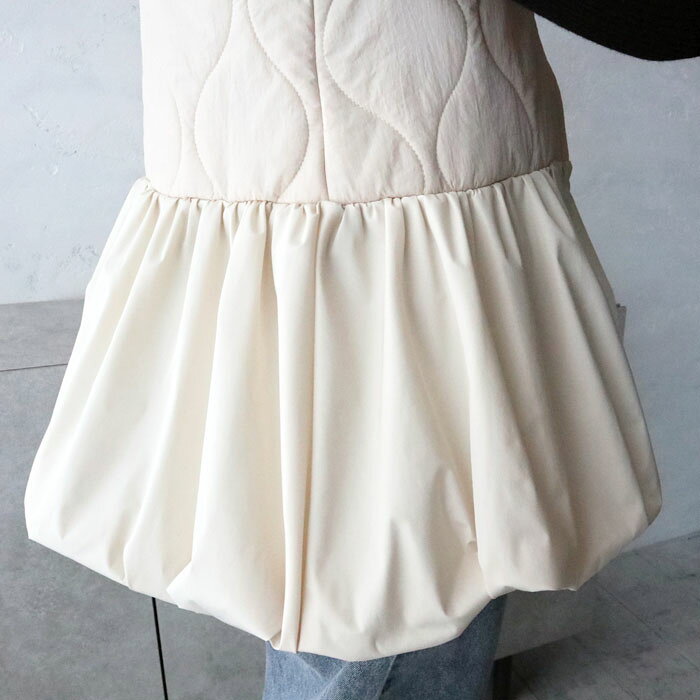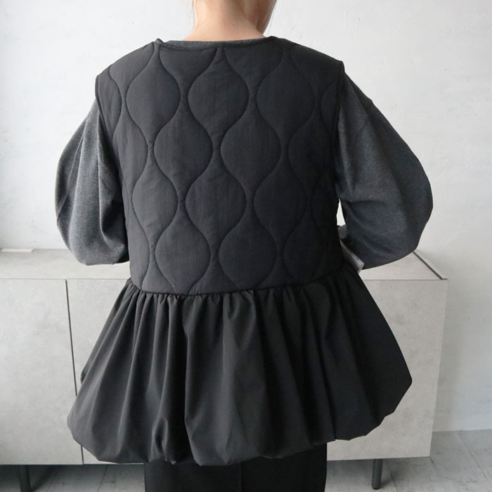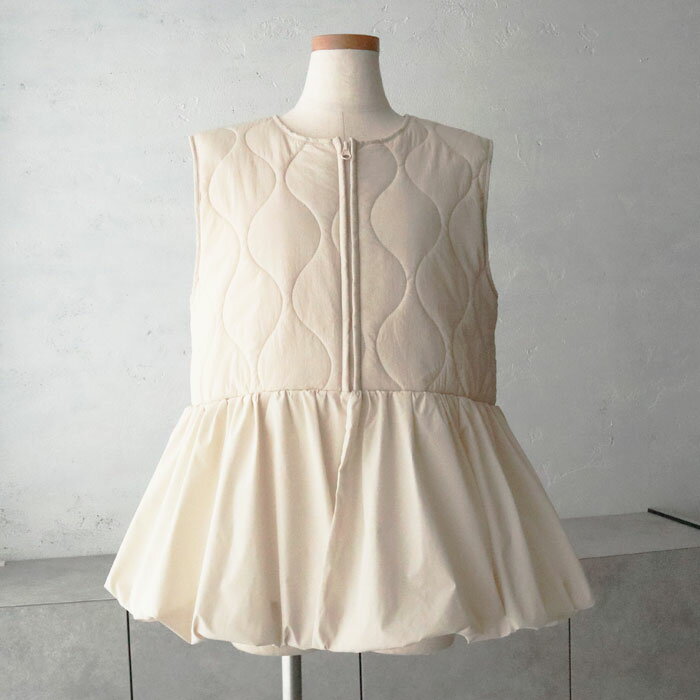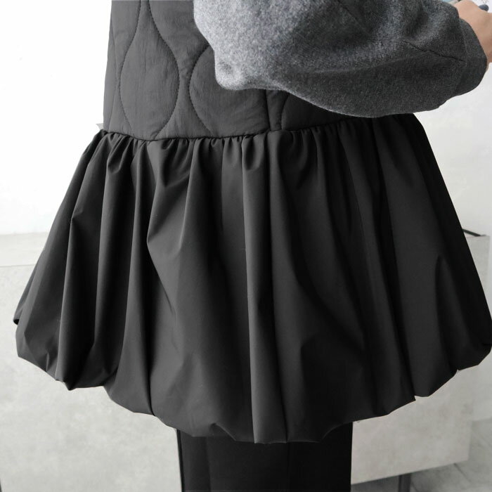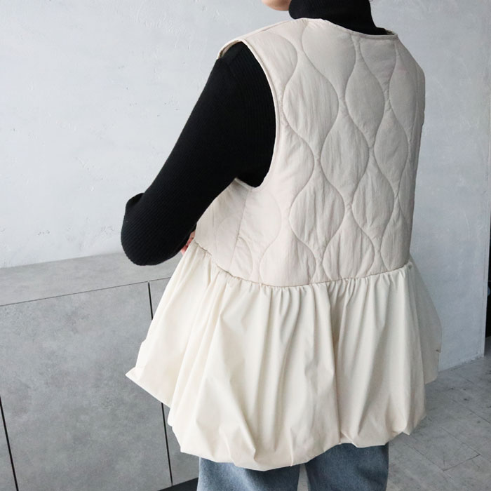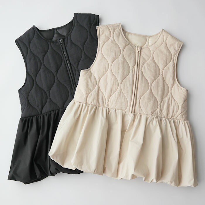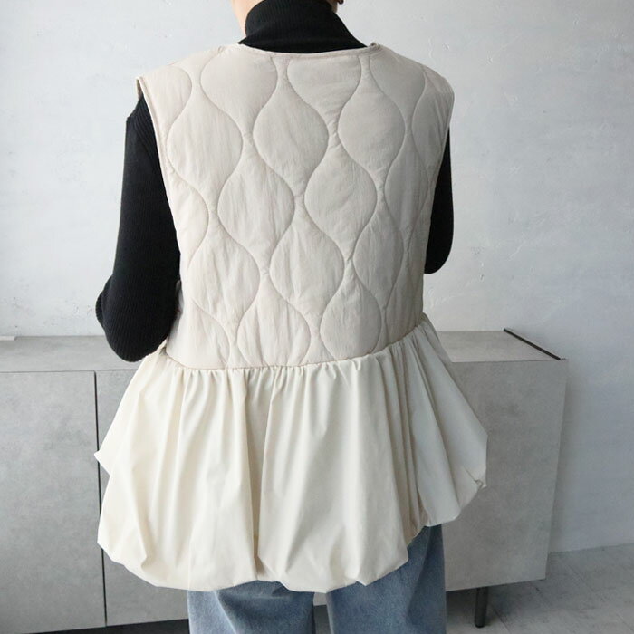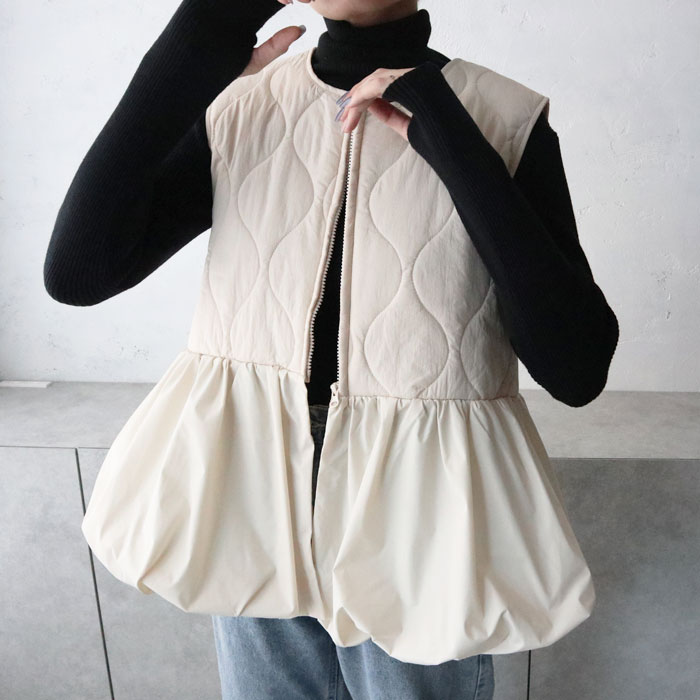 キルティングペプラム切替ベスト/ジレ/キルティング/ジップ/ドッキング/切替デザイン/異素材/中綿/秋冬アウター/カジュアル/大人カジュアル/きれいめ/シンプル/フェミニン/プラスワン/アイボリー/ブラック