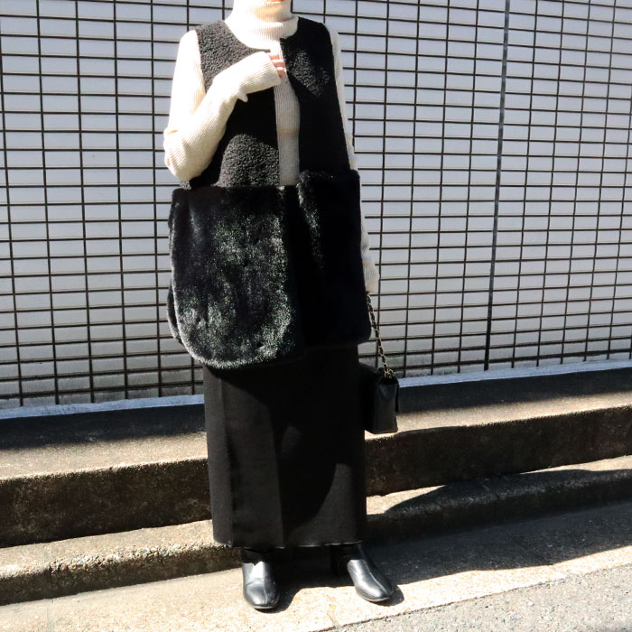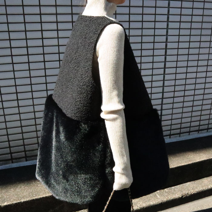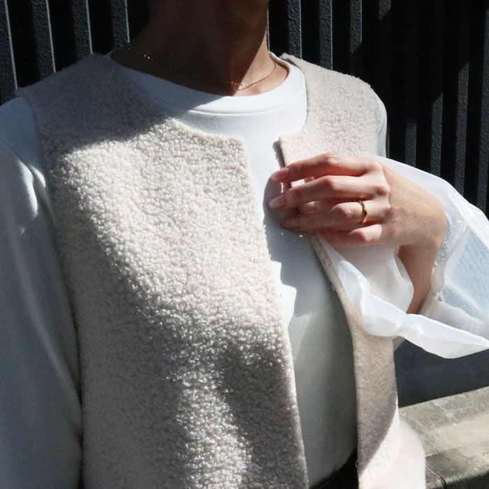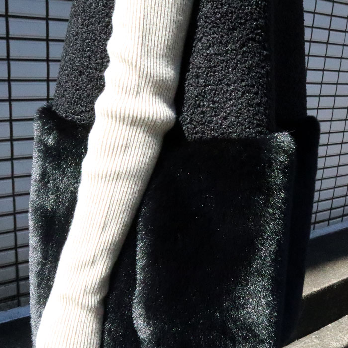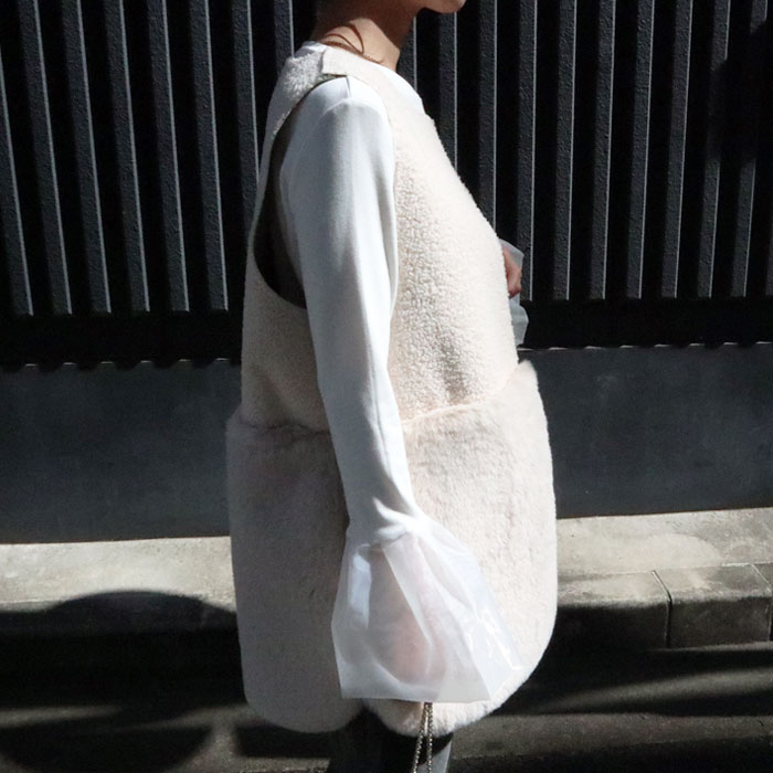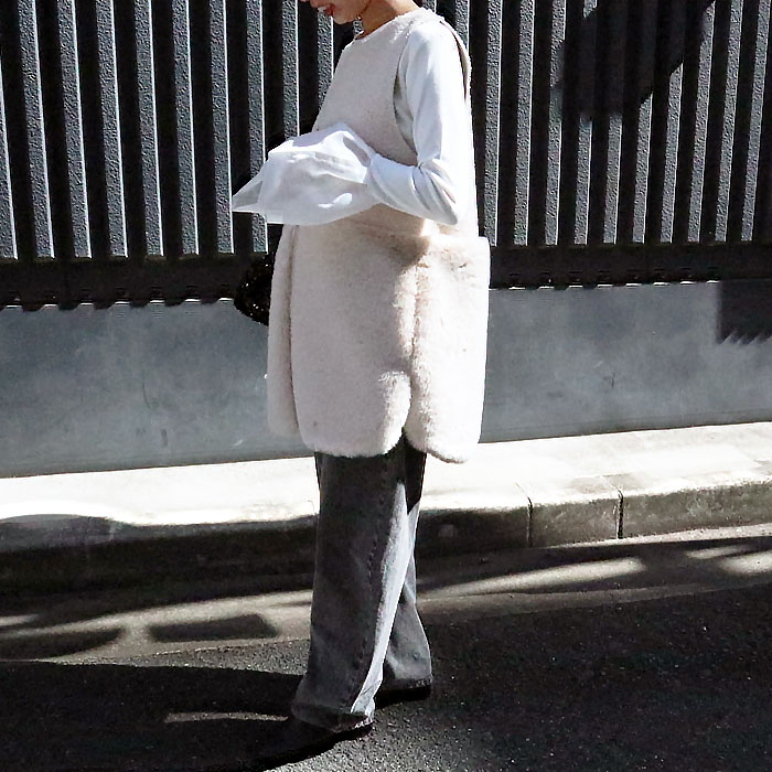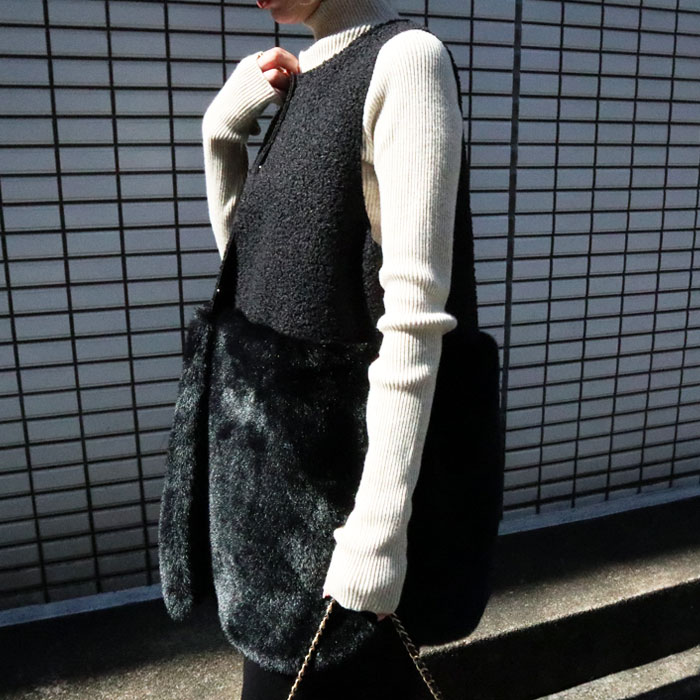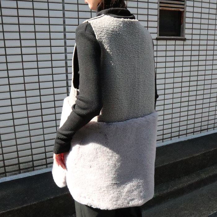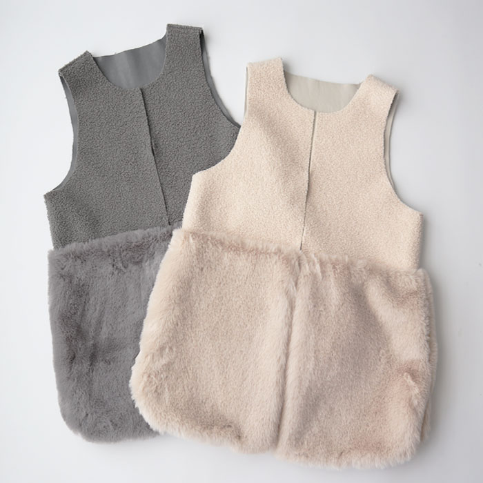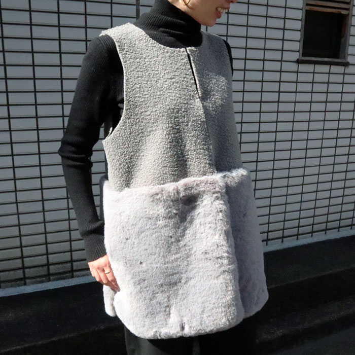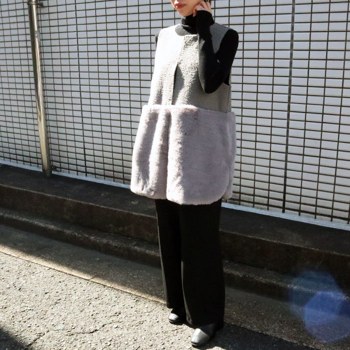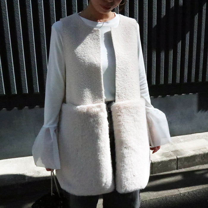 ボア×フェイクファー異素材コンビベスト/ジレ/ジレコート/エコファー/フェイクファー/ファーlook/ドッキング/切替デザイン/異素材/秋冬アウター/ミドルベスト/ロングベスト/カジュアル/大人カジュアル/きれいめ/プラスワン/アイボリー/グレー/ブラック