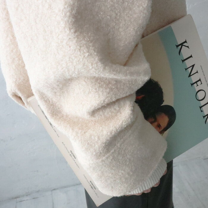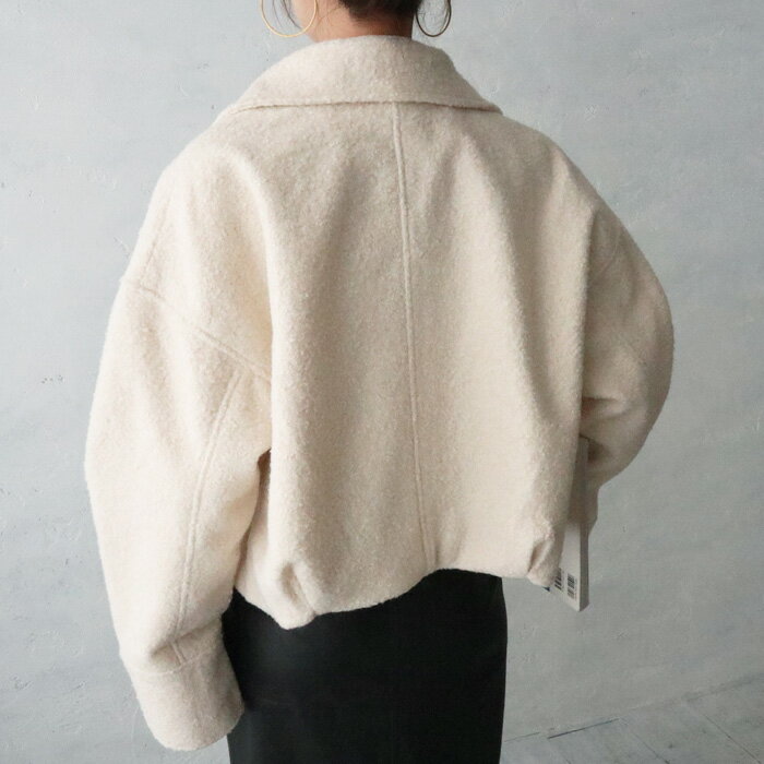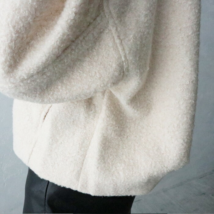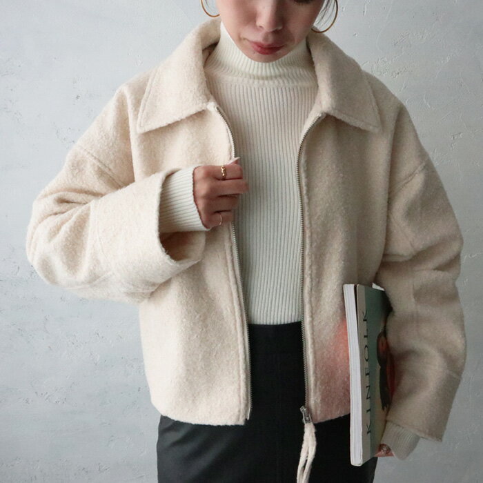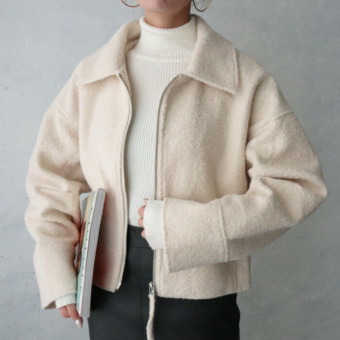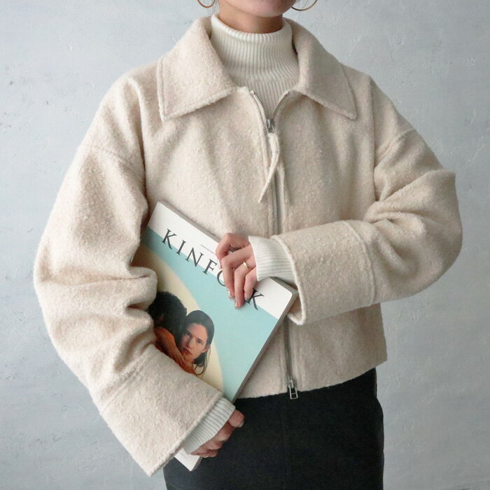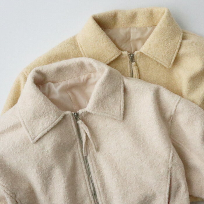 ダブルジップブークレショートブルゾン/ブークレ/ブルゾン/ジャケット/ショート丈/クロップド丈/アウター/圧縮/あったかアイテム/立体感/ドロップショルダー/カジュアル/コクーンスリーブ/ダブルジップ/ジップ/ファスナー/起毛/アイボリー/イエロー