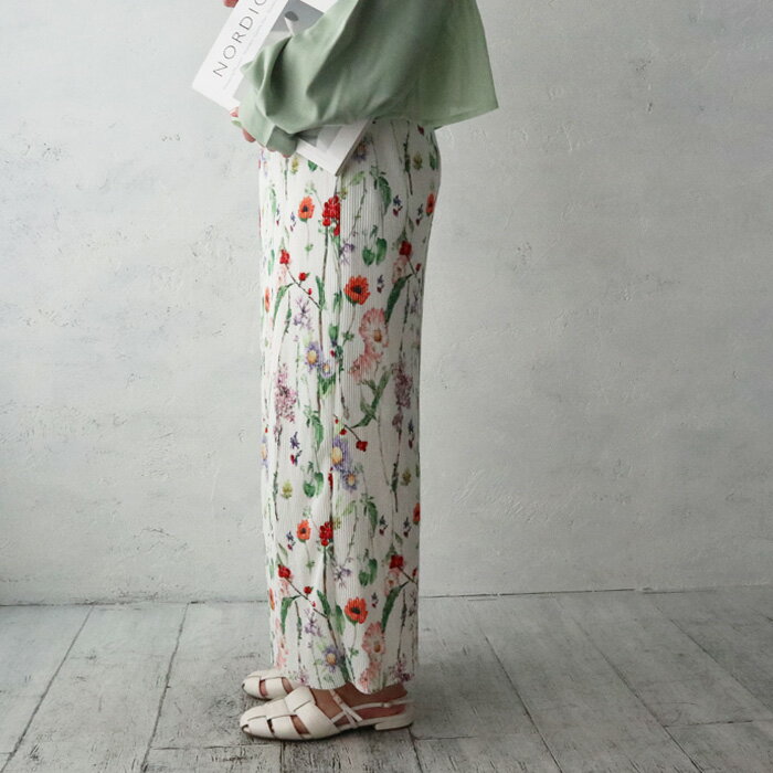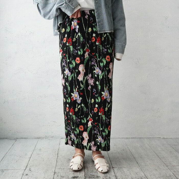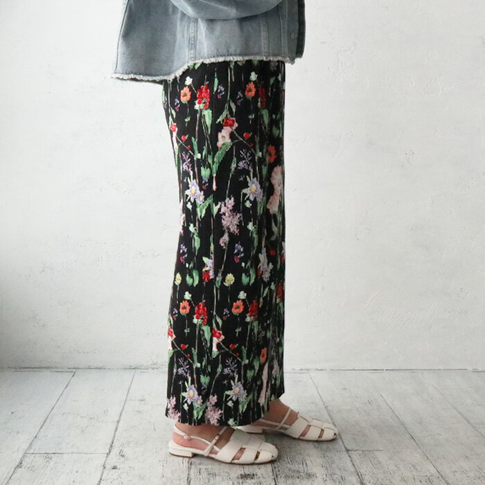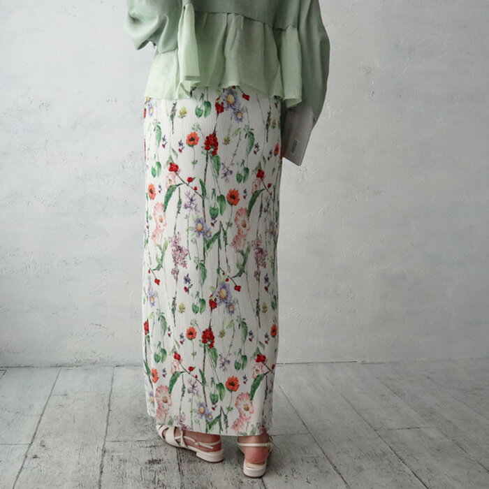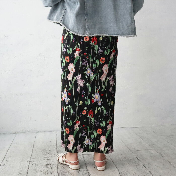 ボタニカルフラワープリーツタイトスカート/セルフカットOK/ペンシルスカート/プリーツ/Iライン/花柄/柔らか/伸縮性/リブ/オンオフ/ボトム/スカート/カジュアル/きれいめ/大人カジュアル/着回し/ホワイト/ブラック