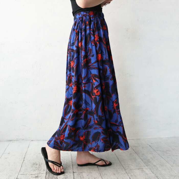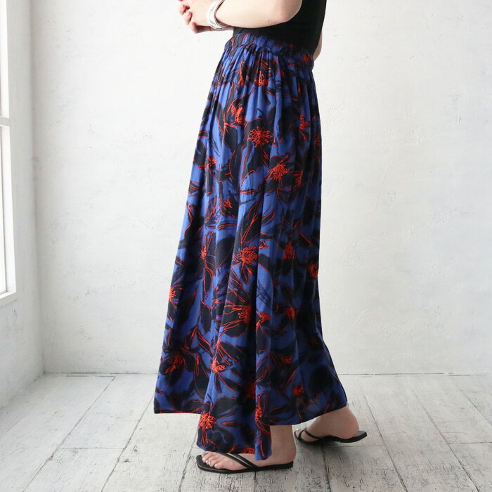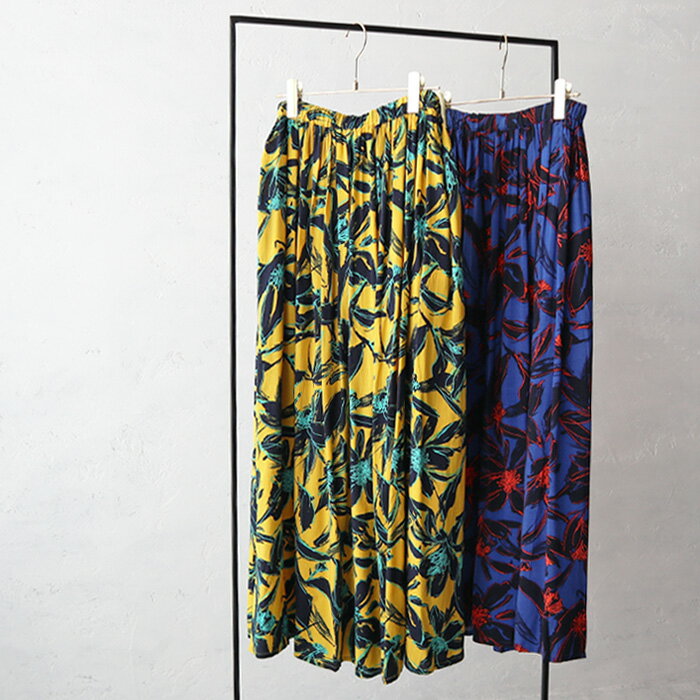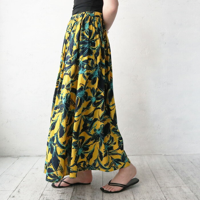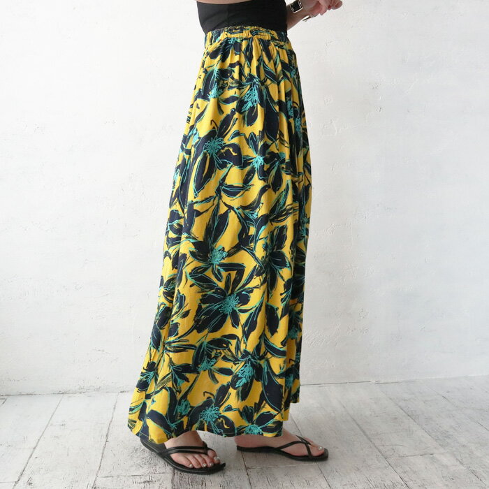 【6月下旬】ボタニカルフラワーフレアマキシスカート/スカート/カジュアル/ロング丈/オンオフ/フレア/ウエストゴム/ウエストリボン/エスニック/総柄/花柄/ヴィンテージ/軽やか/映えボトム/レトロ/スカーフ柄/ブルー/イエロー