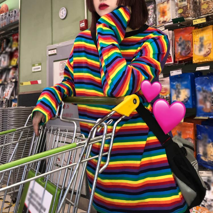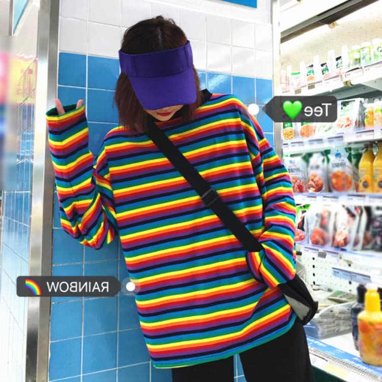 レインボー Tシャツ 送料無料 オーバーサイズ ロンT 長袖 マルチボーダー柄 カラフル ゆったり 韓国ファッション カットソー トップス 衣装 ヒップホップ コスチューム 送料無料 大きいサイズ 個性的 服