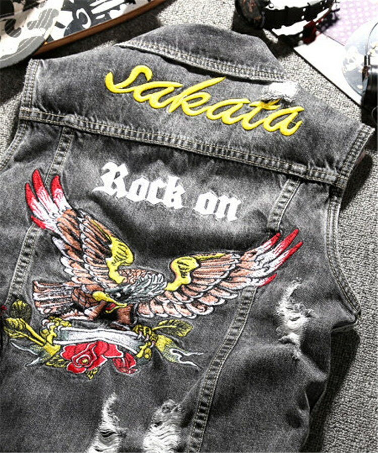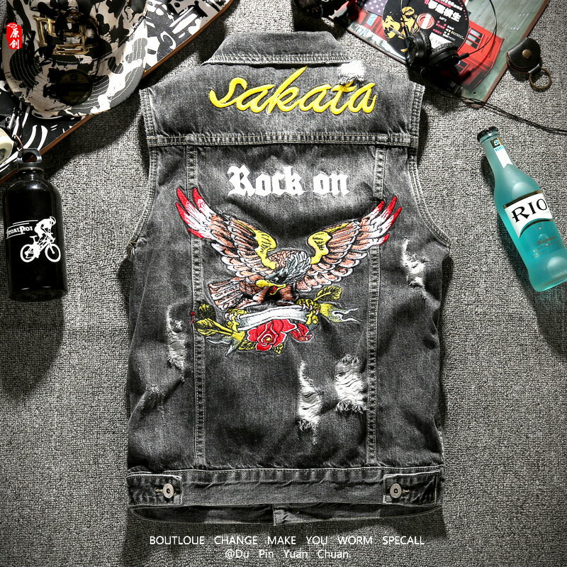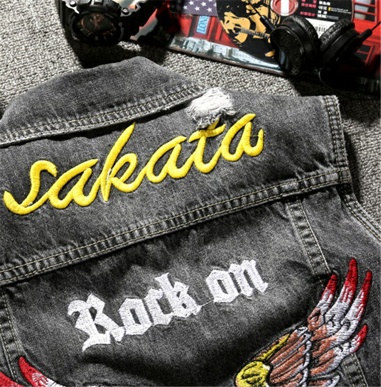 メンズデニムベスト Gジャン ノースリーブ アメカジ バック刺繍 イングランド風 カジュアルストリート系 ファッション 原宿系 グレー