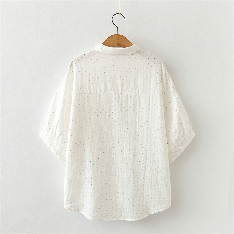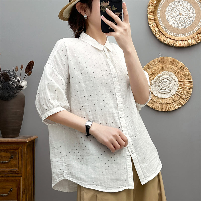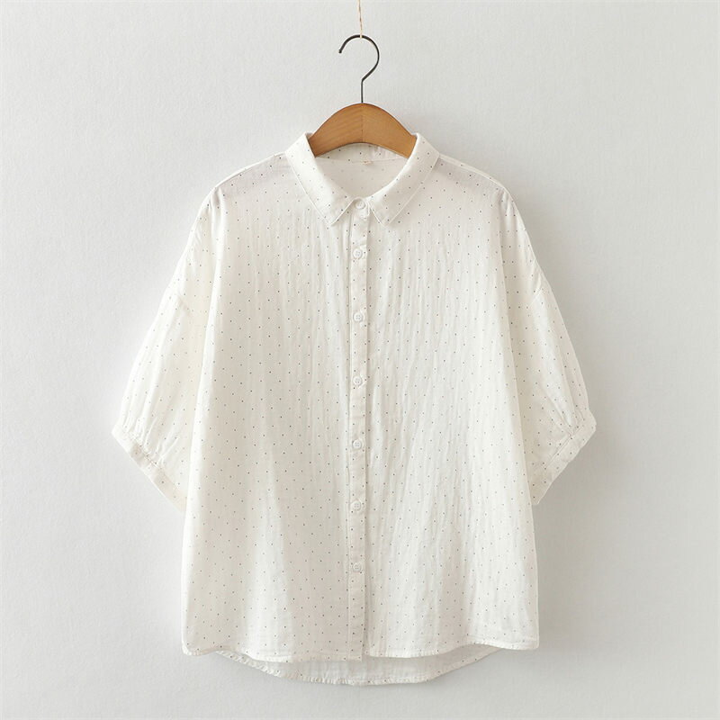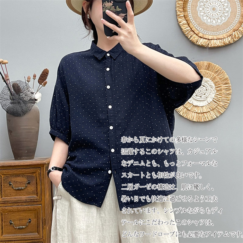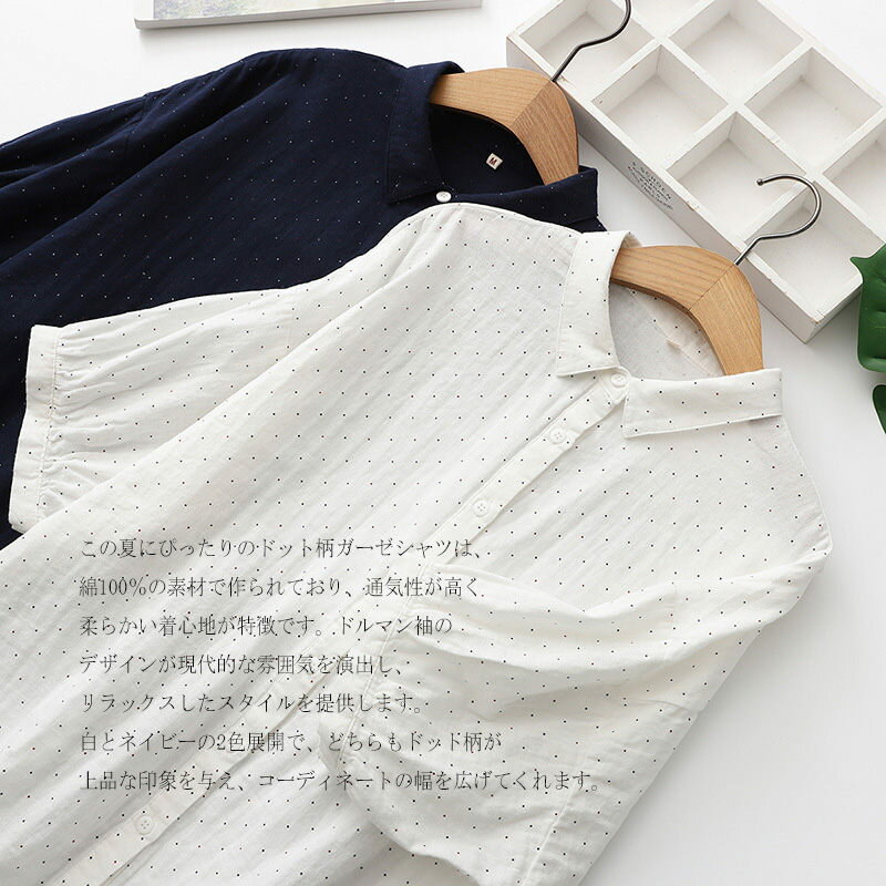 ドルマン袖 シャツ チュニック ブラウス 綿100 ガーゼシャツ 大きいサイズ 半袖 夏 コットン 白シャツ ドット柄 シャツブラウス 7分袖 ゆったり 春 夏シャツ ホワイトシャツ 体型カバー シンプル 通気性 前開け 吸湿 速乾