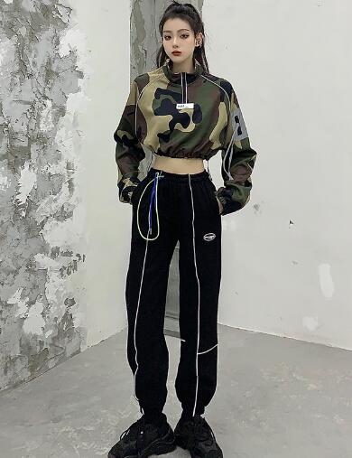 迷彩 ミリタリー ショート丈 短い 短め 絞り トレーナー パーカー トップス 長袖 大きいサイズ ビッグ ゆったり ダンス 衣装 ヒップホップ HIPHOP レディース ガールズ ストリート 個性的 韓国ファッション