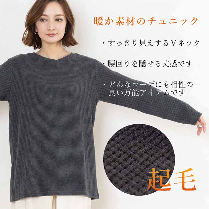 チュニック レディース 起毛素材 長袖 Vネック トップス 日本製 着後レビューでクーポン☆ あったか 暖かい やわらかい グレー 秋 冬 ギフト プレゼント