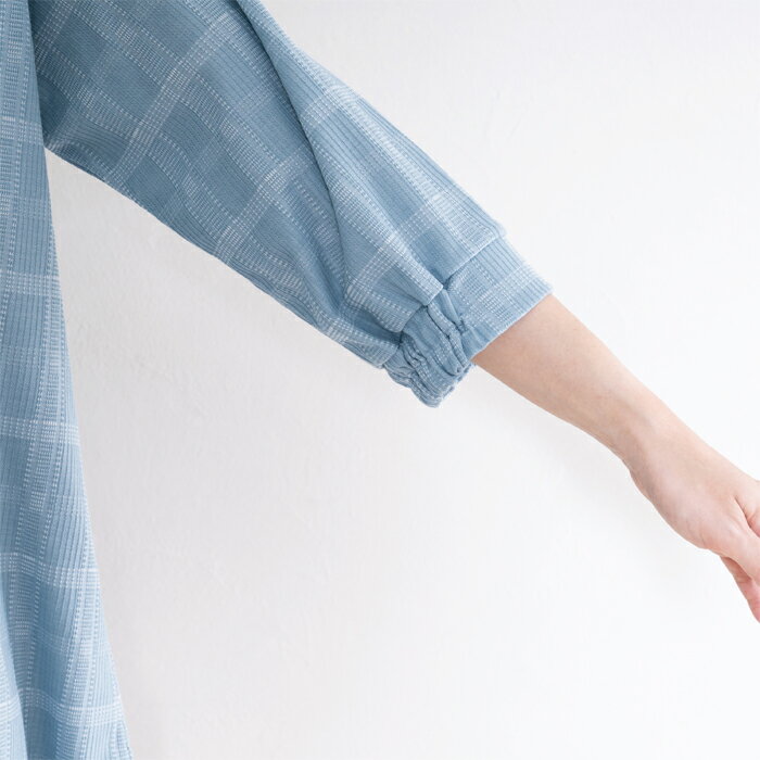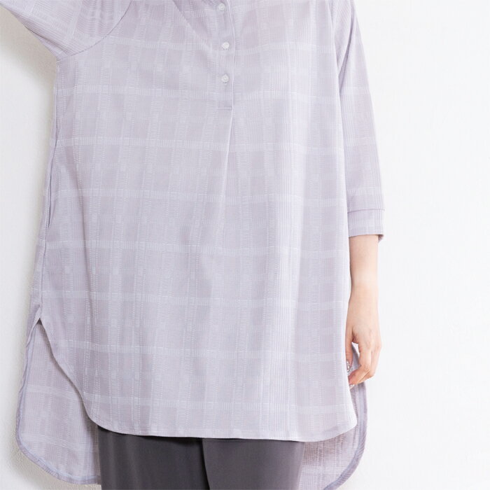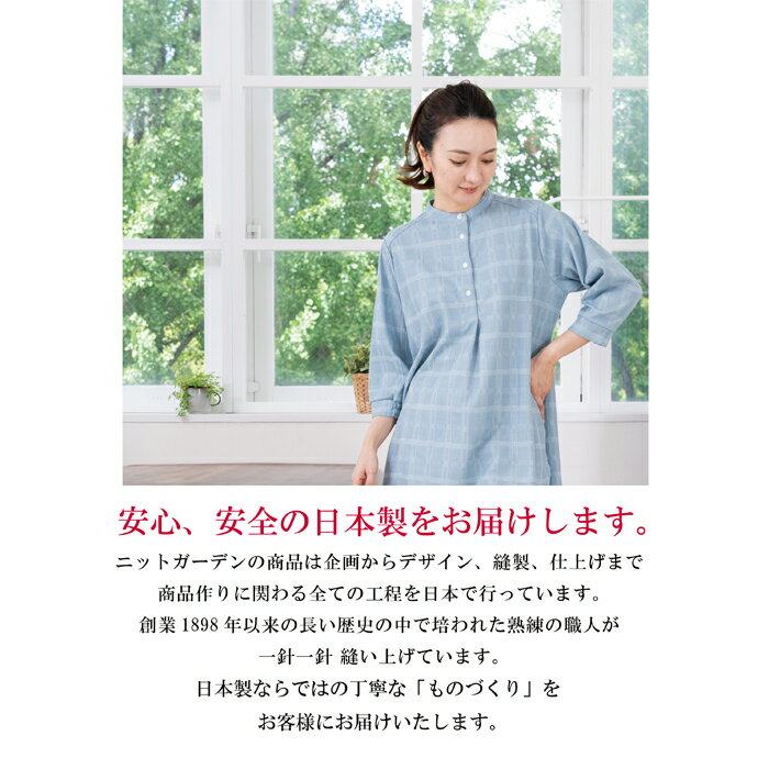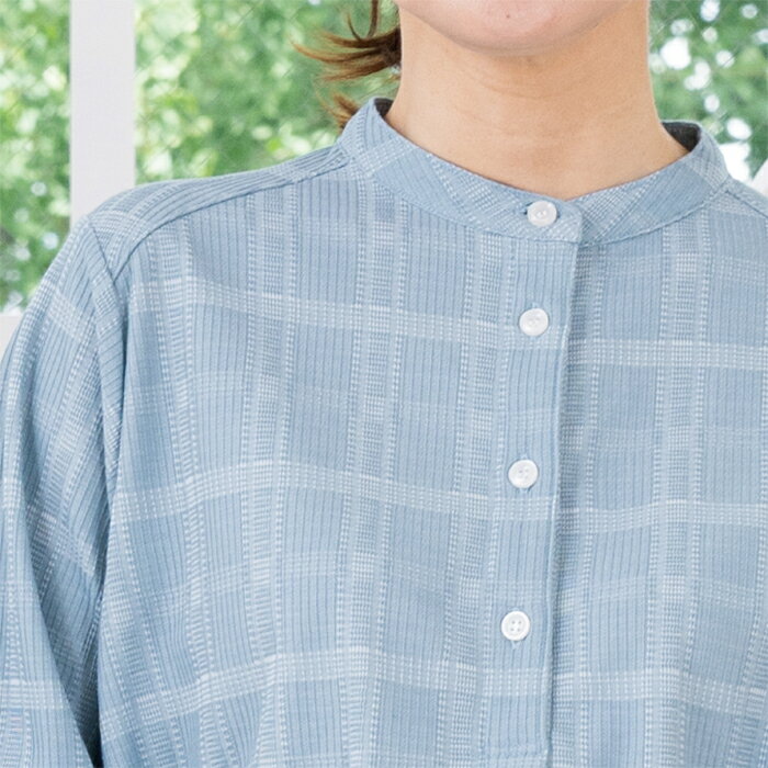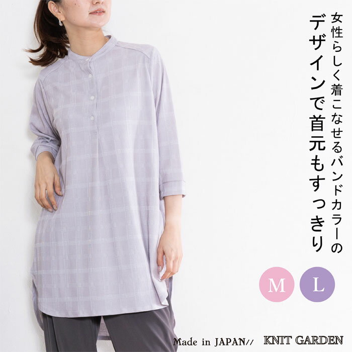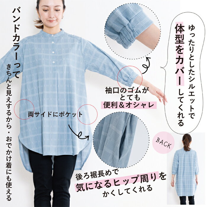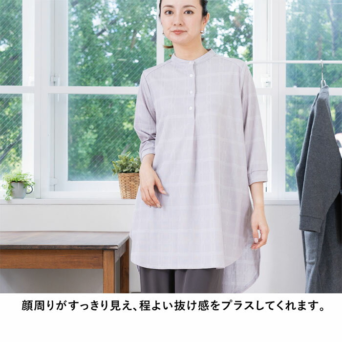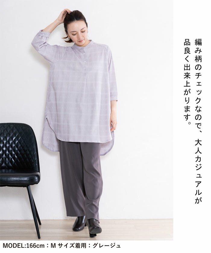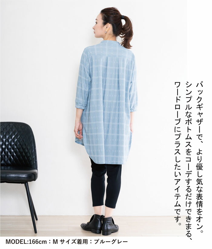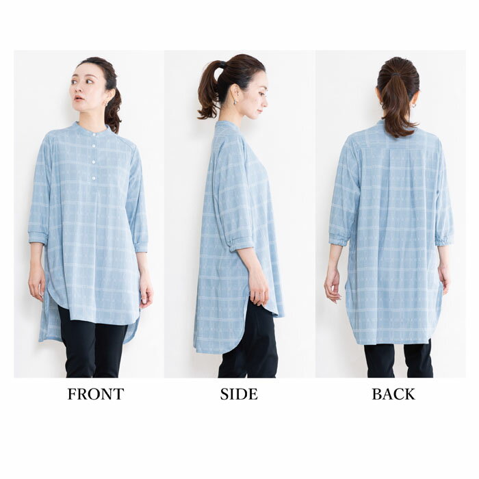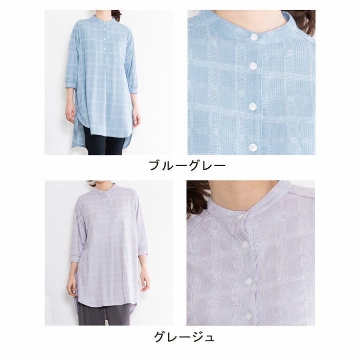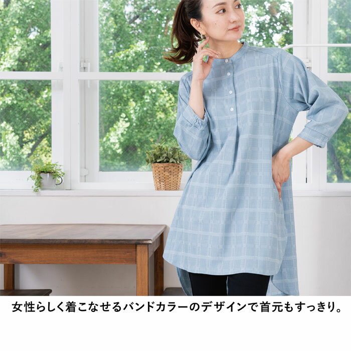 チュニック レディース チェック 七分袖 バンドカラー ゆったり 日本製 ブルー 青 グレージュ 春 夏 秋 ギフト プレゼント