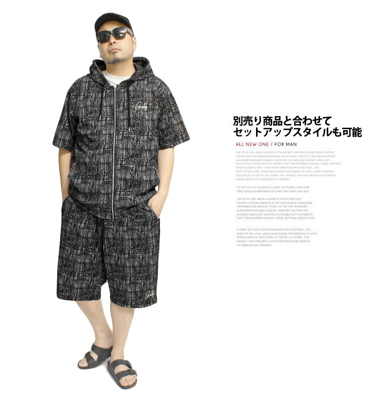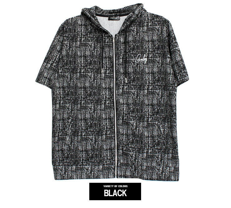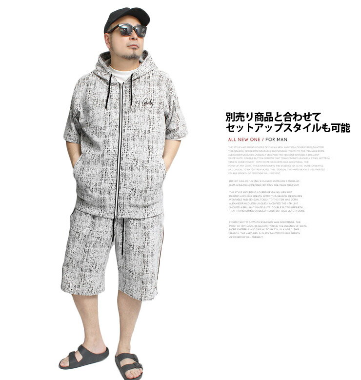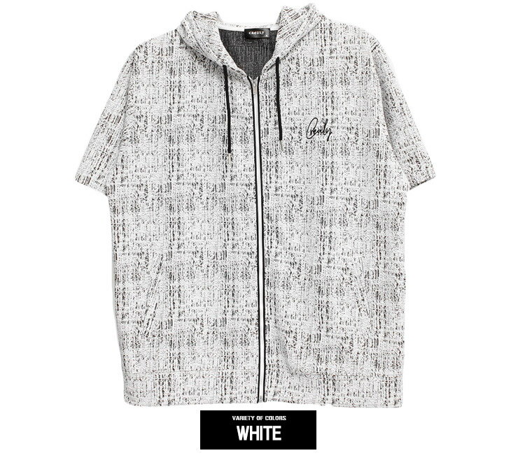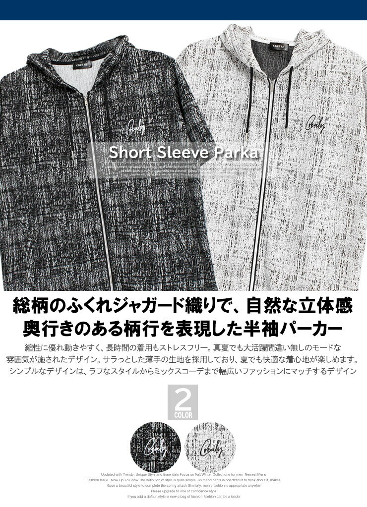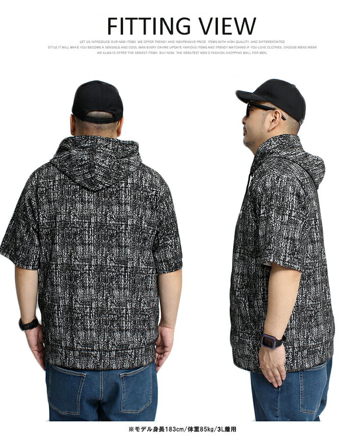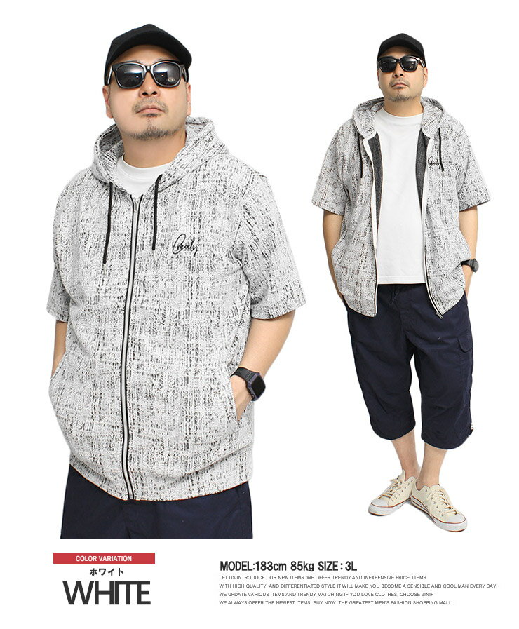 【送料無料】 半袖 パーカー メンズ 大きいサイズ 総柄 接結 ふくれ ジャガード ロゴ 刺繍 プリント ジップアップ Tシャツ ブルゾン ジャケット アウター トップス 薄手 白 黒 ホワイト ブラック ストレッチ ストリート系 ワークマン プラス サイズ ライトアウター